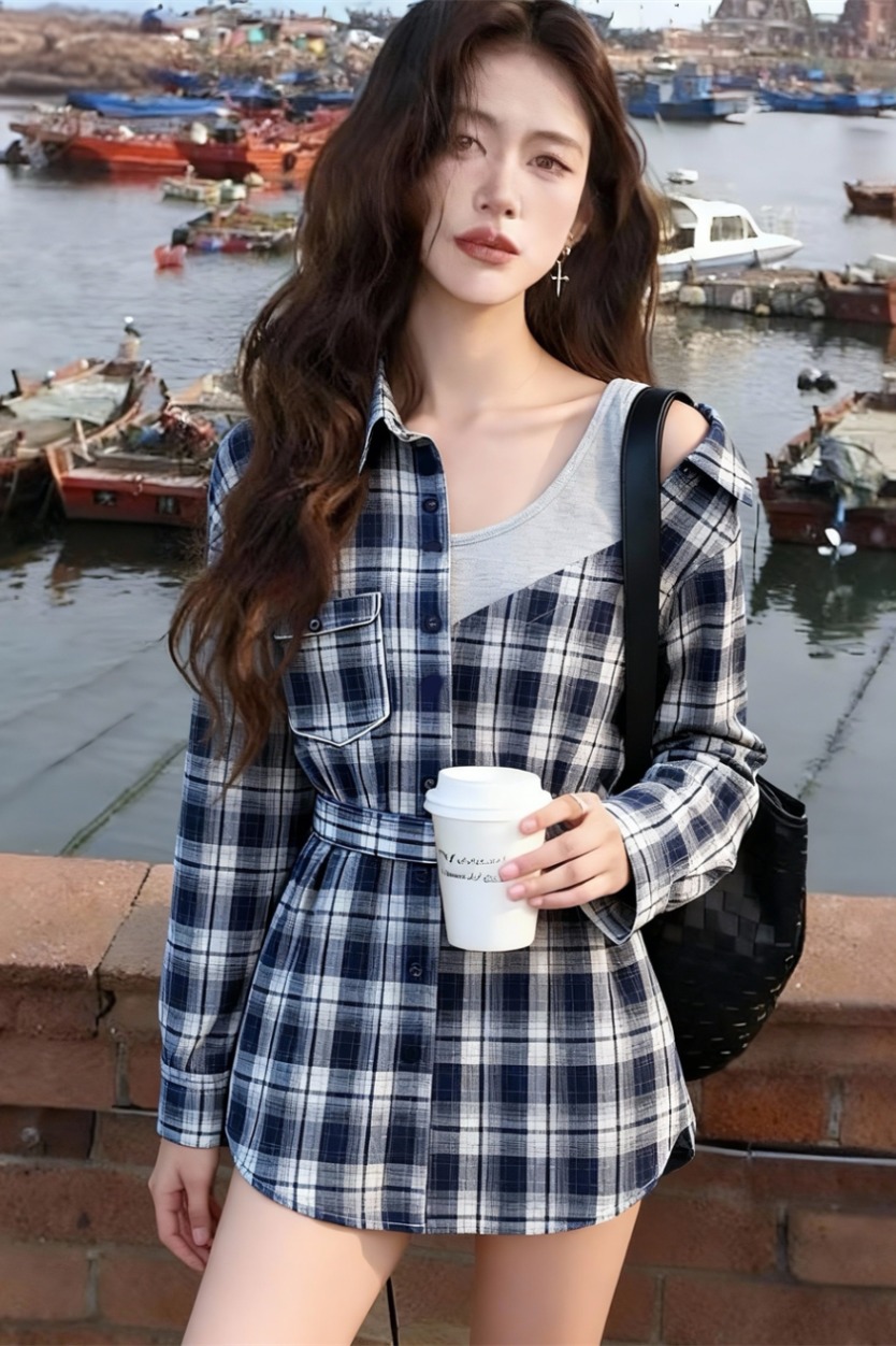 FA45093# 秋季新款复古气质拼接假两件格子长袖衬衫休闲上衣 服裝批發女裝批發服飾貨源