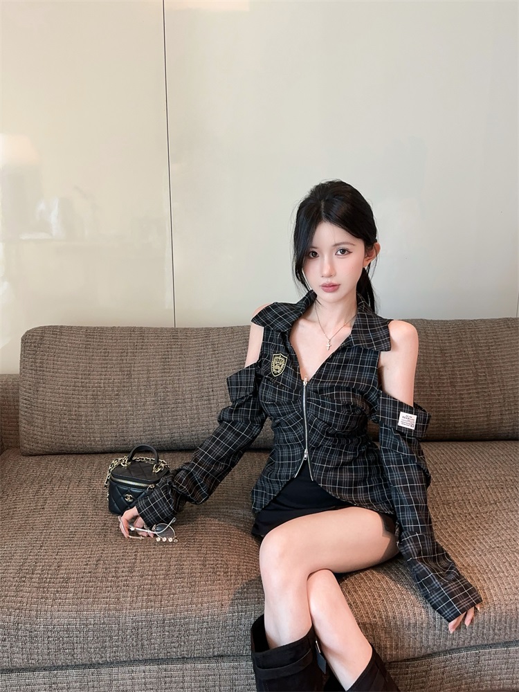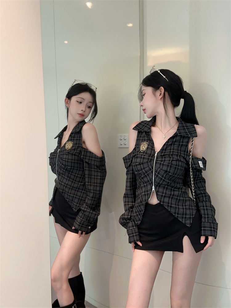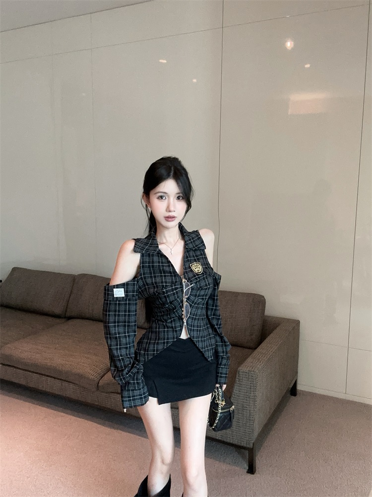 FA45097# 学院风Polo领格子衬衫女设计感小众秋季露肩上衣巨好看的衬衣 服裝批發女裝批發服飾貨源