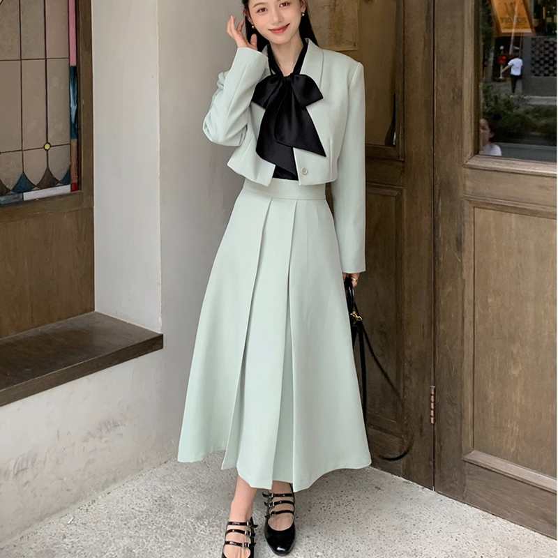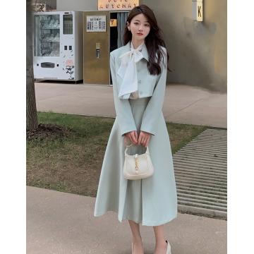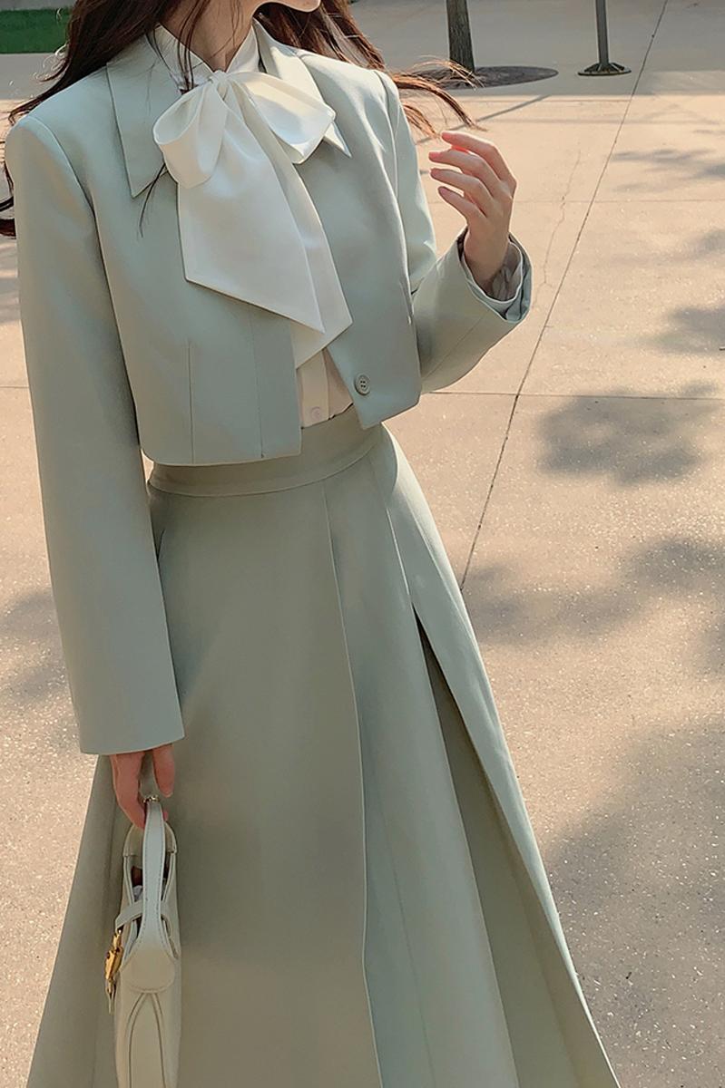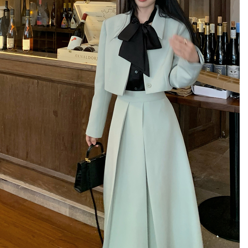 FA45145# 秋季新款小个子绿色高腰修身短款长袖外套半身裙两件套 服裝批發女裝批發服飾貨源