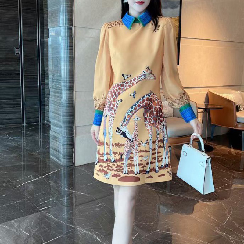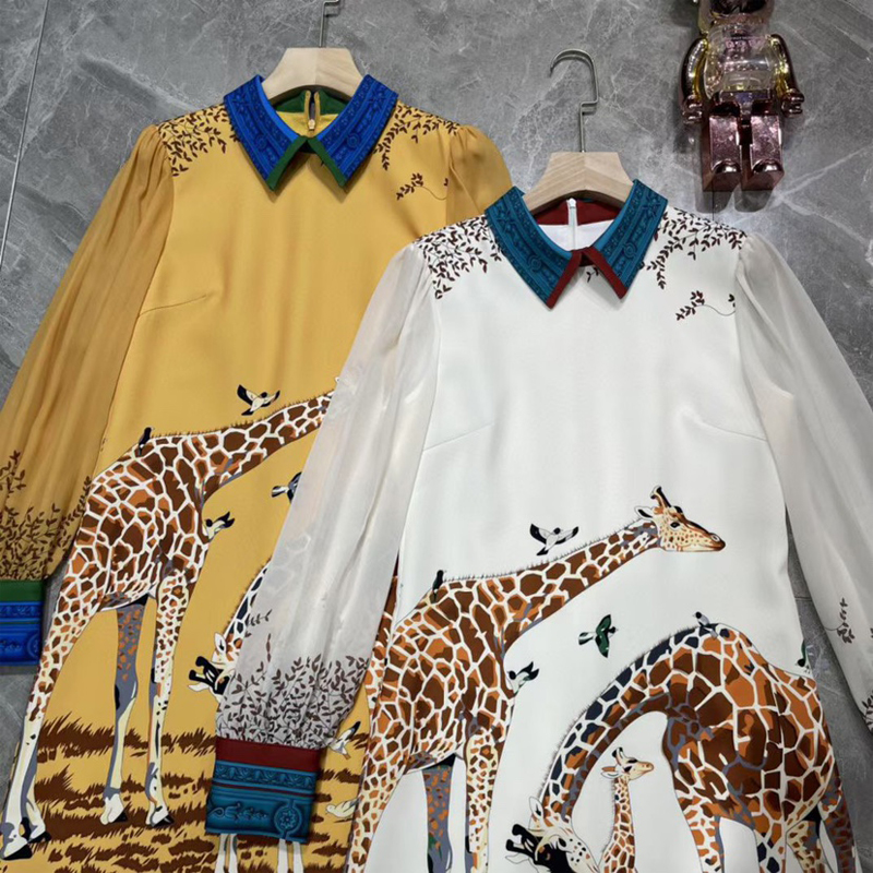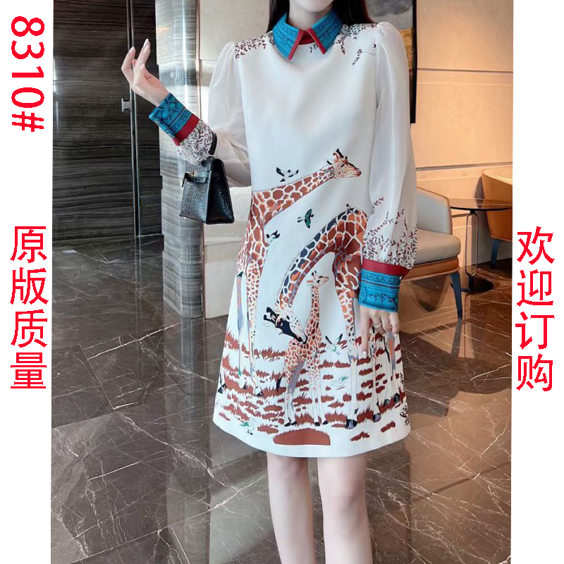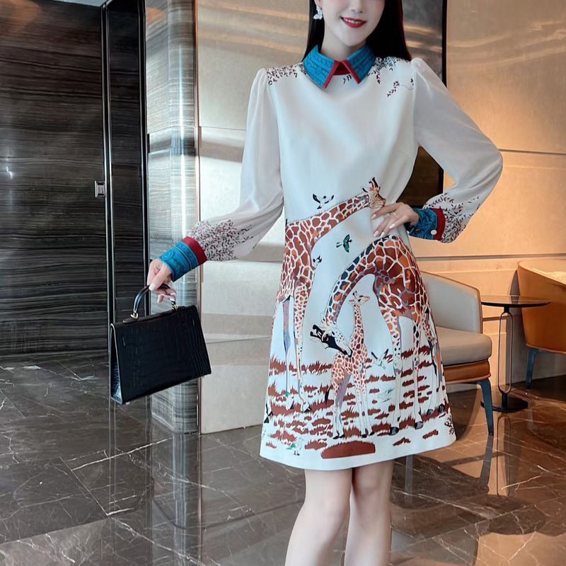 FA45150# 数码印花定位连衣裙秋季新款气质小鹿定位印花透明长袖A字裙 服裝批發女裝批發服飾貨源