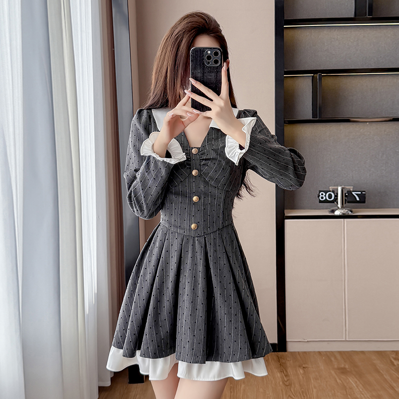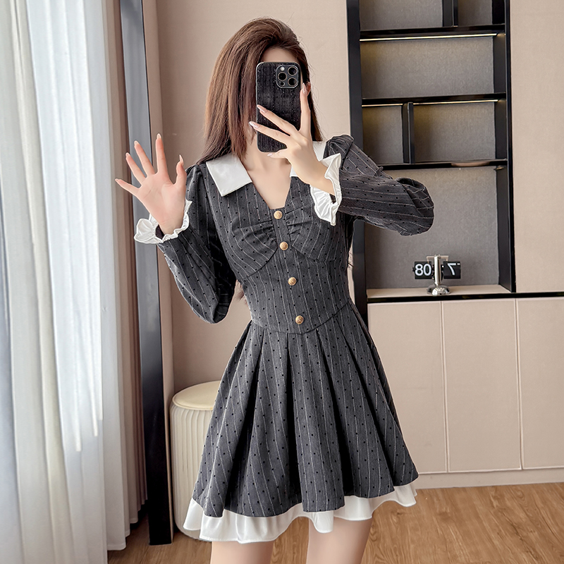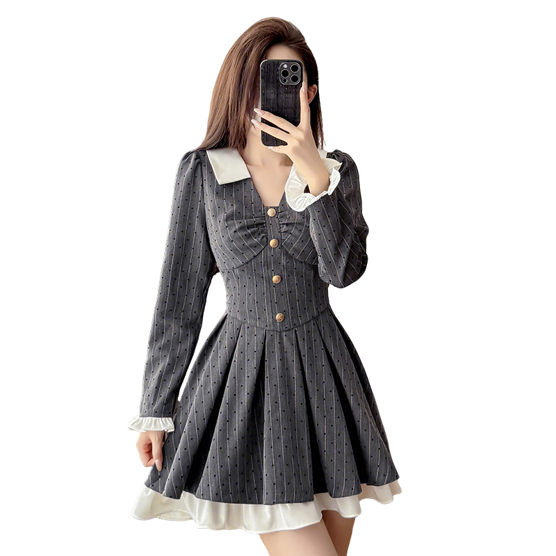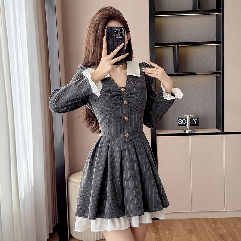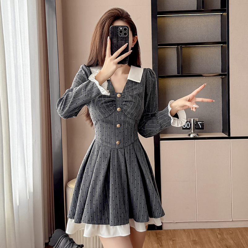 FA45152# 系穿搭法式灰色v领波点连衣裙秋季小香风收腰学院风a字短裙 服裝批發女裝批發服飾貨源