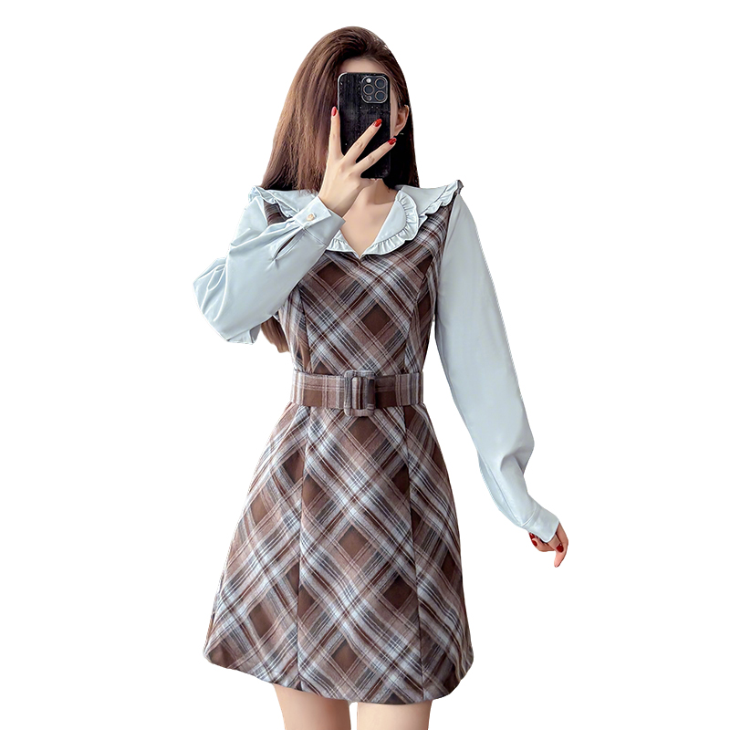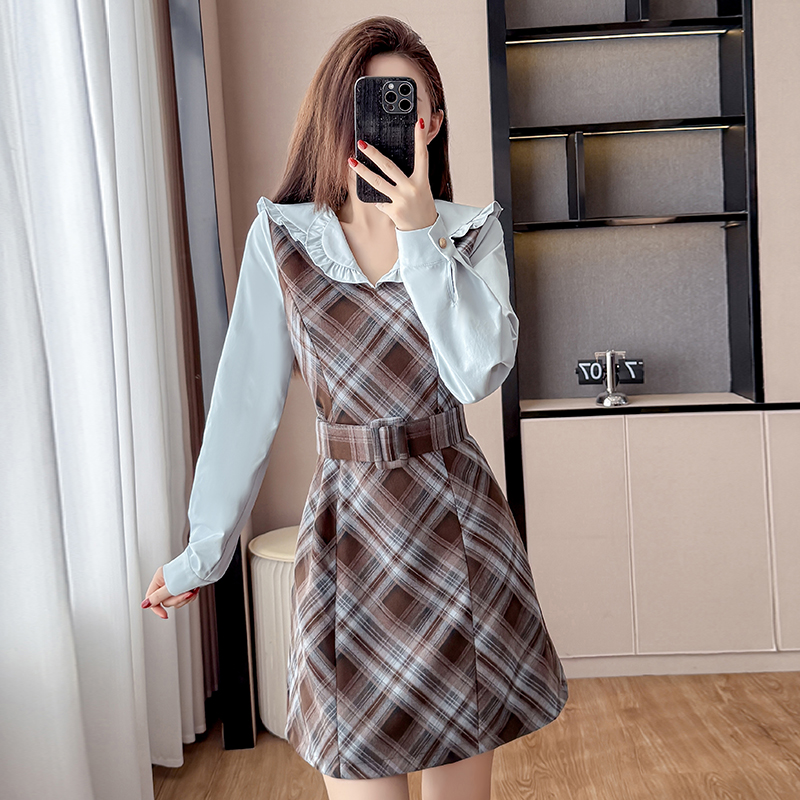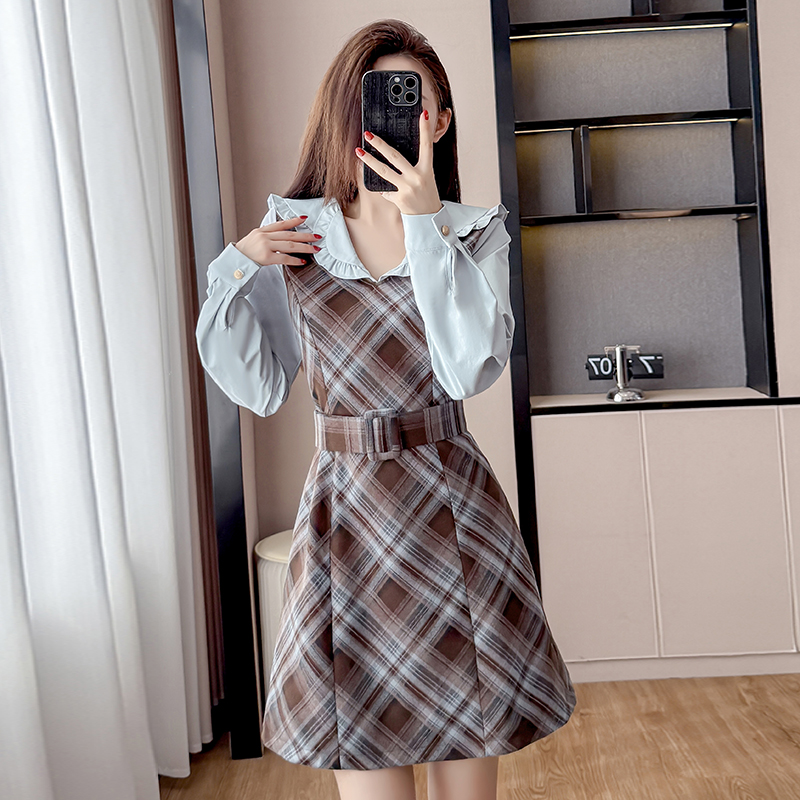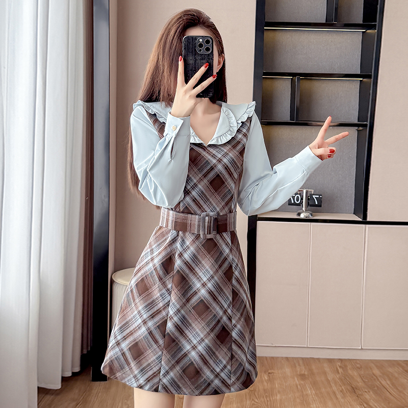 FA45156# 法式假两件v领格子连衣裙女秋冬高级感拼接打底a字裙子 服裝批發女裝批發服飾貨源