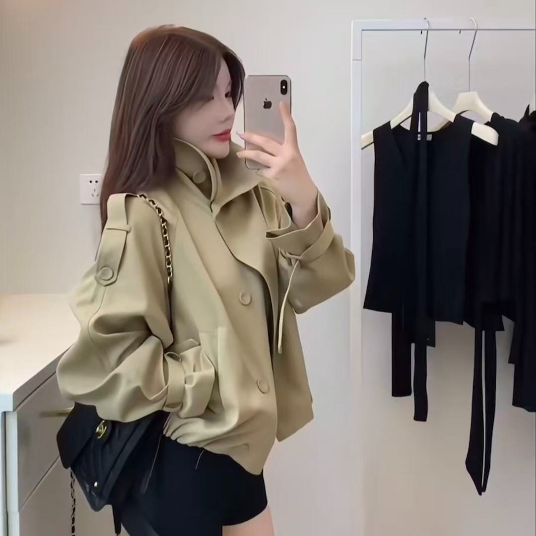 FA45200# 韩系英伦风气质立领风衣外套女秋季双排扣宽松百搭上衣 服裝批發女裝批發服飾貨源