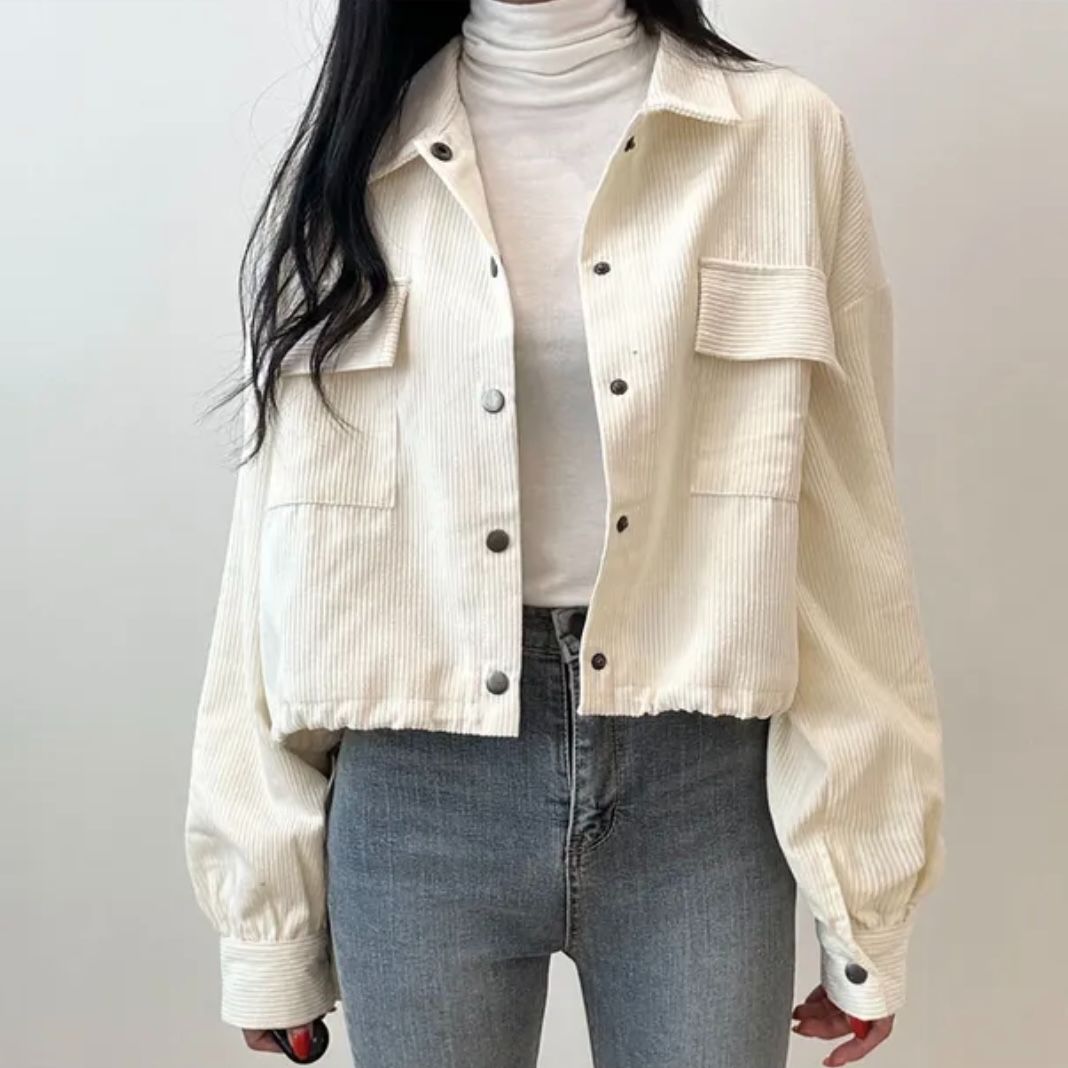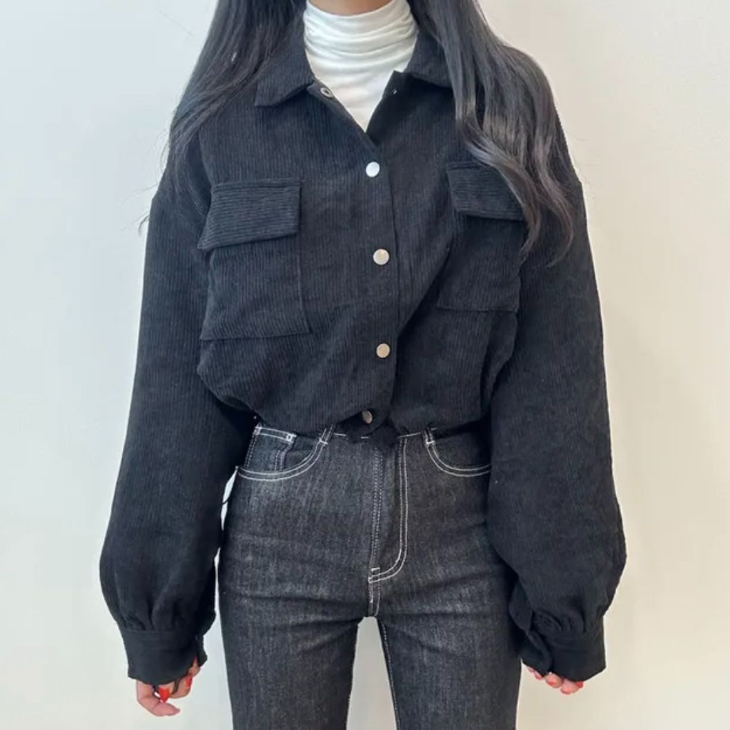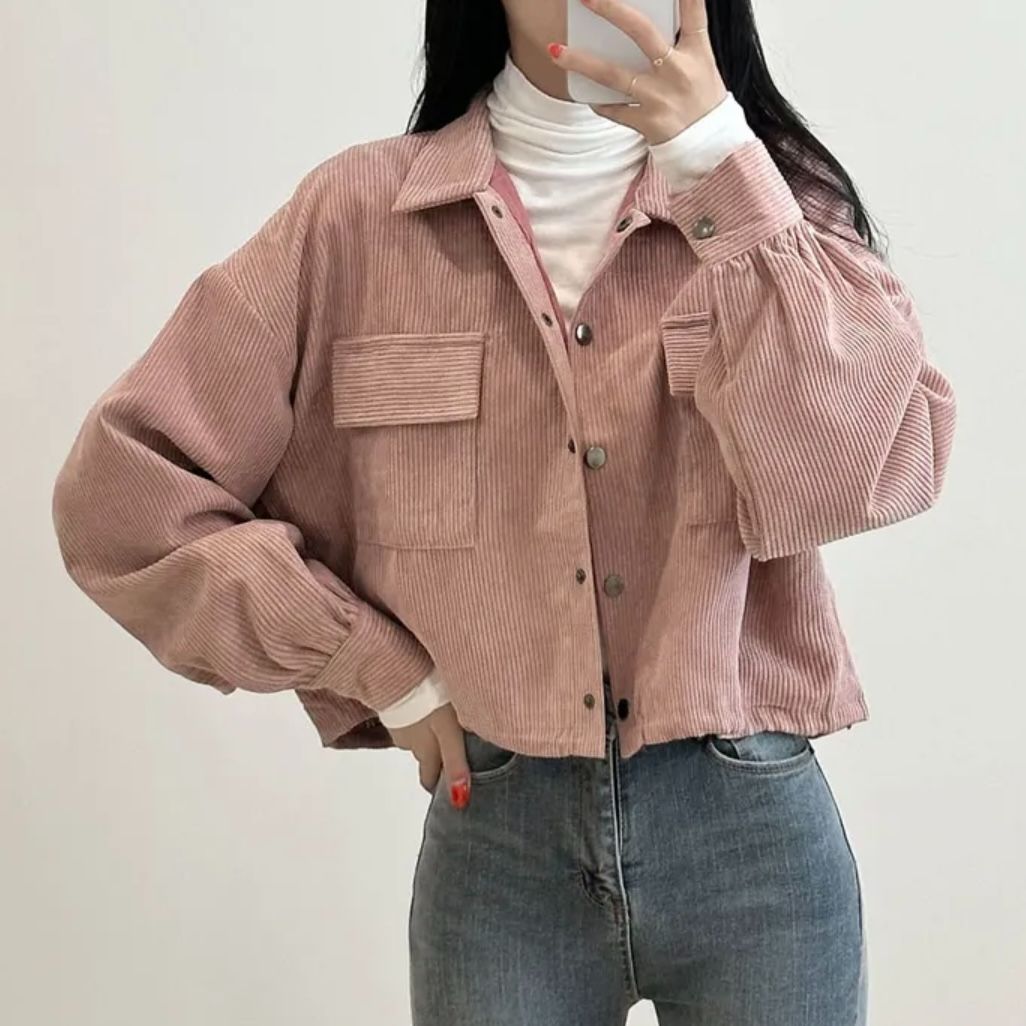 FA45208# 秋季新款法式复古翻领双口袋复抽绳百搭长袖灯芯绒外套女 服裝批發女裝批發服飾貨源
