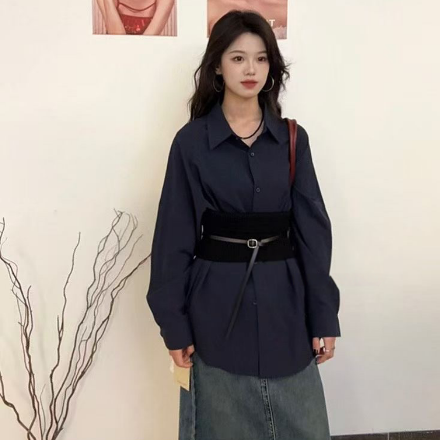 FA45243# 韩版早秋简约气质翻领设计感中长款衬衫上衣+腰封+腰带三件套 服裝批發女裝批發服飾貨源