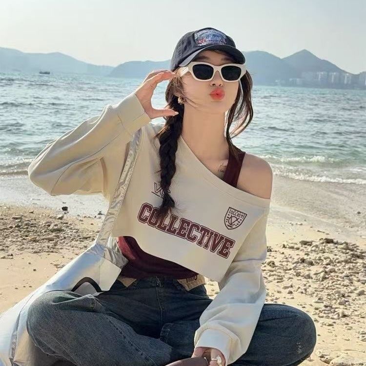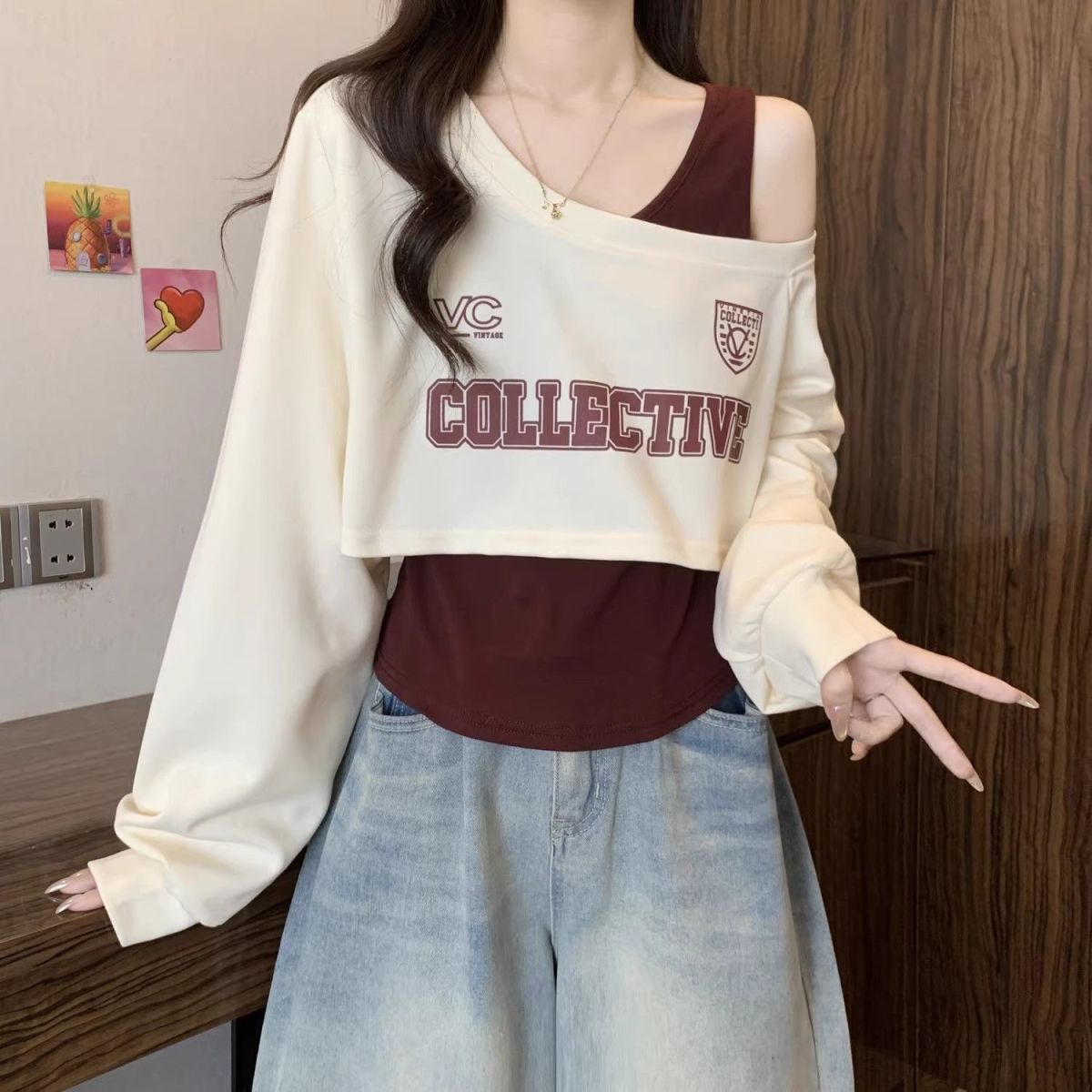 FA45273# 秋季女新款斜肩长袖卫衣T恤吊带叠穿真两件套露肩时尚小上衣 服裝批發女裝批發服飾貨源