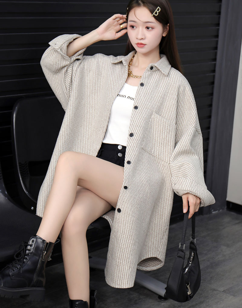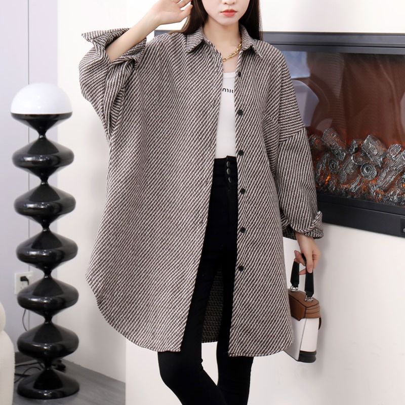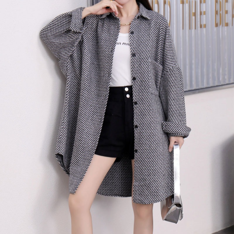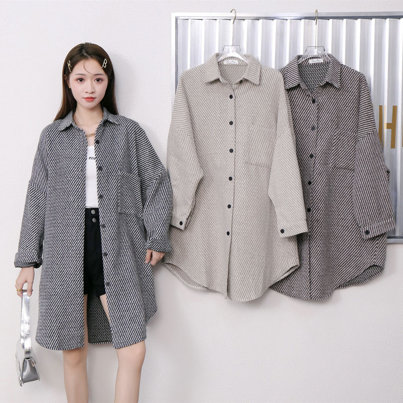 FA45222# 韩版秋季条纹毛呢衬衫设计感中长款懒惰风chic休闲百搭外套女 服裝批發女裝批發服飾貨源