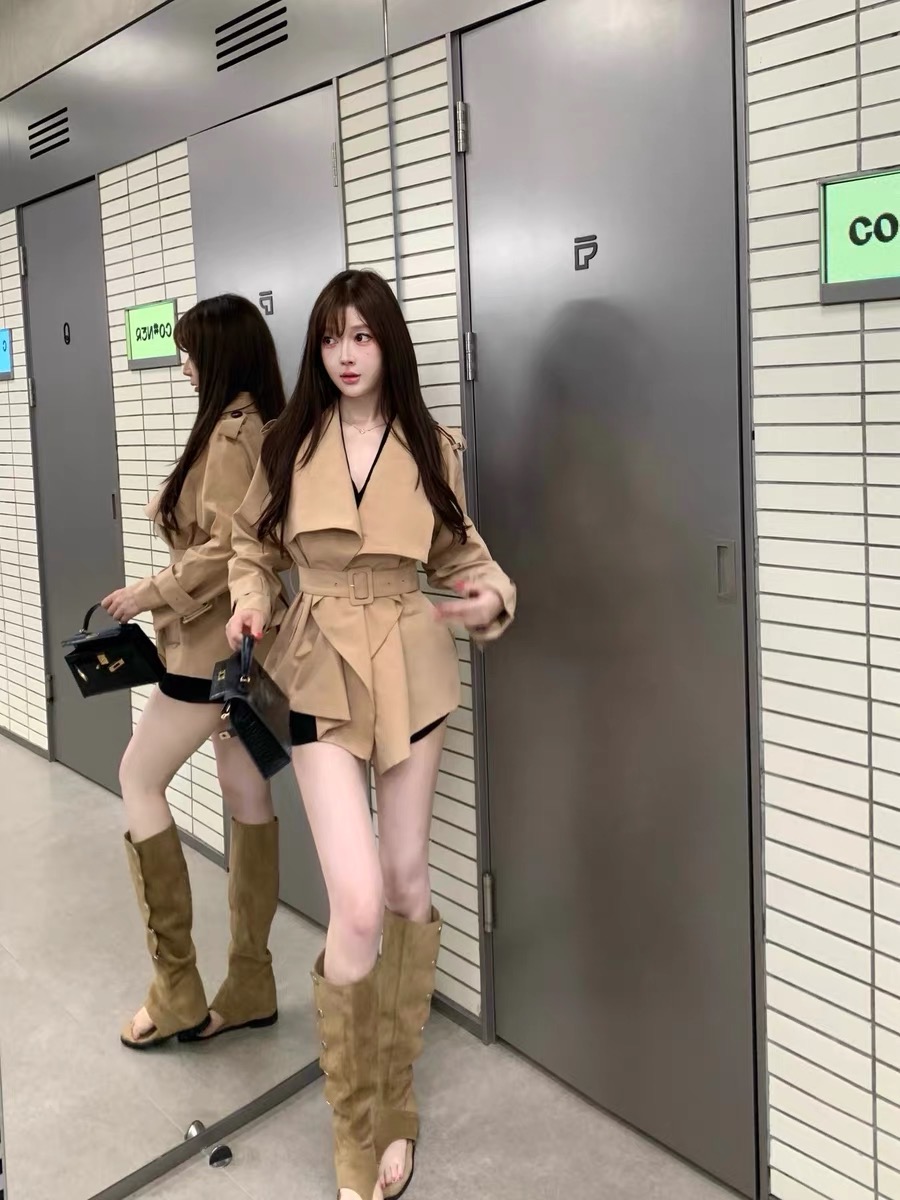 FA45270# 卡其色大翻领气质风衣外套女秋季显瘦收腰高级感小众休闲开衫上衣 服裝批發女裝批發服飾貨源