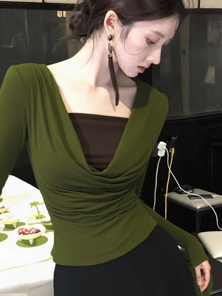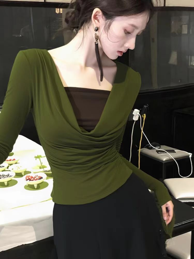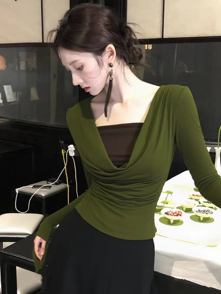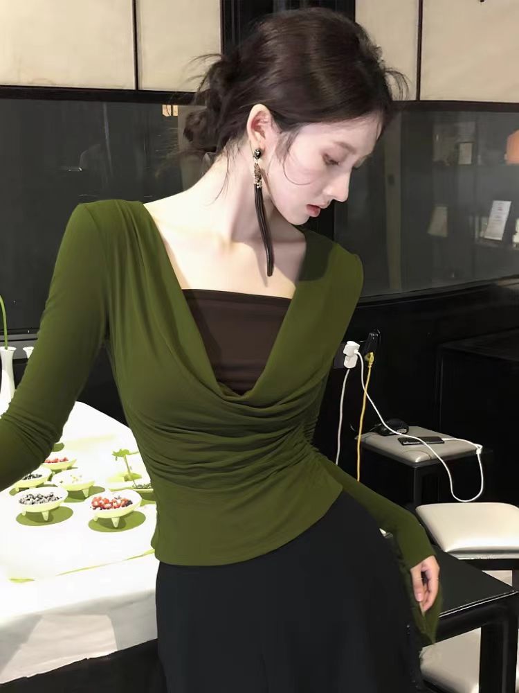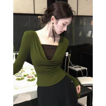 FA45272# 秋冬纯欲甜辣妹绿色荡领正肩长袖上衣收腰显瘦假两件打底衫女内搭 服裝批發女裝批發服飾貨源