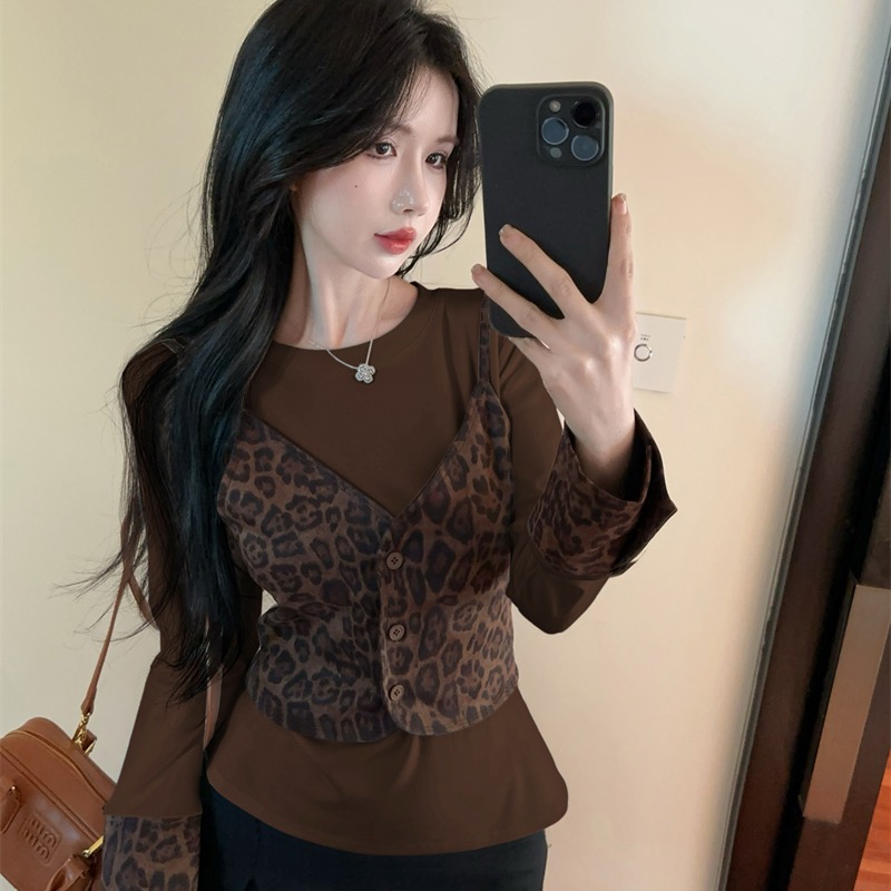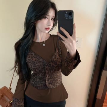 FA45373# 春秋韩版圆领拼接豹纹修身开衫吊带假两件套头甜美长袖T恤 服裝批發女裝批發服飾貨源