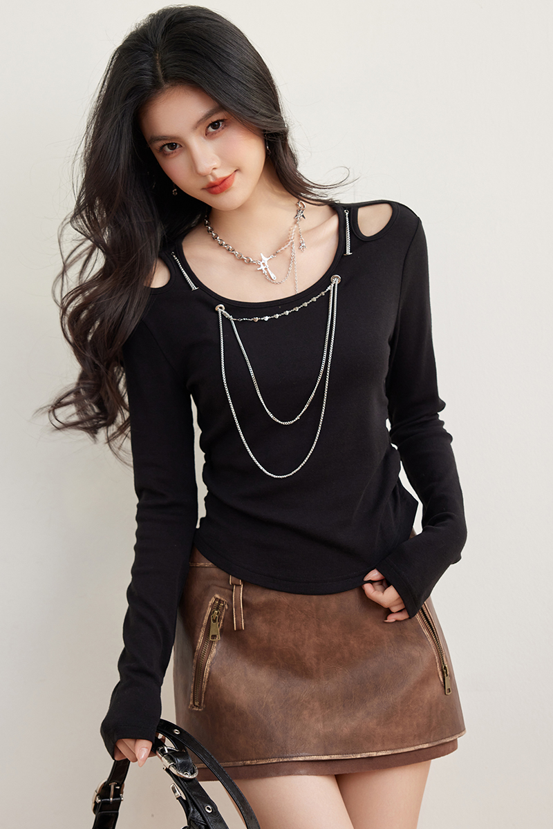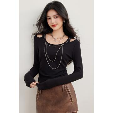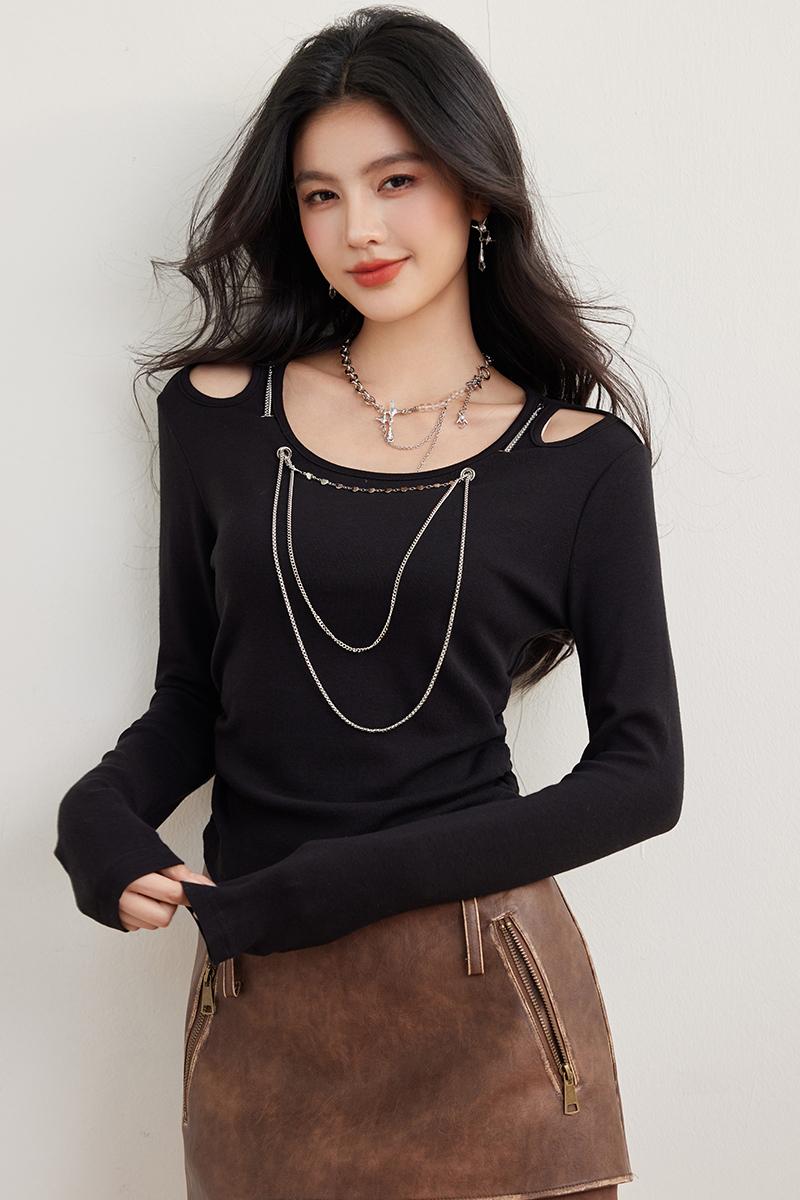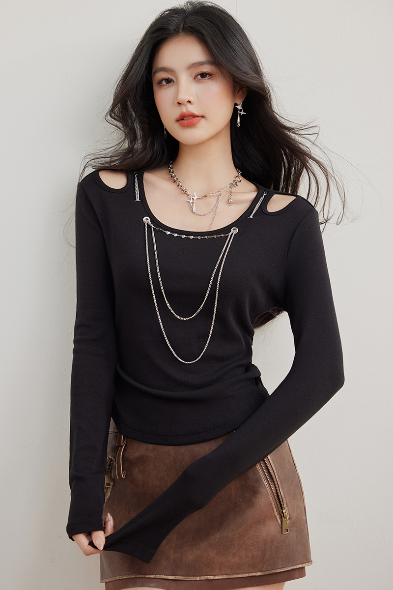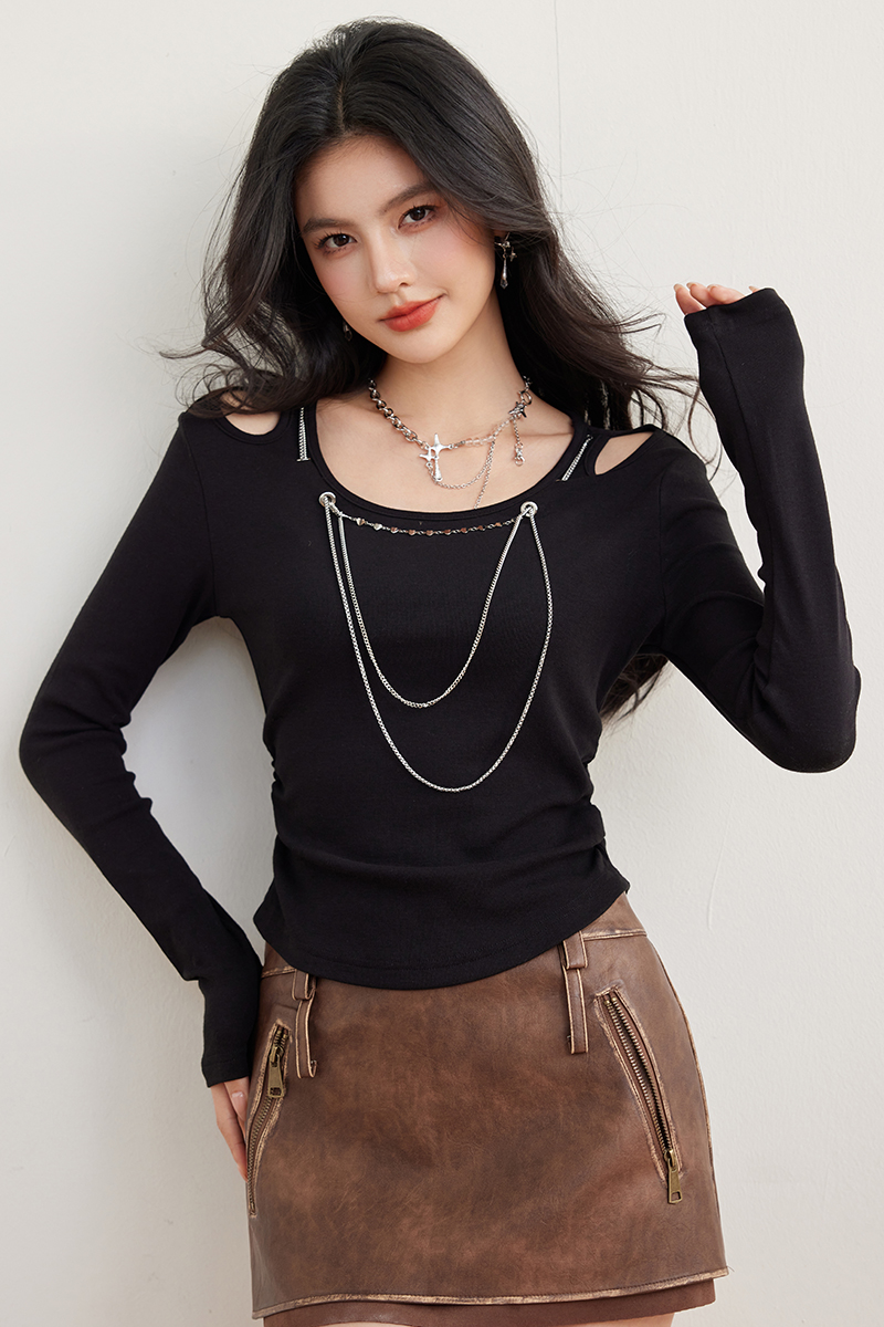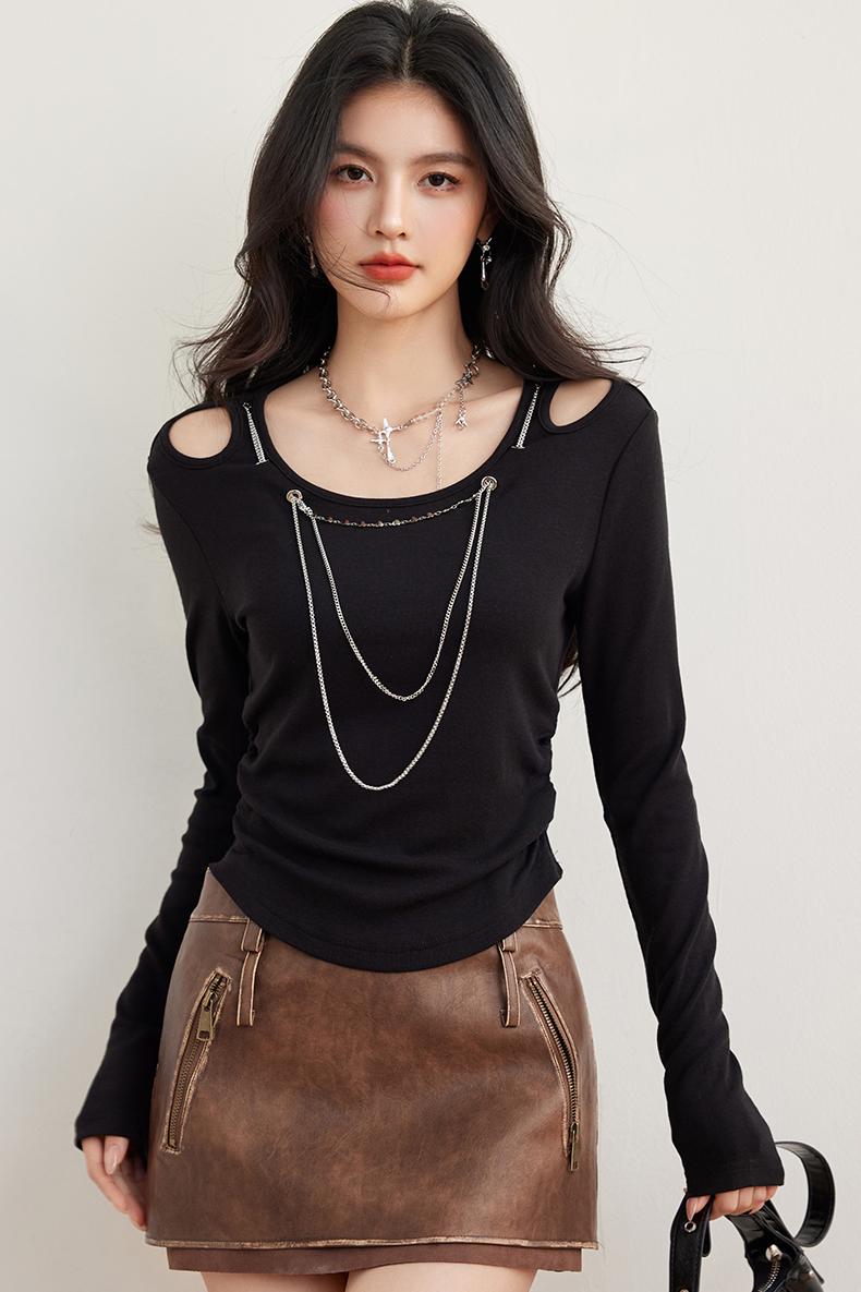 FA45541# 可拆卸金属链条装饰镂空抽褶设计收腰长袖T恤 服裝批發女裝批發服飾貨源