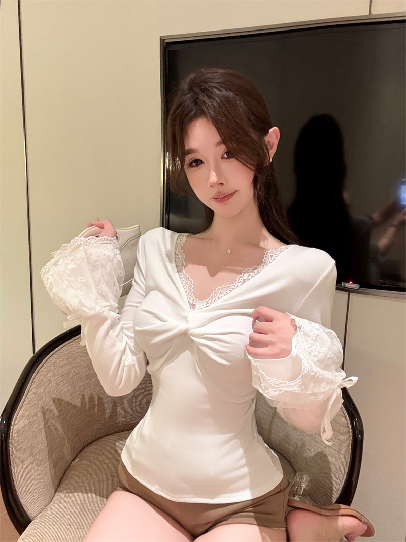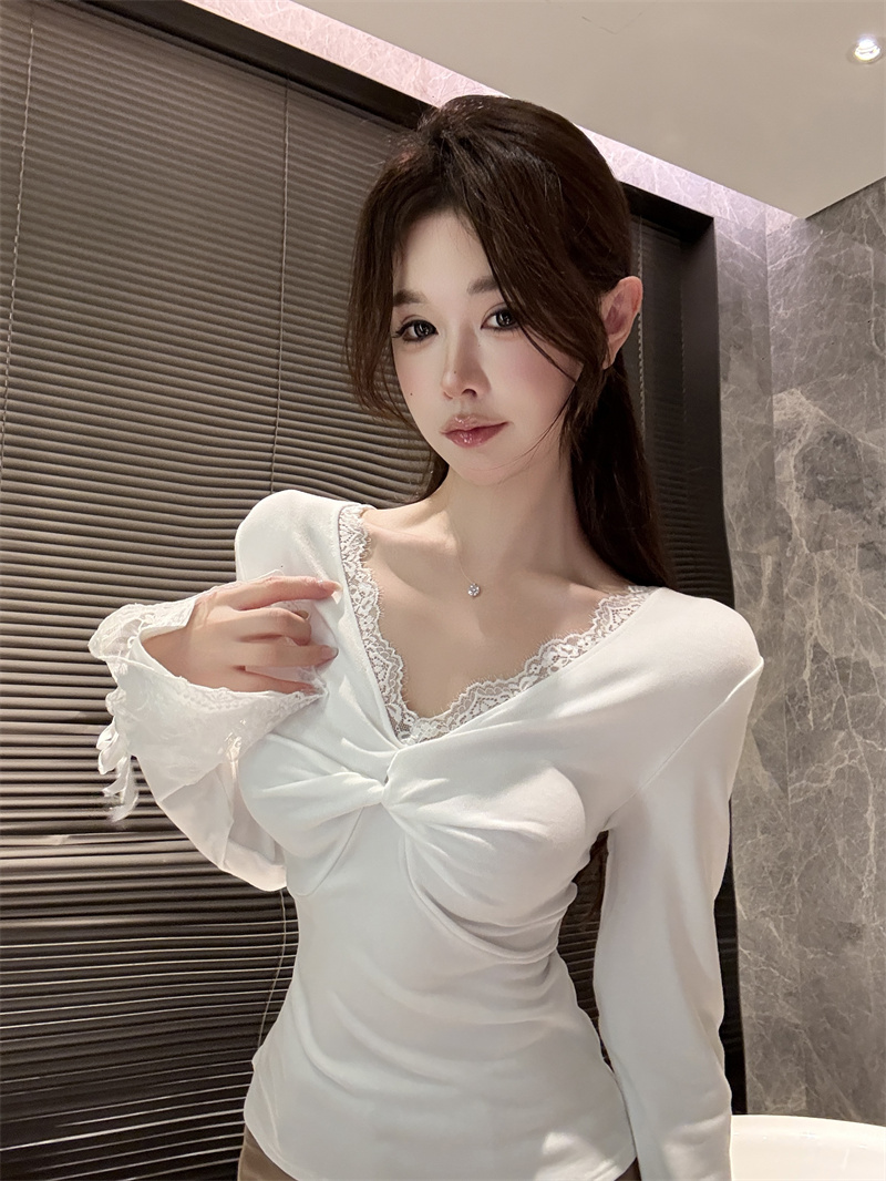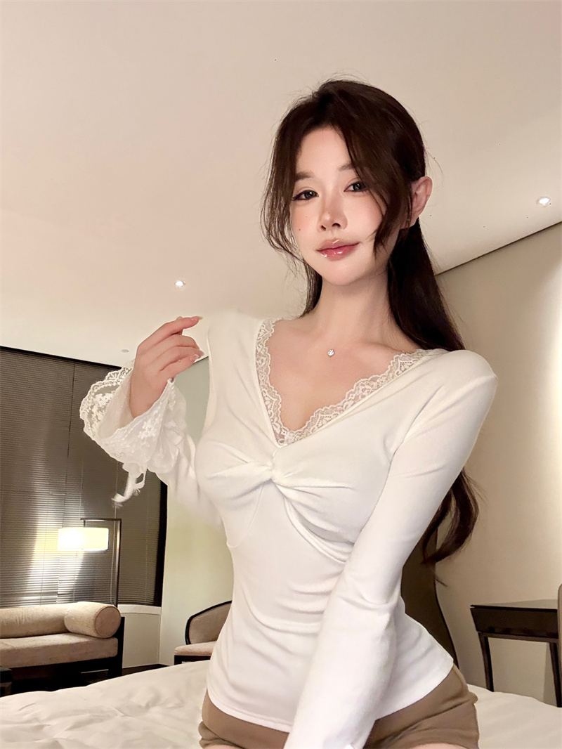 FA45553# 蕾丝花边V领纽结正肩长袖t恤女秋冬纯欲风加绒保暖打底 服裝批發女裝批發服飾貨源