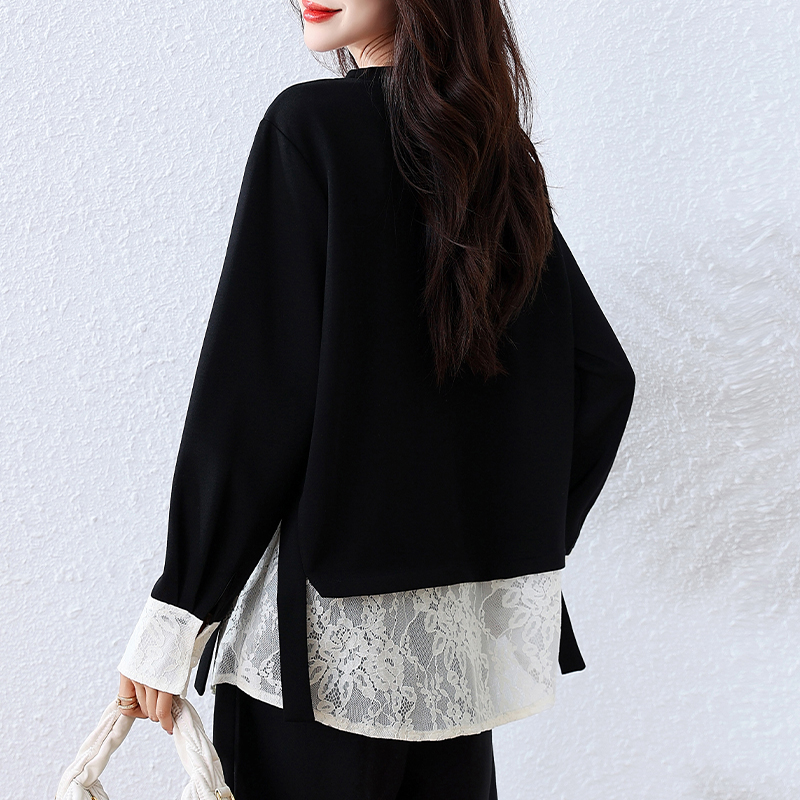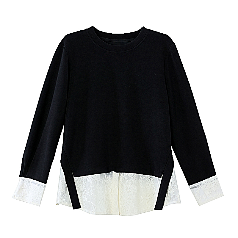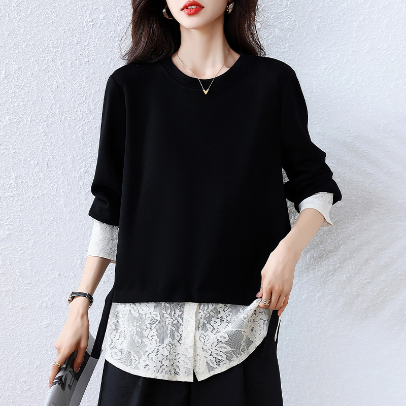 FA45660# 时尚蕾丝假两件圆领卫衣女早秋新款欧洲站大码黑色上衣 服裝批發女裝批發服飾貨源