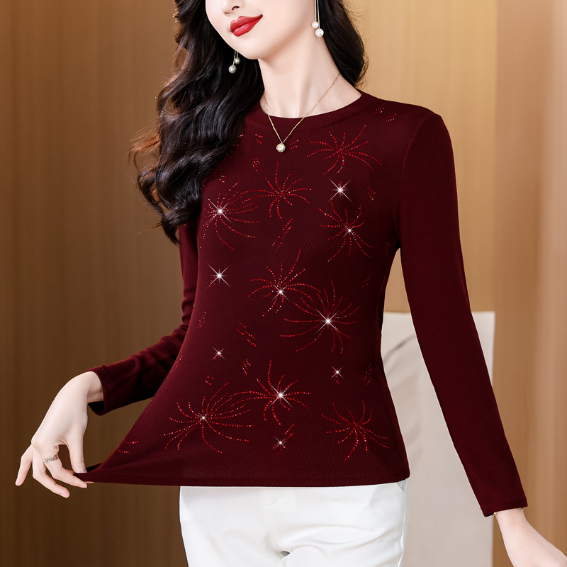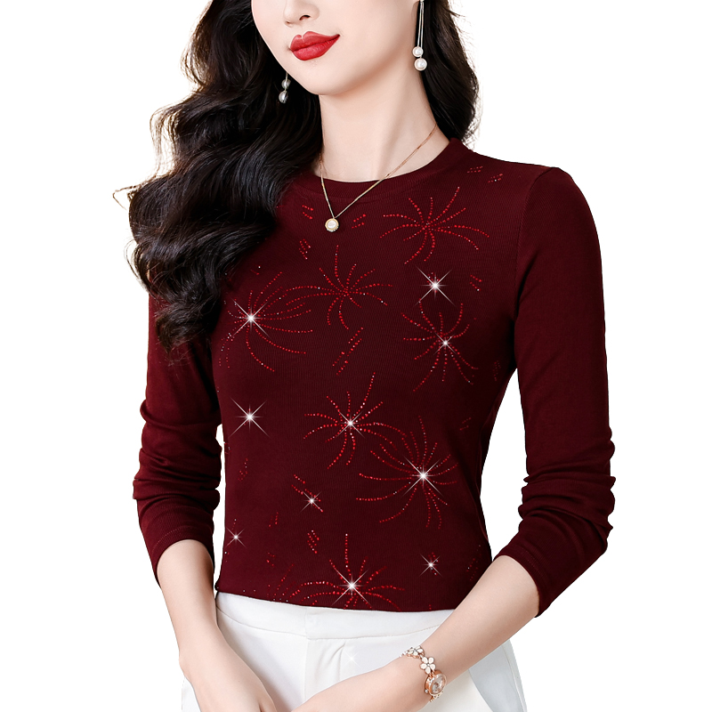 FA45665# 秋冬新款高档烫钻烟花图案圆领长袖棉t恤洋气上衣女 服裝批發女裝批發服飾貨源