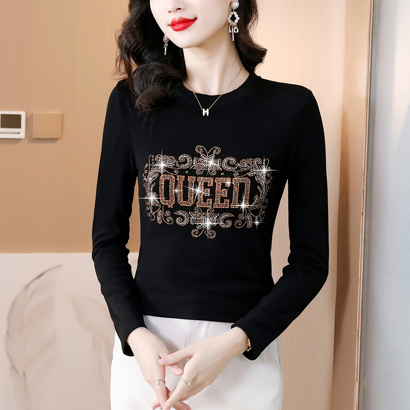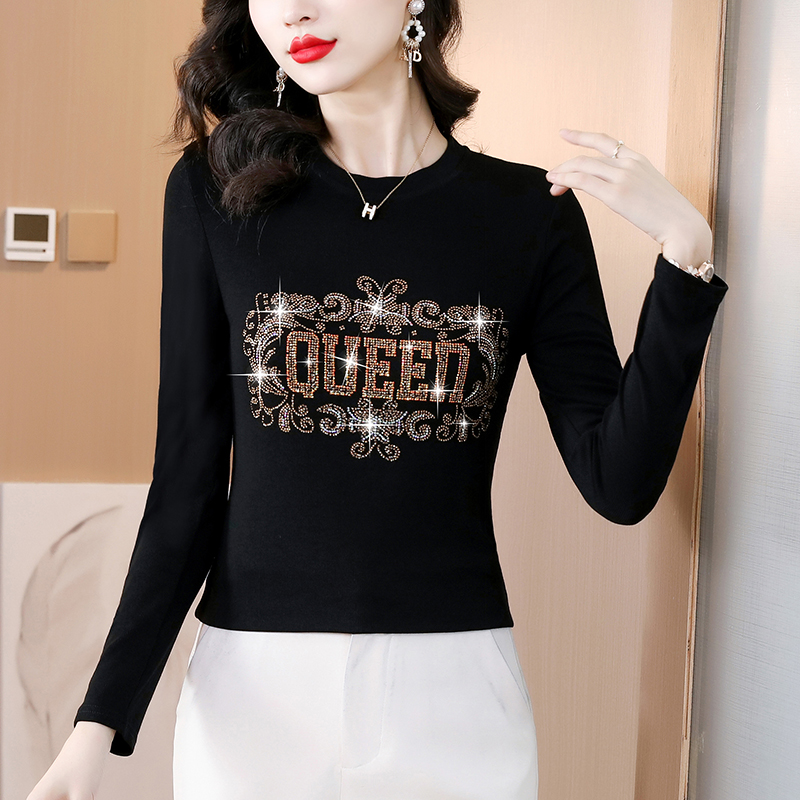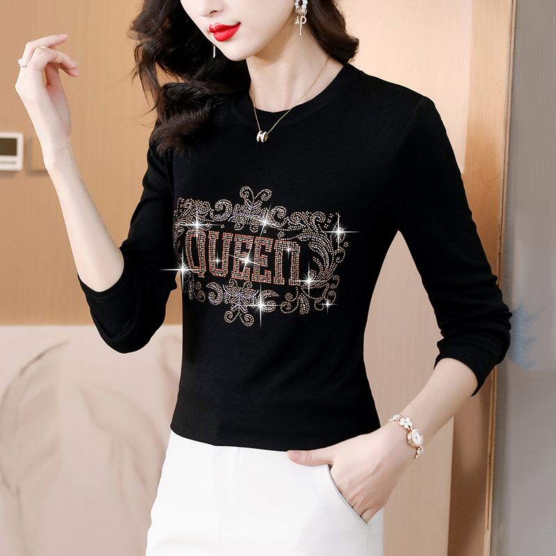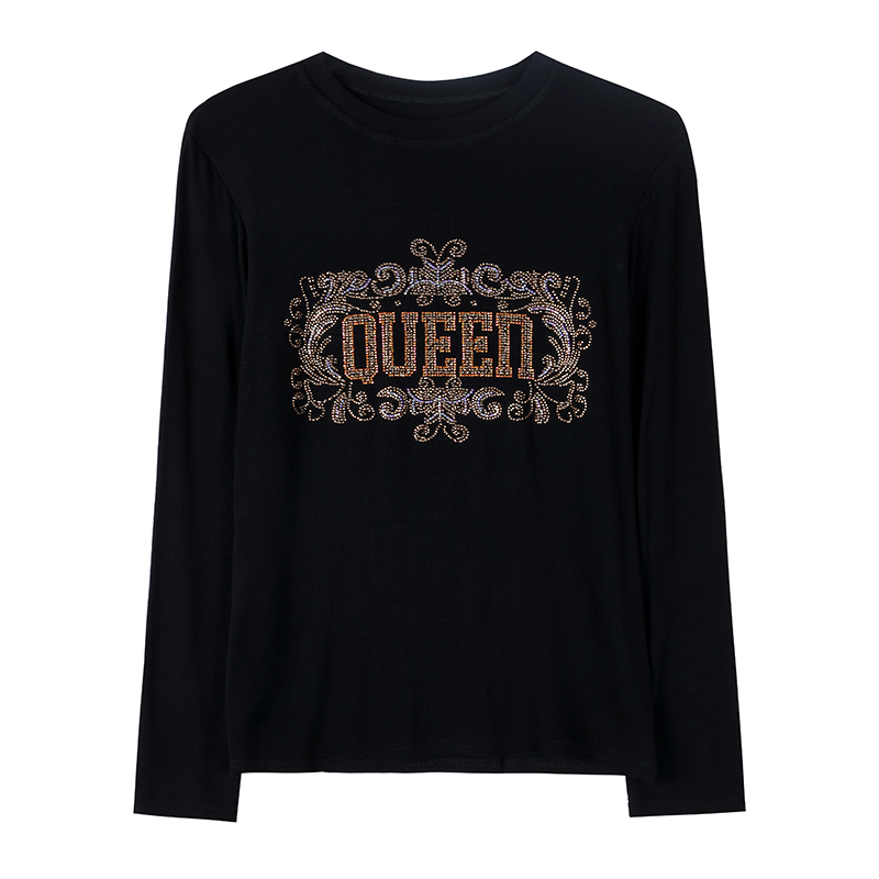 FA45670# 秋冬新款气质大码显瘦女装欧货重工烫钻圆领长袖棉t恤 服裝批發女裝批發服飾貨源