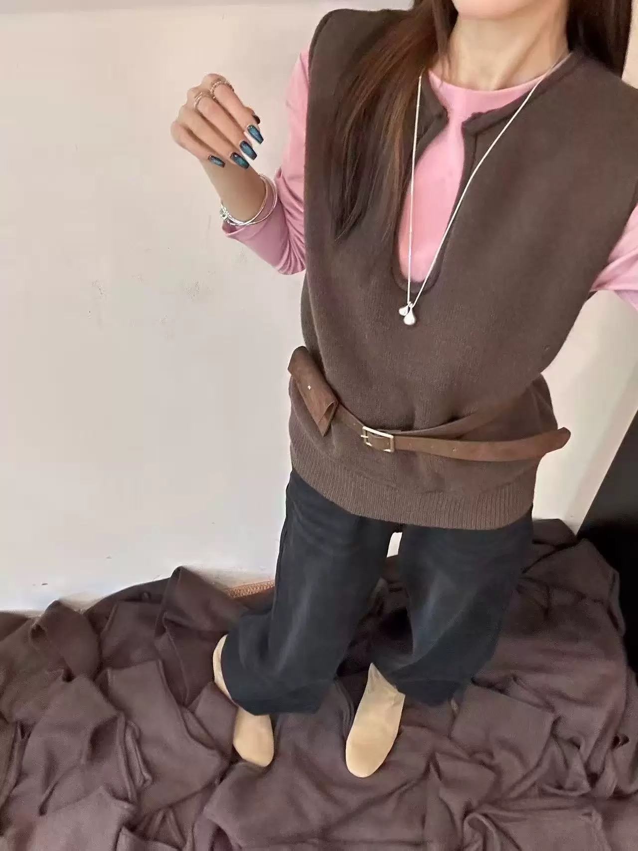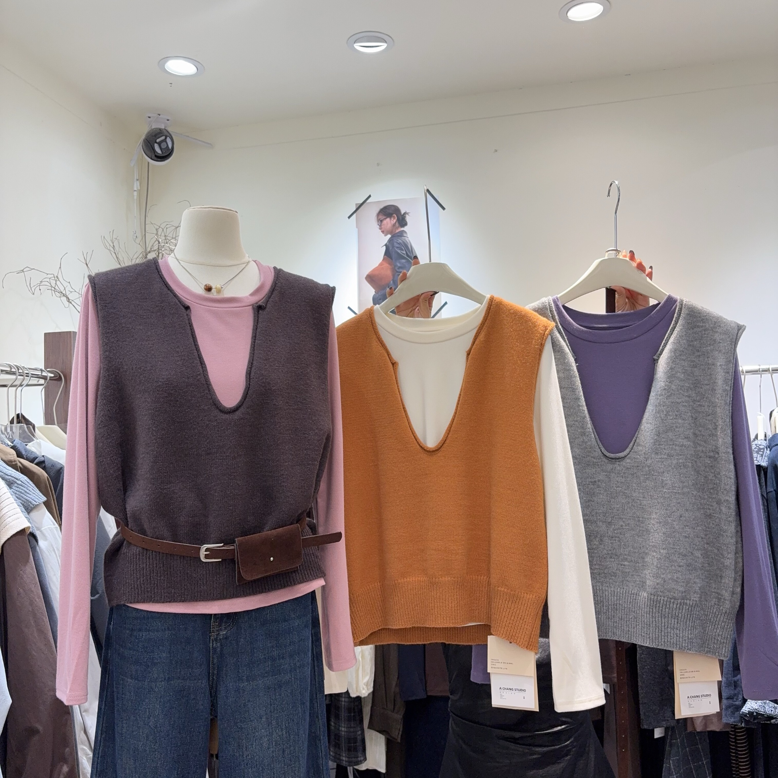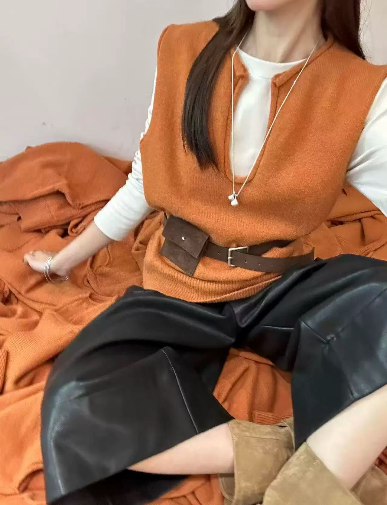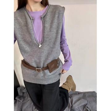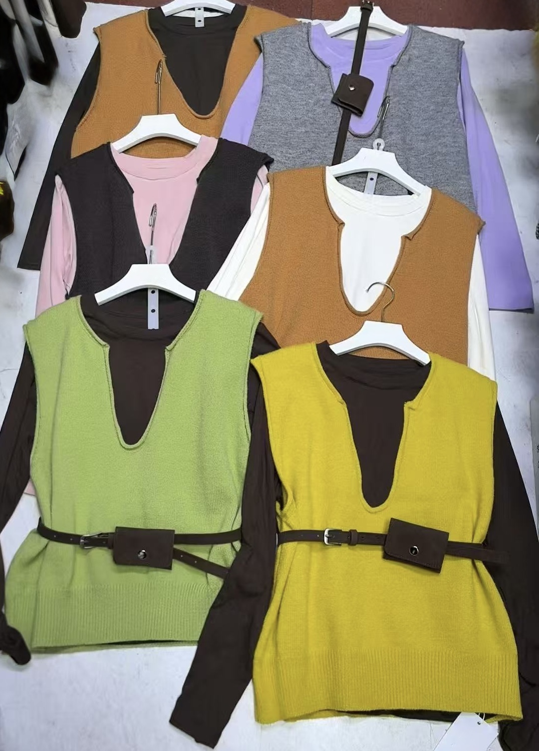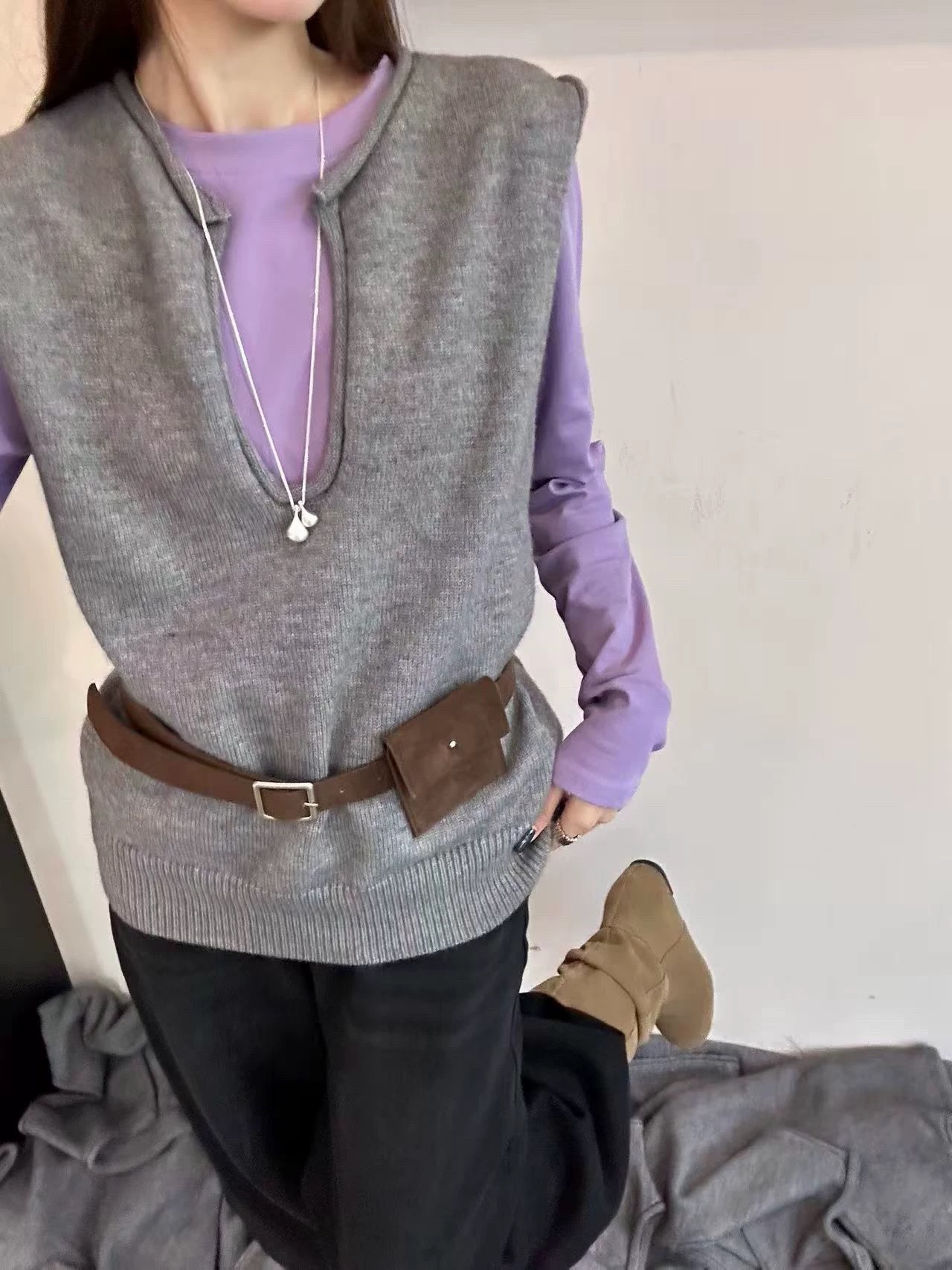 FA45686# 欧货秋季V领无袖羊毛针织马甲女叠穿宽松休闲长袖T恤两件套套装 服裝批發女裝批發服飾貨源