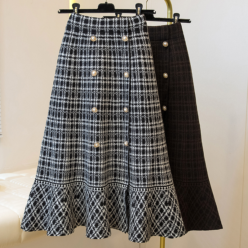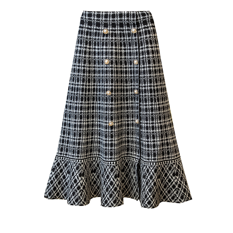 FA46815# 大码女装复古小香风格子针织双排扣荷叶边半身裙 服裝批發女裝批發服飾貨源