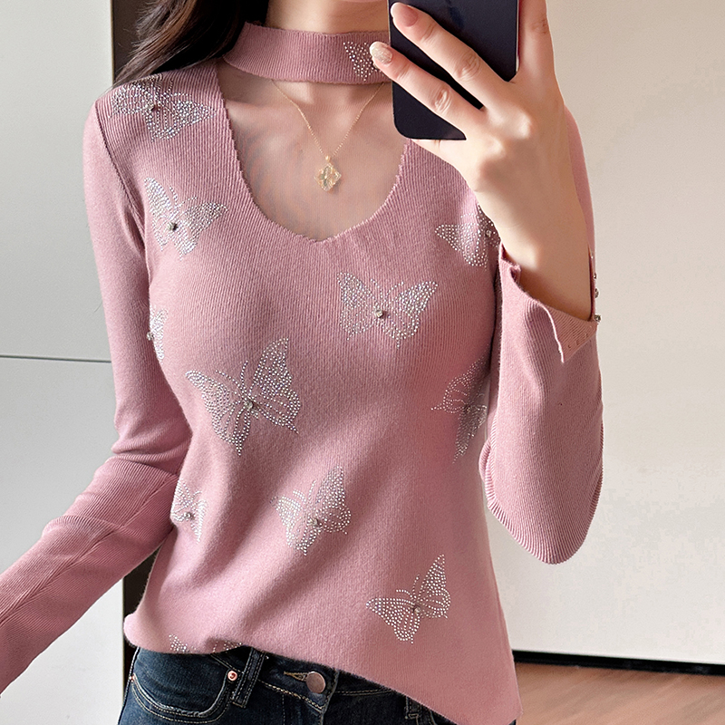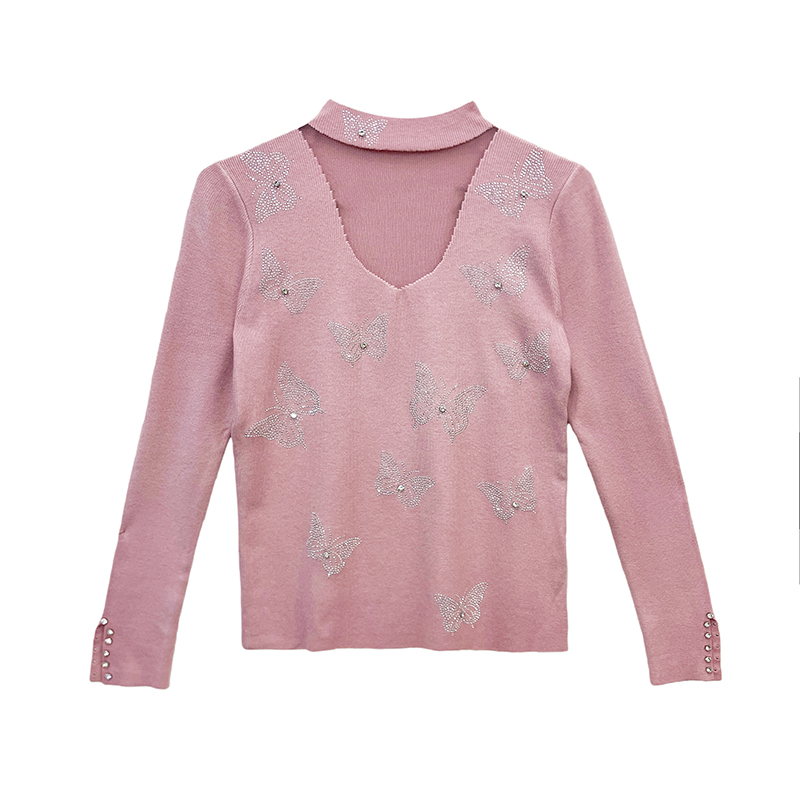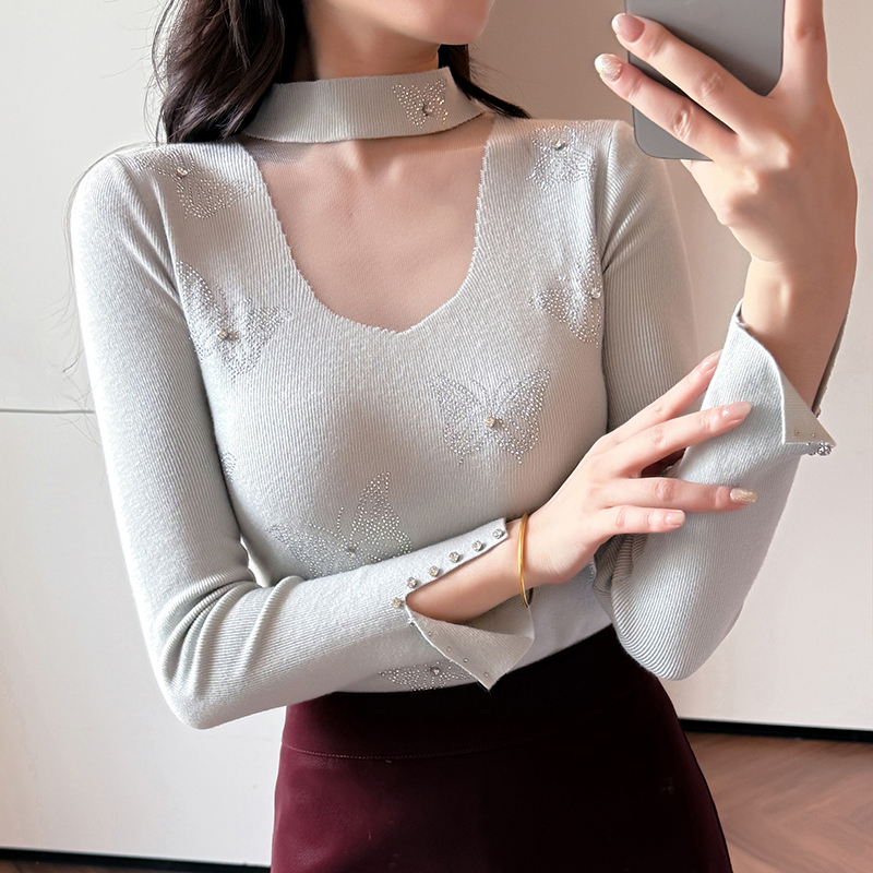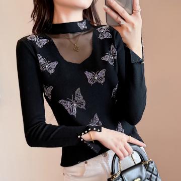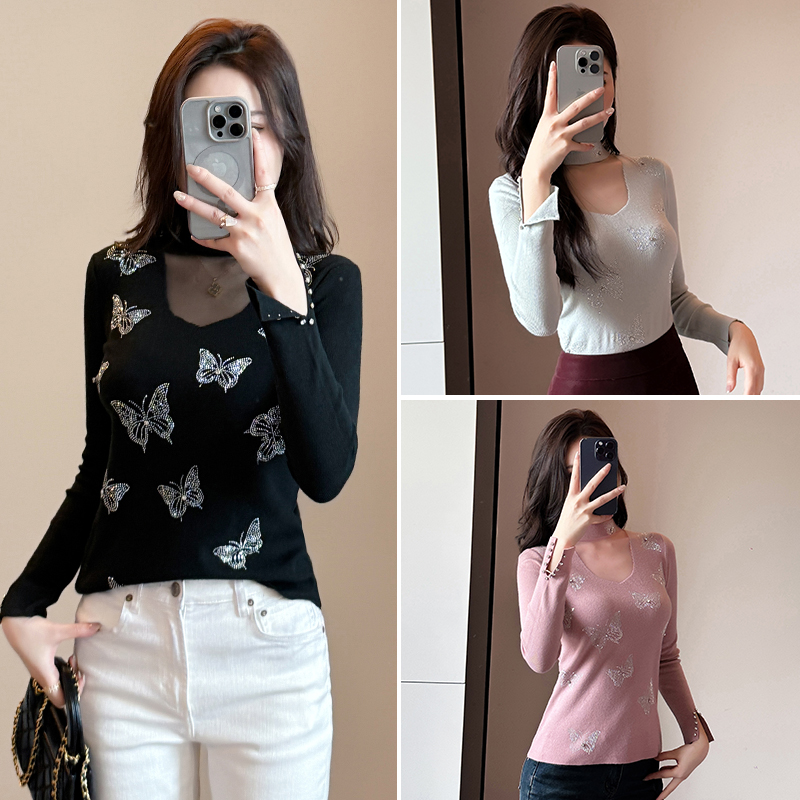 FA46834# 秋冬新款设计感长袖烫钻蝴蝶结针织打底衫网纱拼接半高领 服裝批發女裝批發服飾貨源