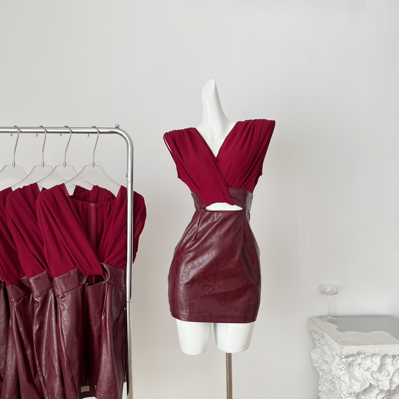 FA46846# 伯爵夫人酒红色深V无袖皮革裙复古收腰修身连衣裙 服裝批發女裝批發服飾貨源