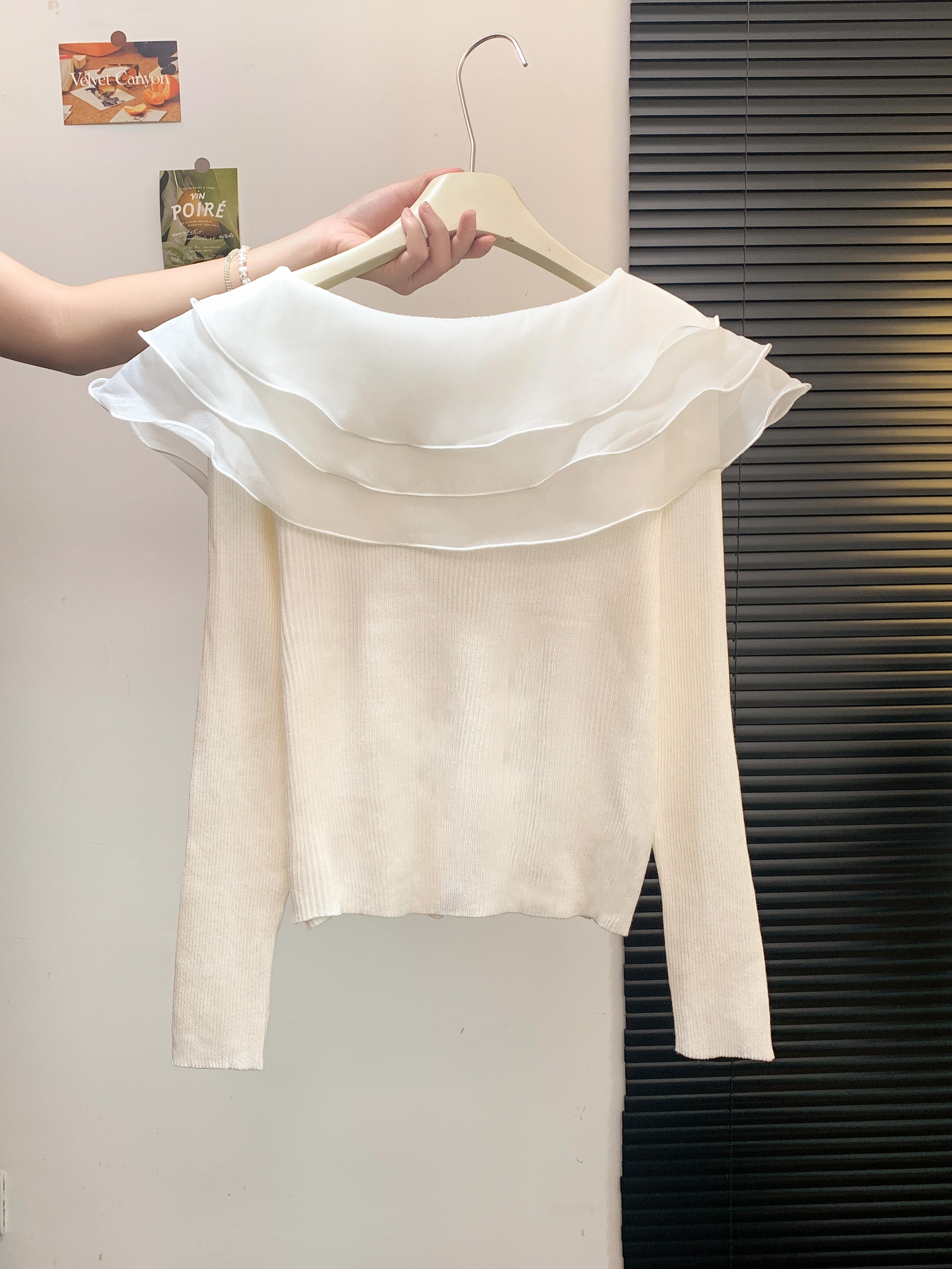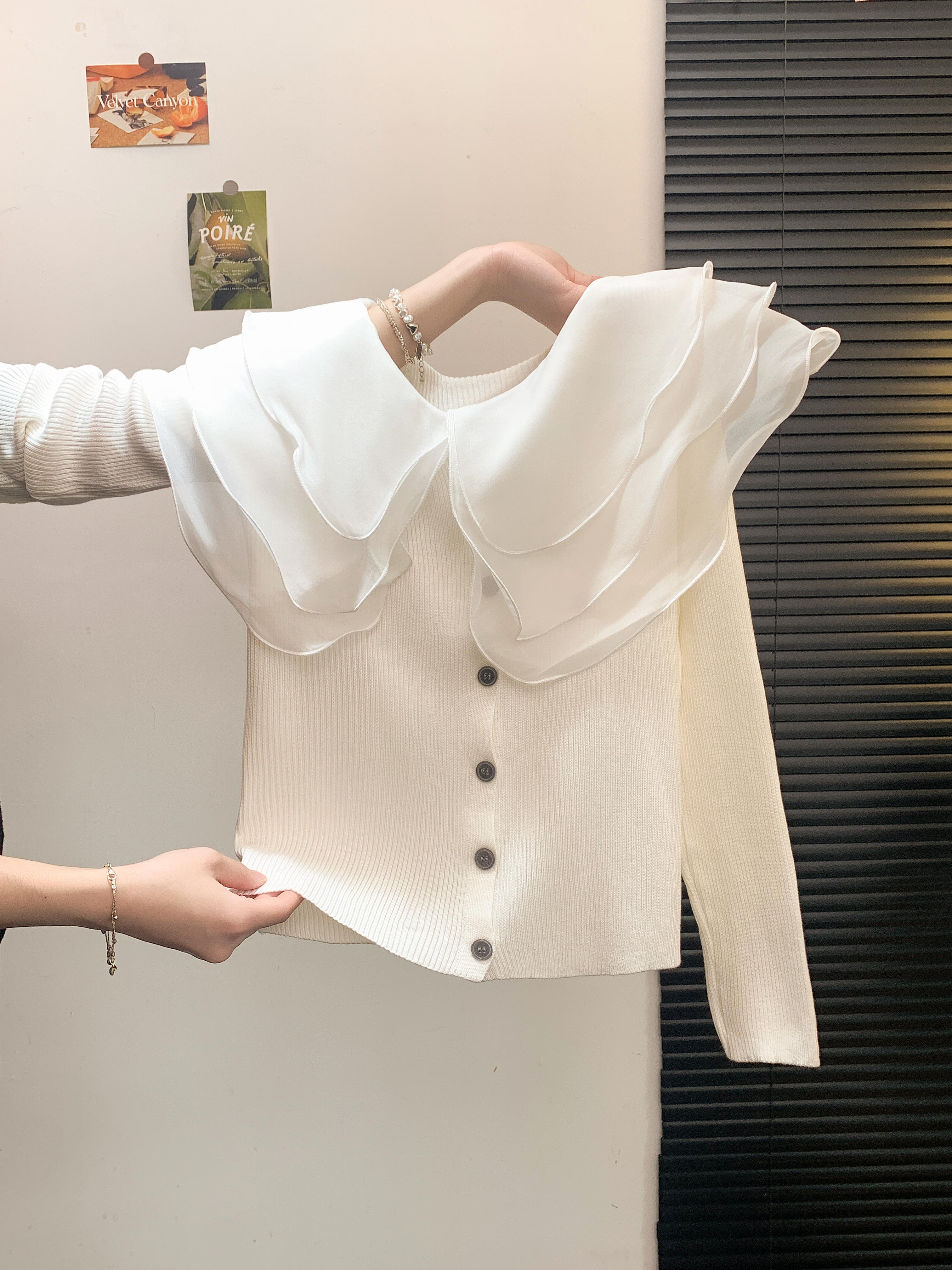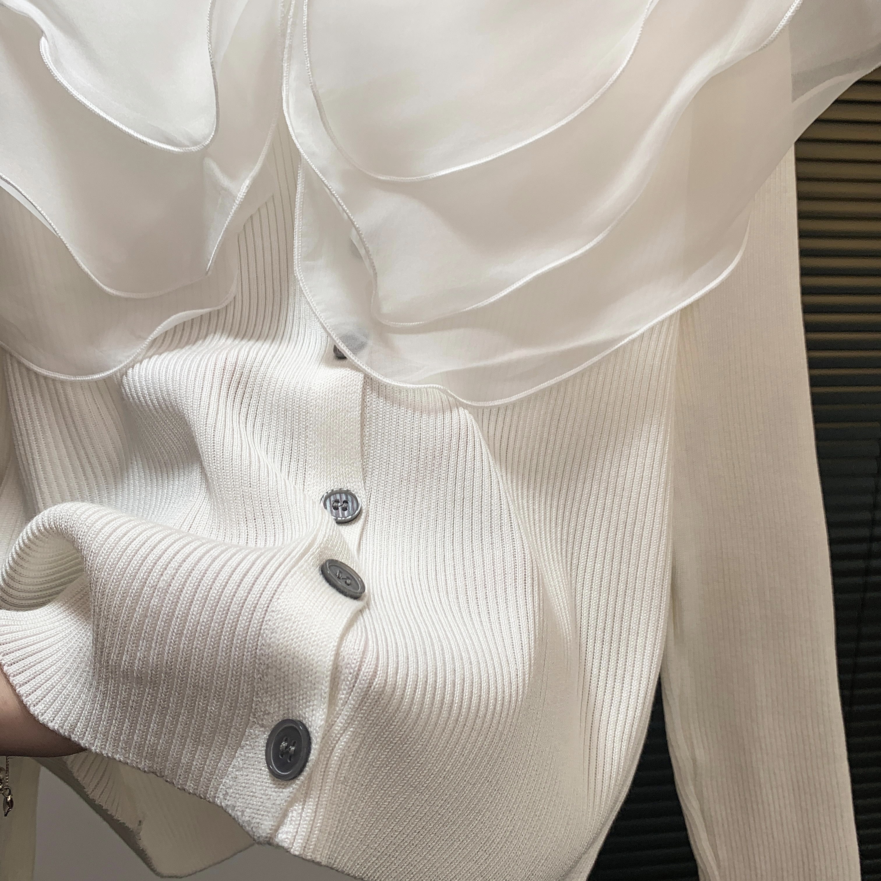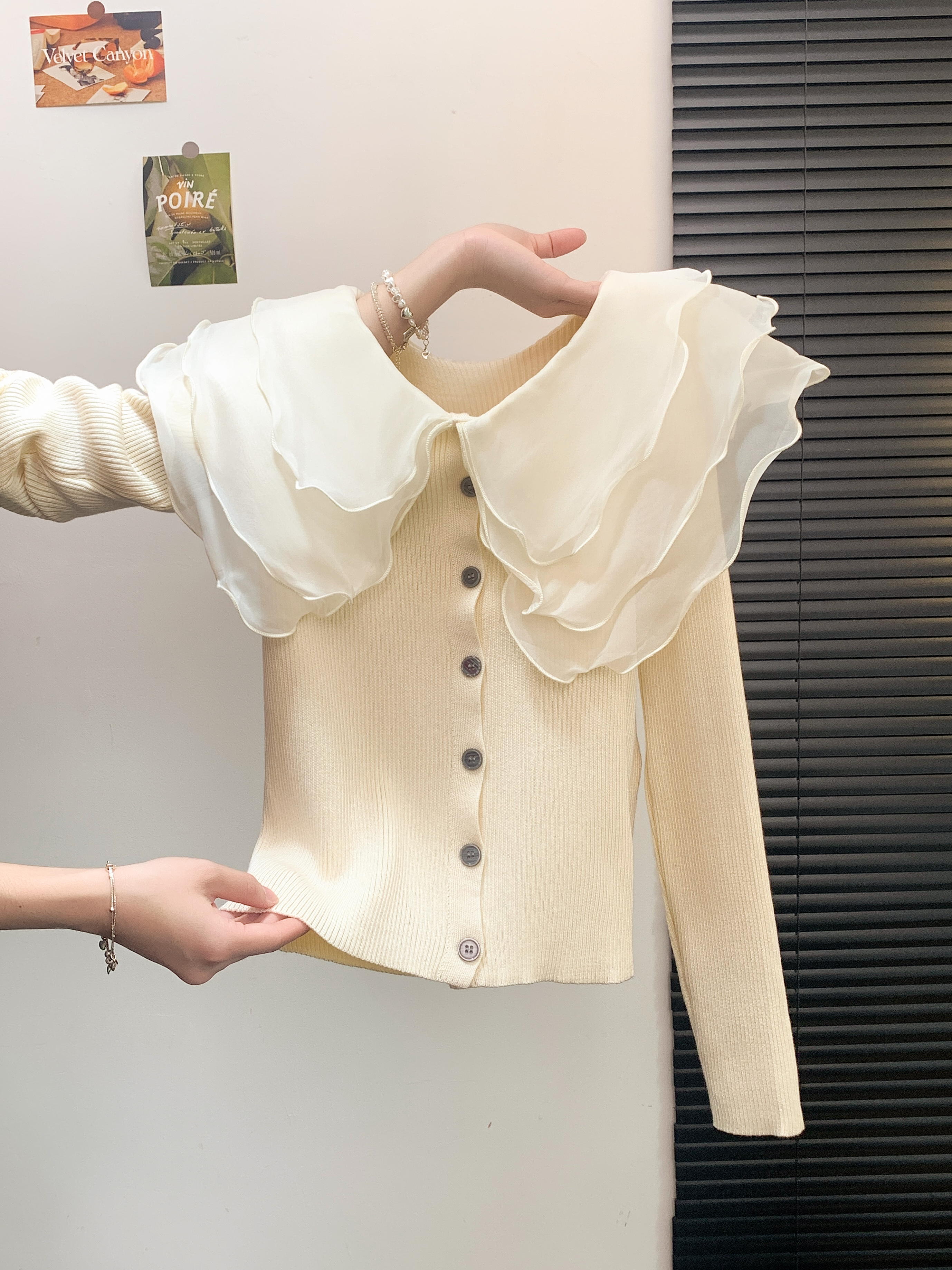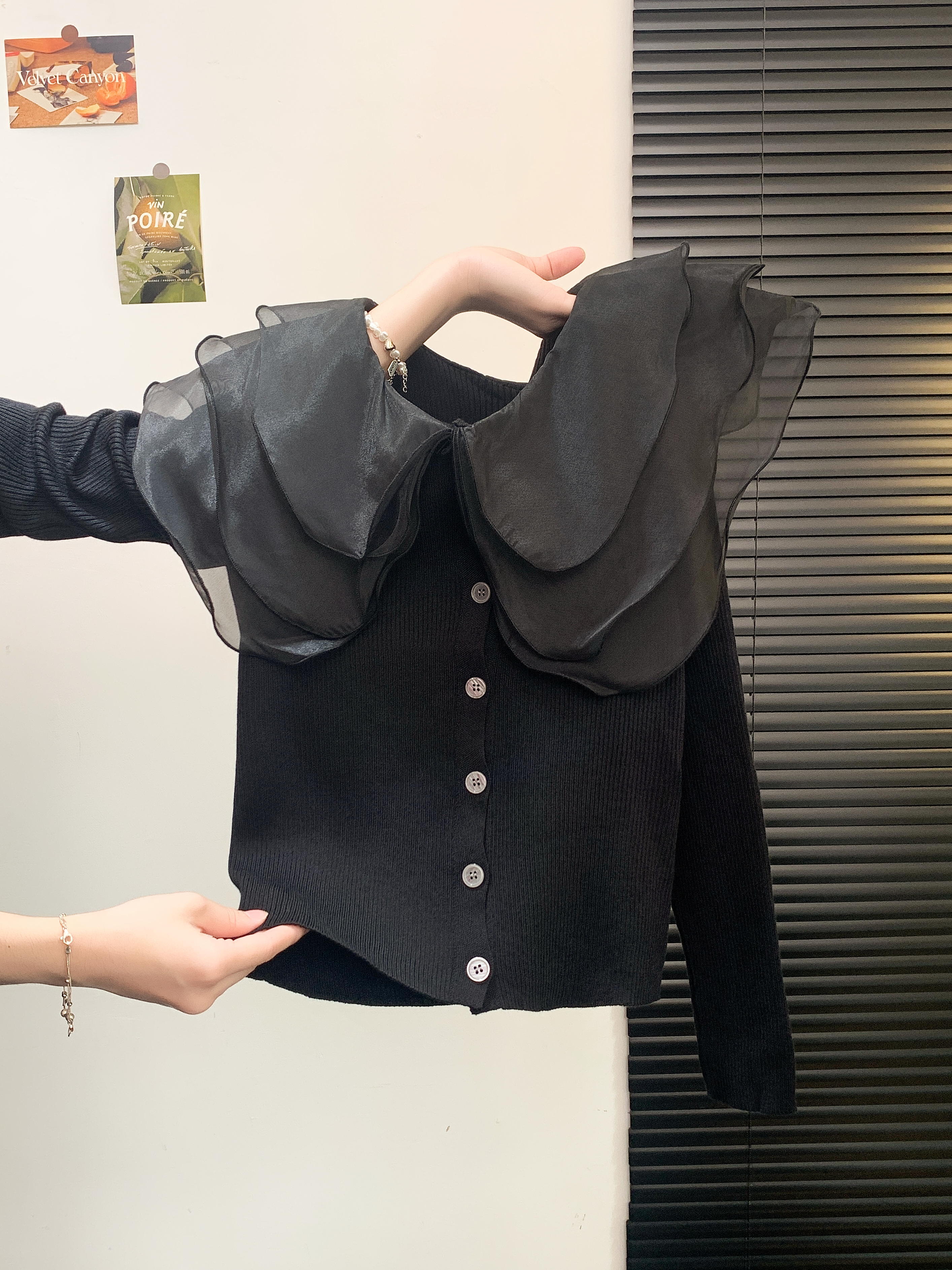 FA46891# 娃娃领荷叶边短款针织开衫女秋打底毛衣修身高级感穿搭上衣 服裝批發女裝批發服飾貨源