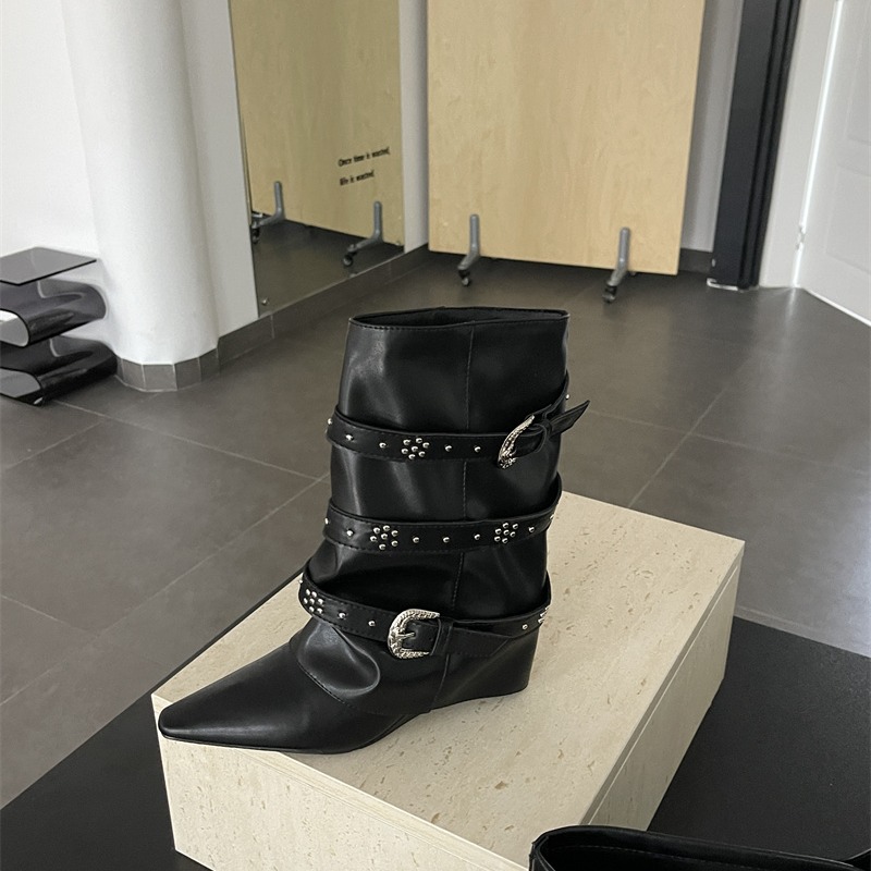 X-32902# 气质白色内增高短靴女尖头复古中筒靴增高显瘦小个子铆钉裤管靴 鞋子批发女鞋批发货源