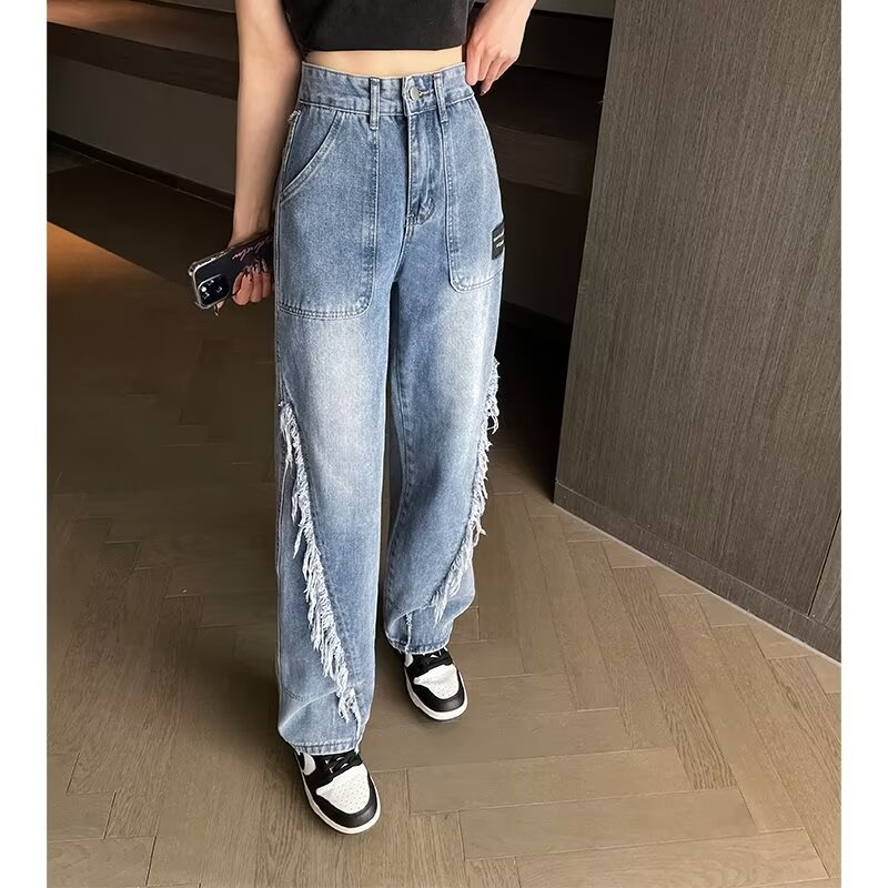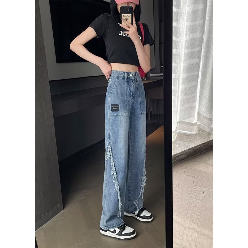 FA50922# 设计感毛边牛仔裤女春秋新款大码高腰直筒长裤宽松显瘦阔腿裤子潮 服裝批發女裝批發服飾貨源