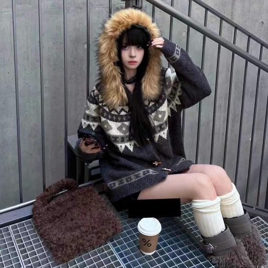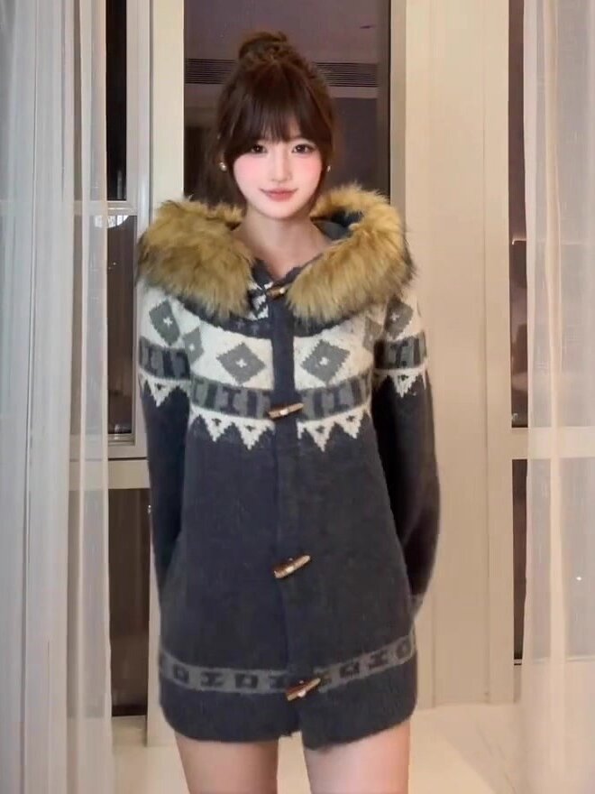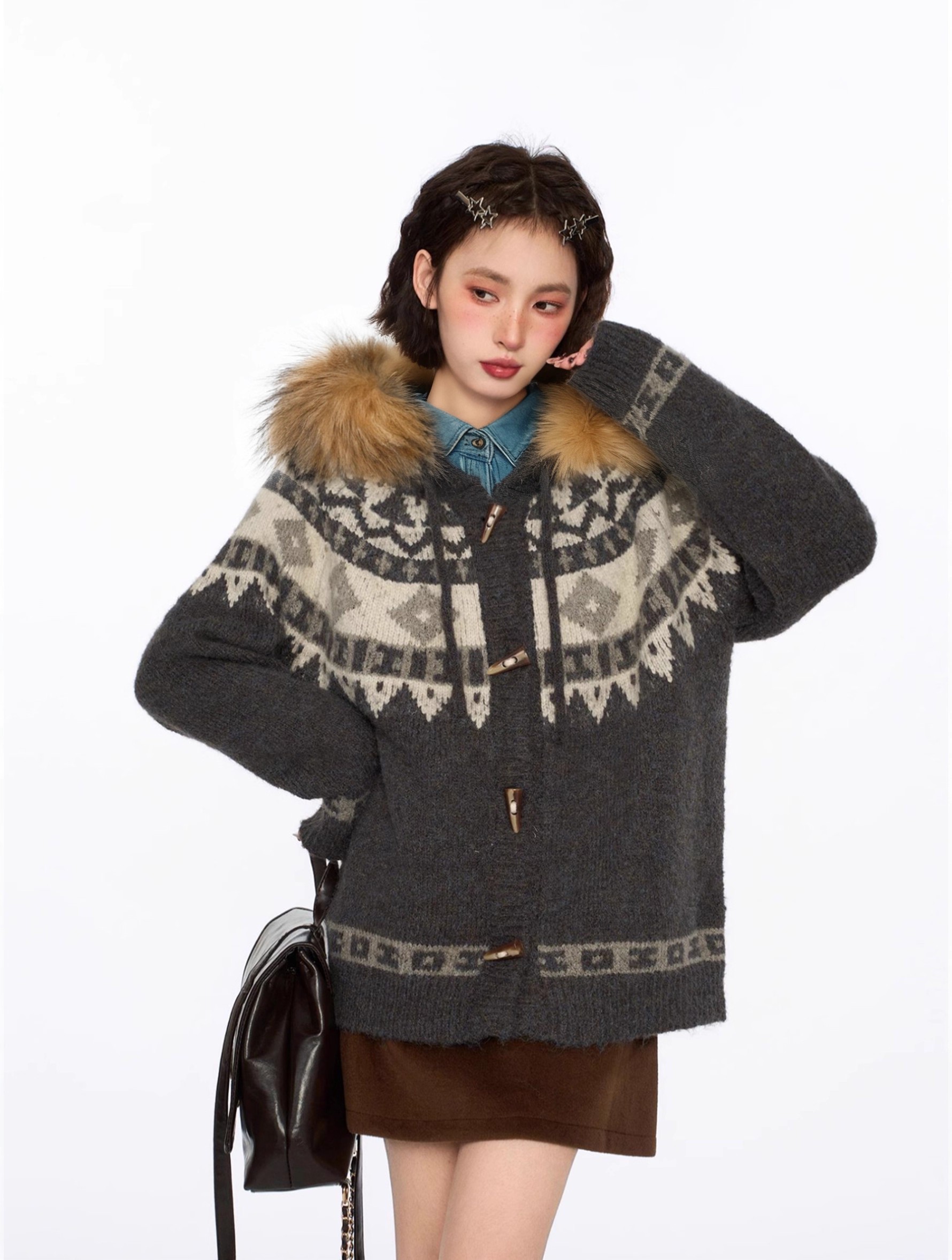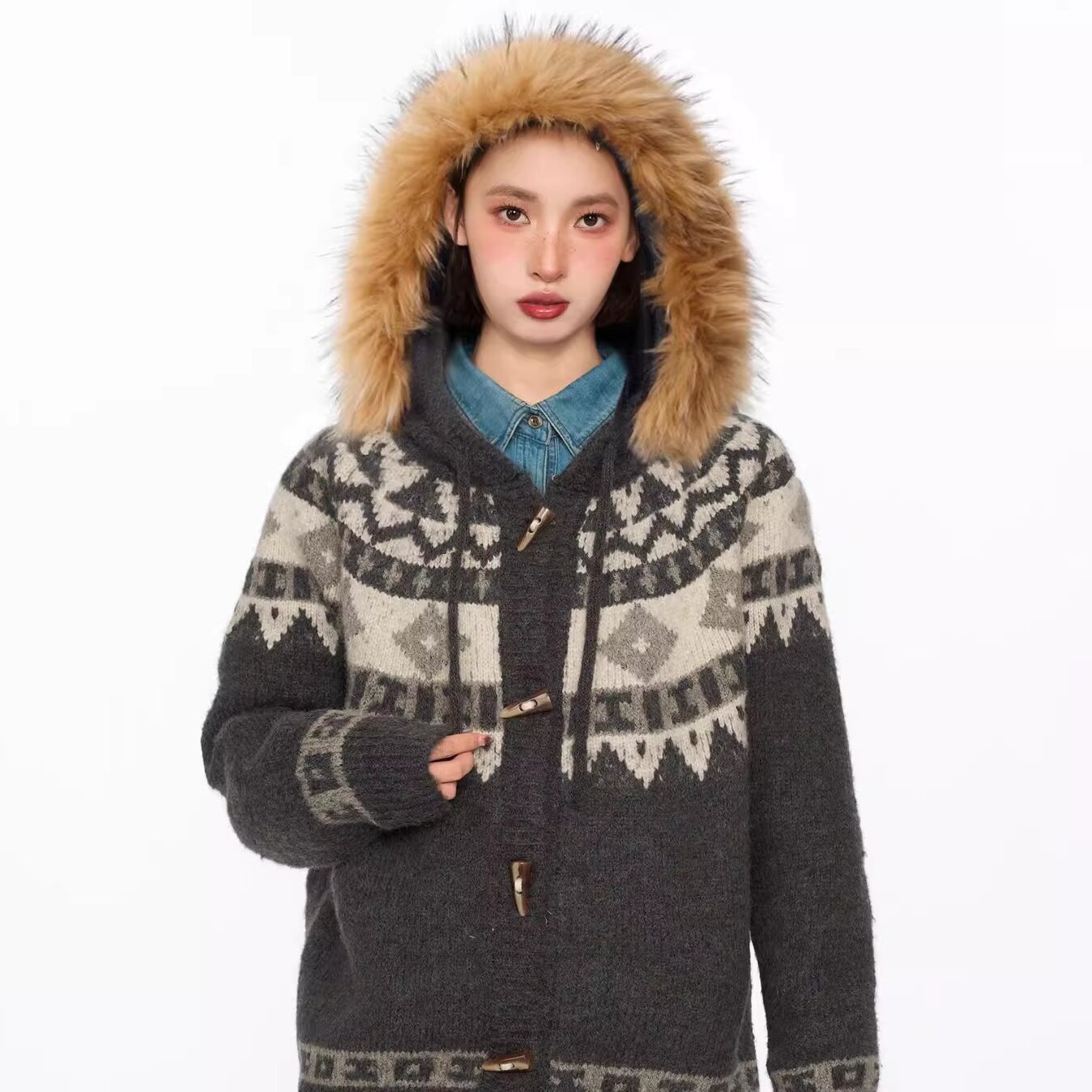 FA50947# 费尔岛灰色牛角扣毛领连帽毛衣外套女秋冬季韩系宽松慵懒针织开衫 服裝批發女裝批發服飾貨源