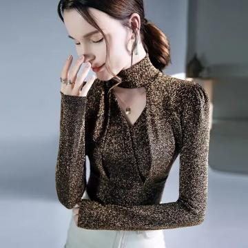 FA50953# 欧洲站挂脖打底衫女内搭新款亮丝洋气小衫秋冬气质别致上衣 服裝批發女裝批發服飾貨源