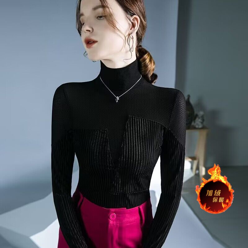 FA50959# 欧洲站高领打底衫女内搭秋冬新款设计感撞色别致不规则小衫 服裝批發女裝批發服飾貨源