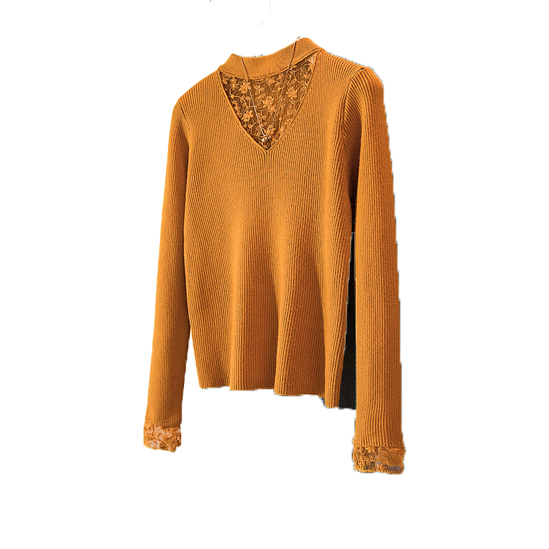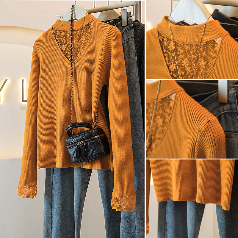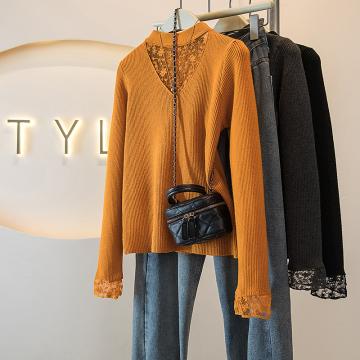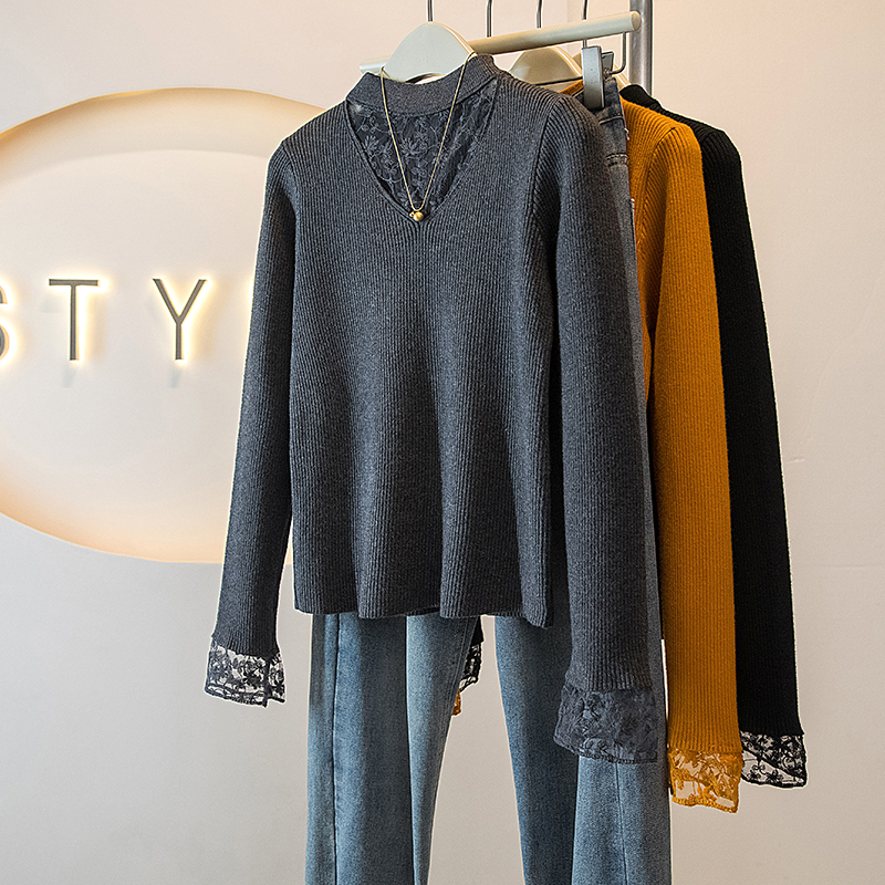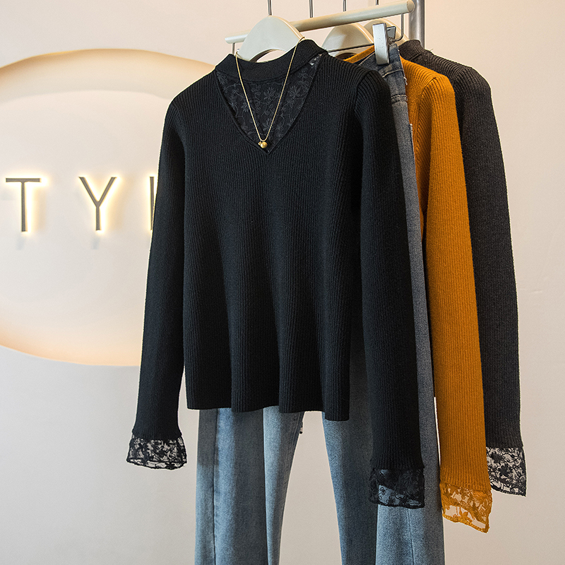 FA51551# 大码冬季女装新款韩版蕾丝网纱拼接假两件设计显瘦针织上衣 服裝批發女裝批發服飾貨源