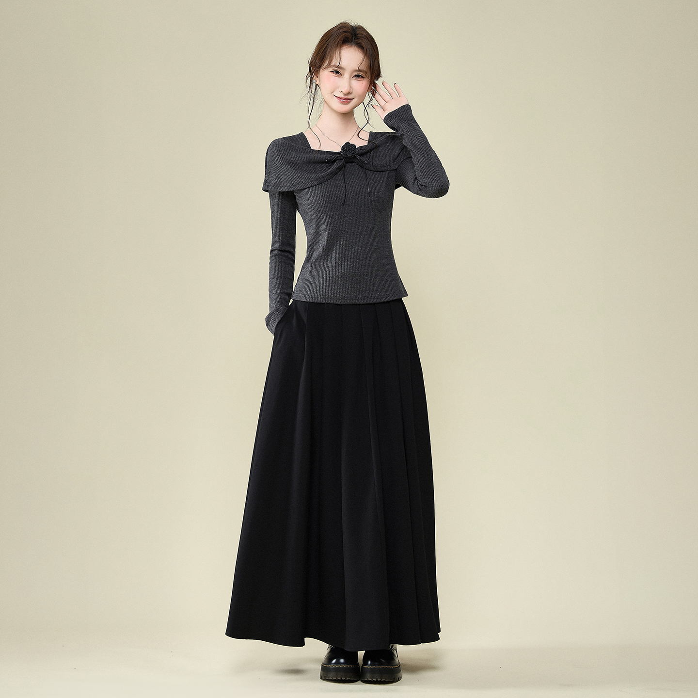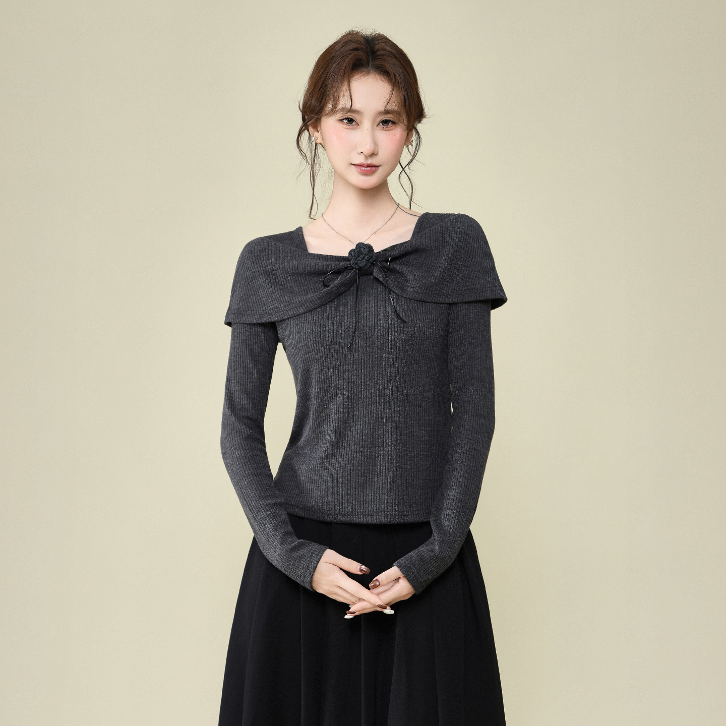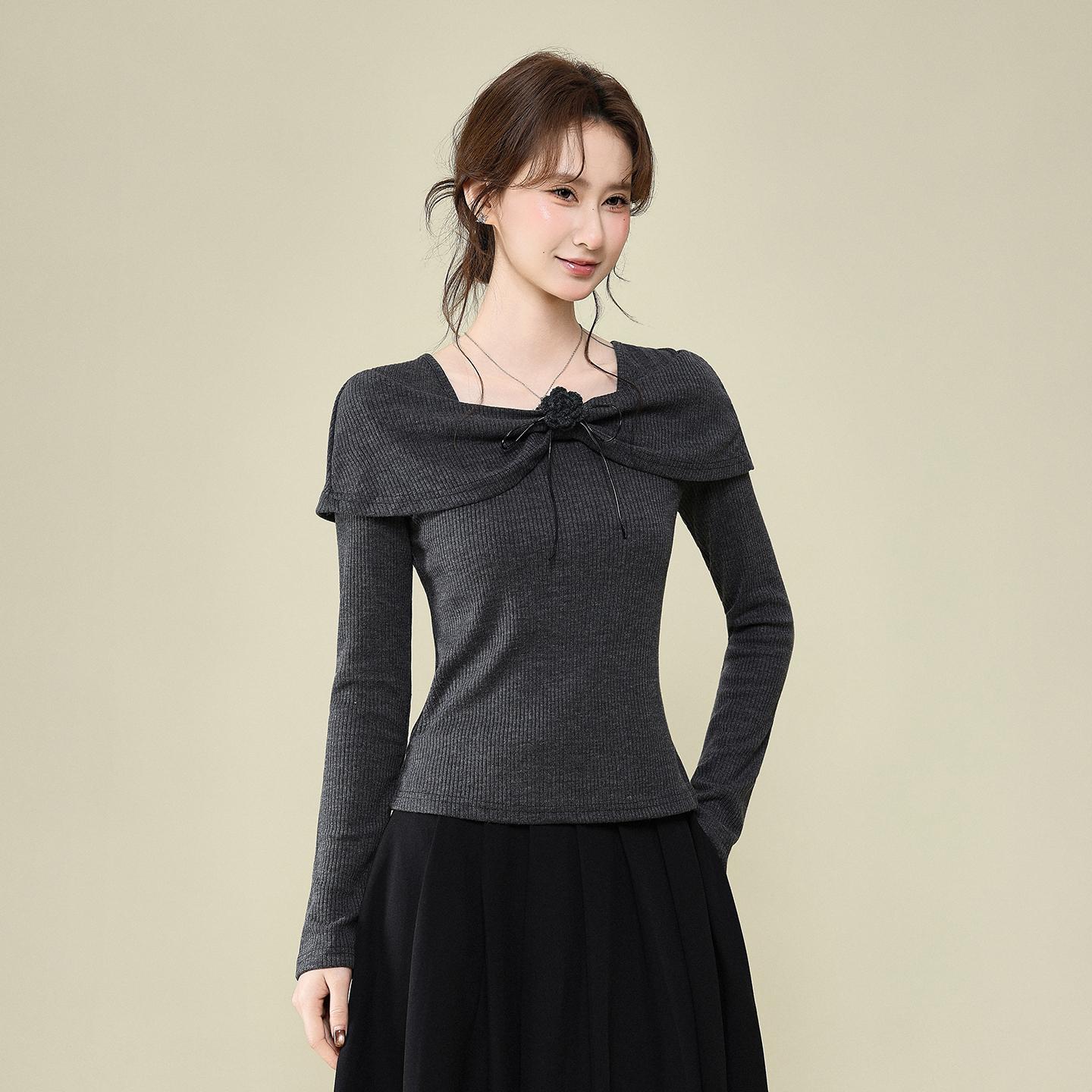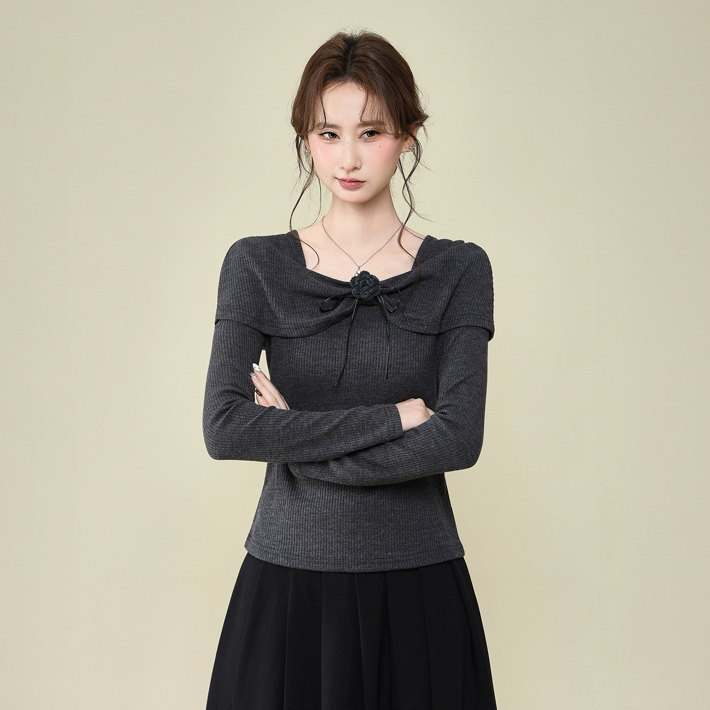 FA51832# 深灰色设计感花朵T恤长袖女冬季高级百搭针织打底衫上衣 服裝批發女裝批發服飾貨源