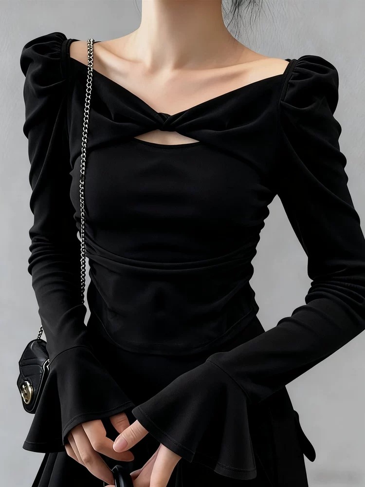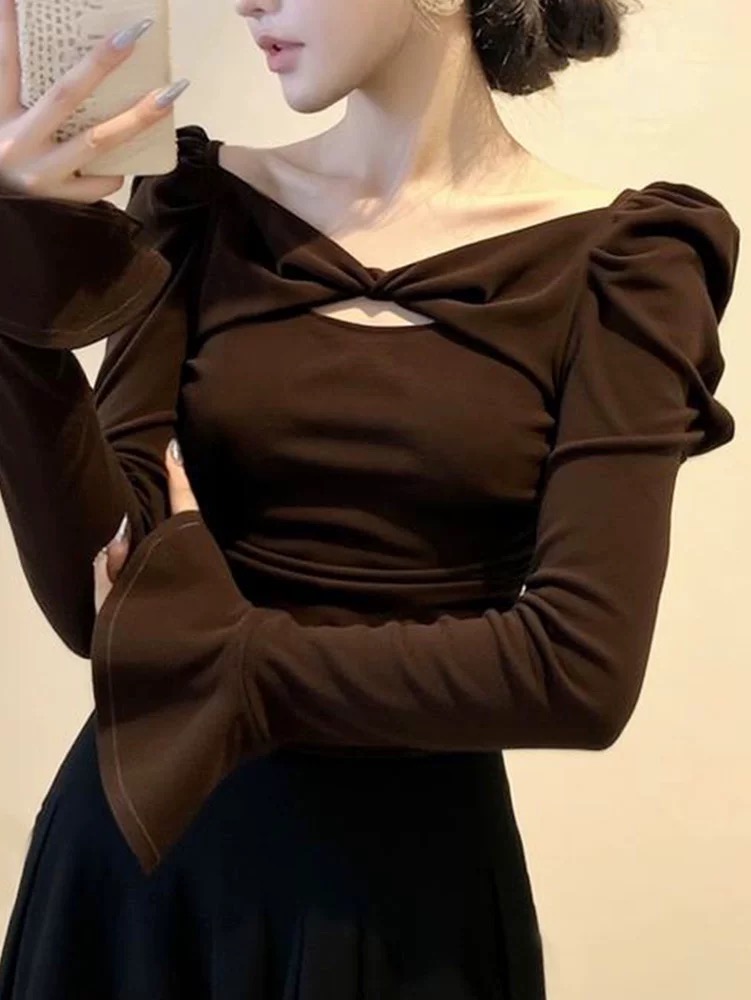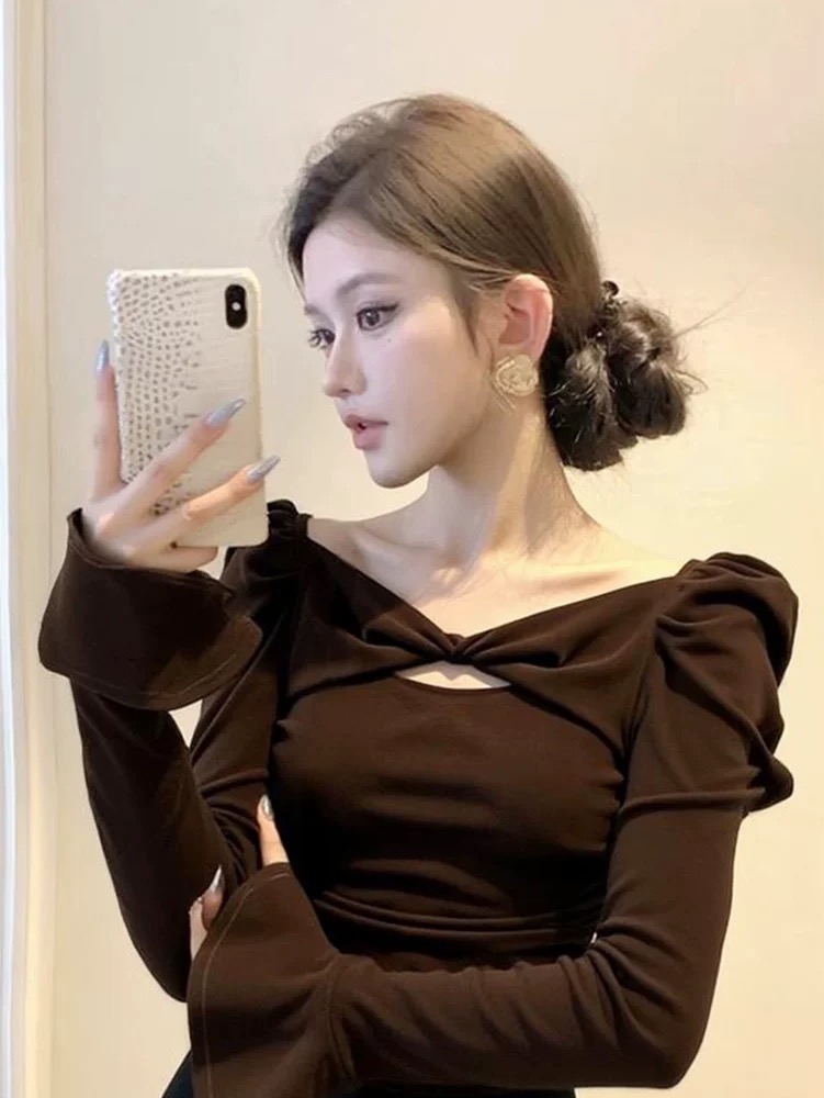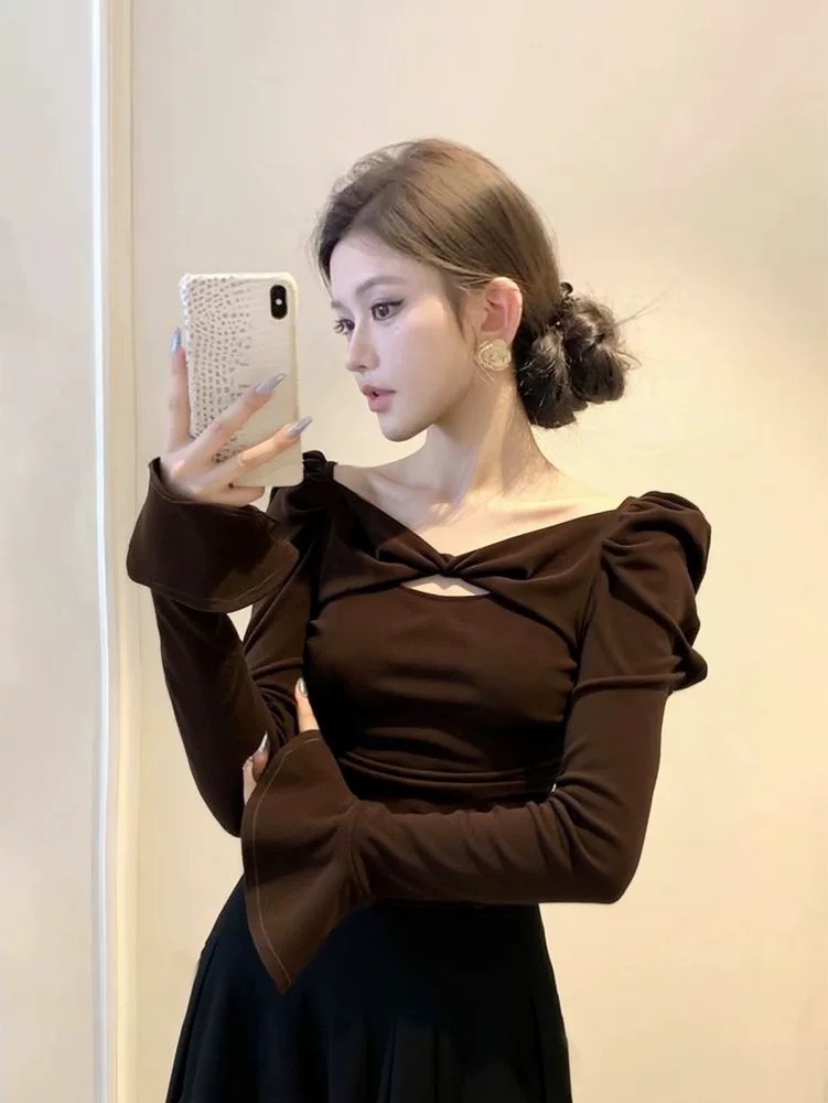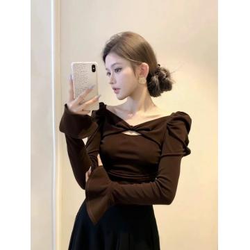 FA51841# 高端小资小上衣轻奢高级感法式气质职业蝴蝶结镂空咖色打底衫 服裝批發女裝批發服飾貨源