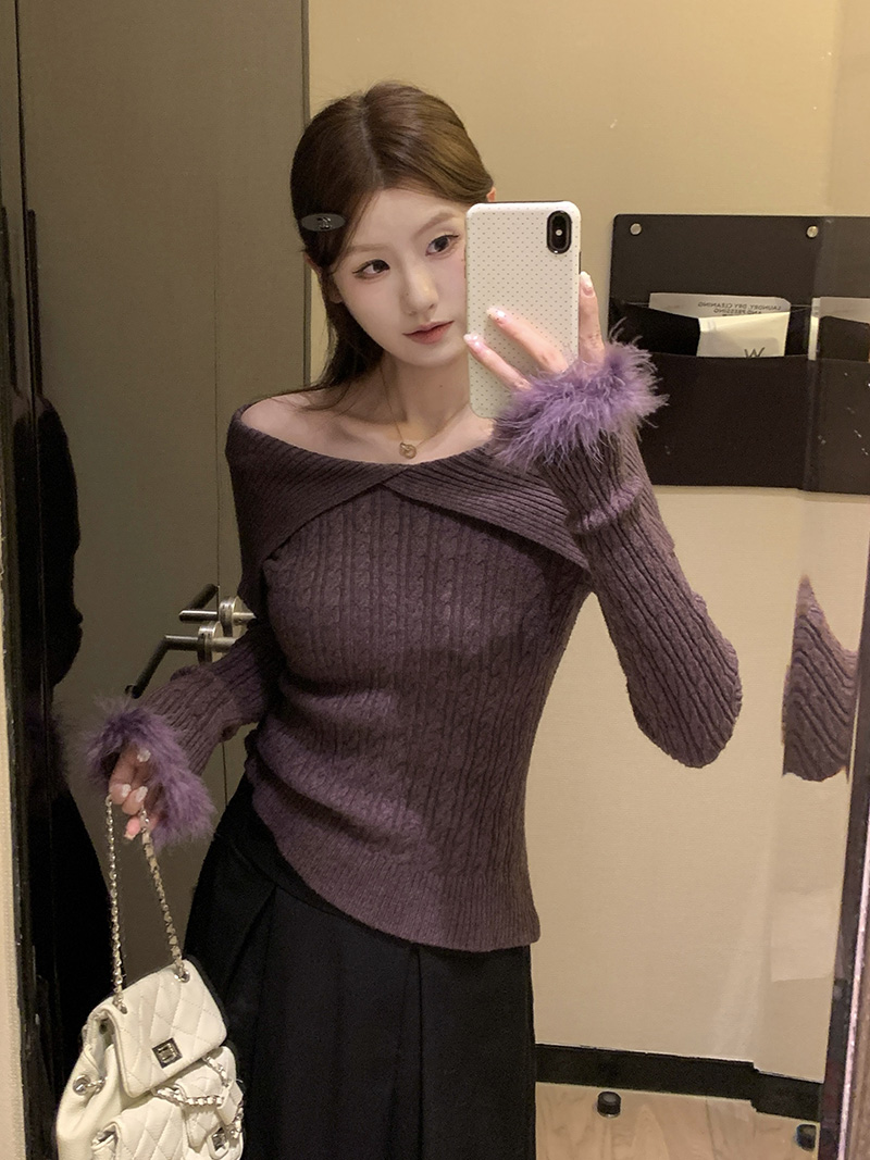 FA51842# 秋冬新款气质毛毛袖一字肩翻领针织衫上衣 服裝批發女裝批發服飾貨源