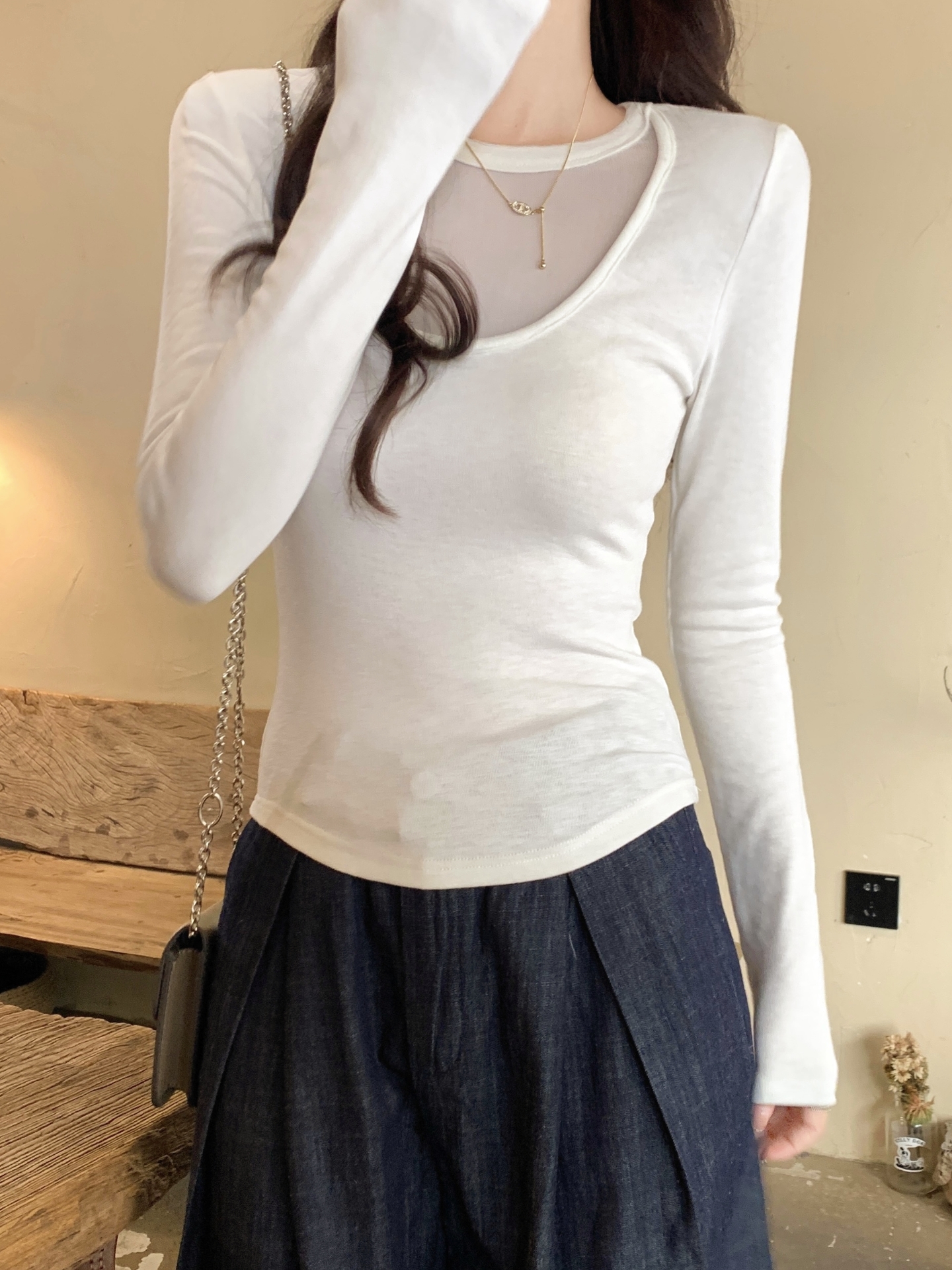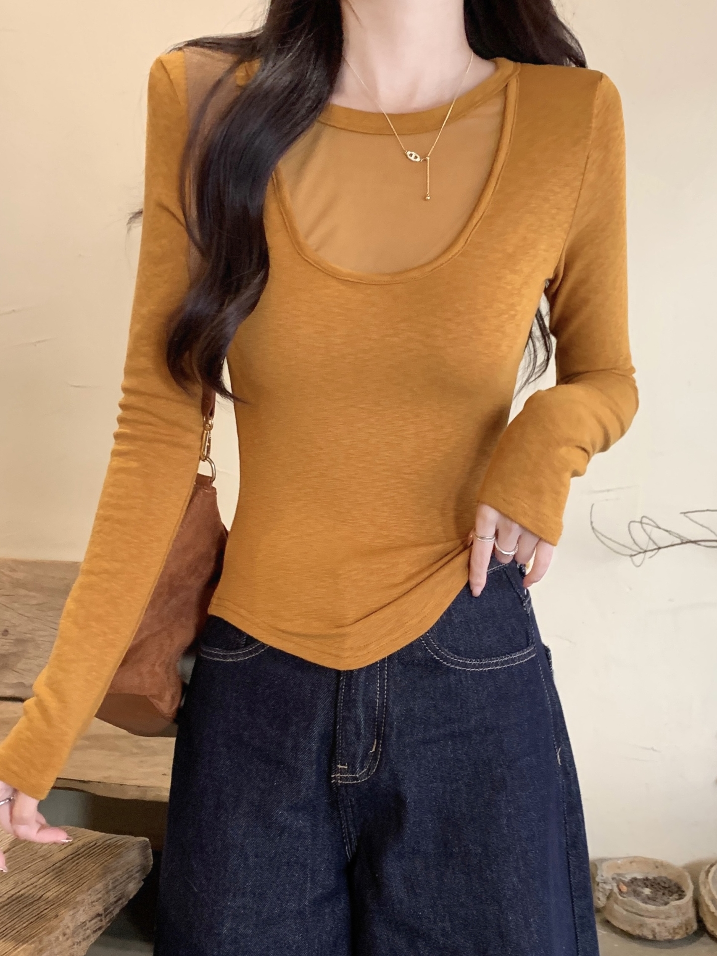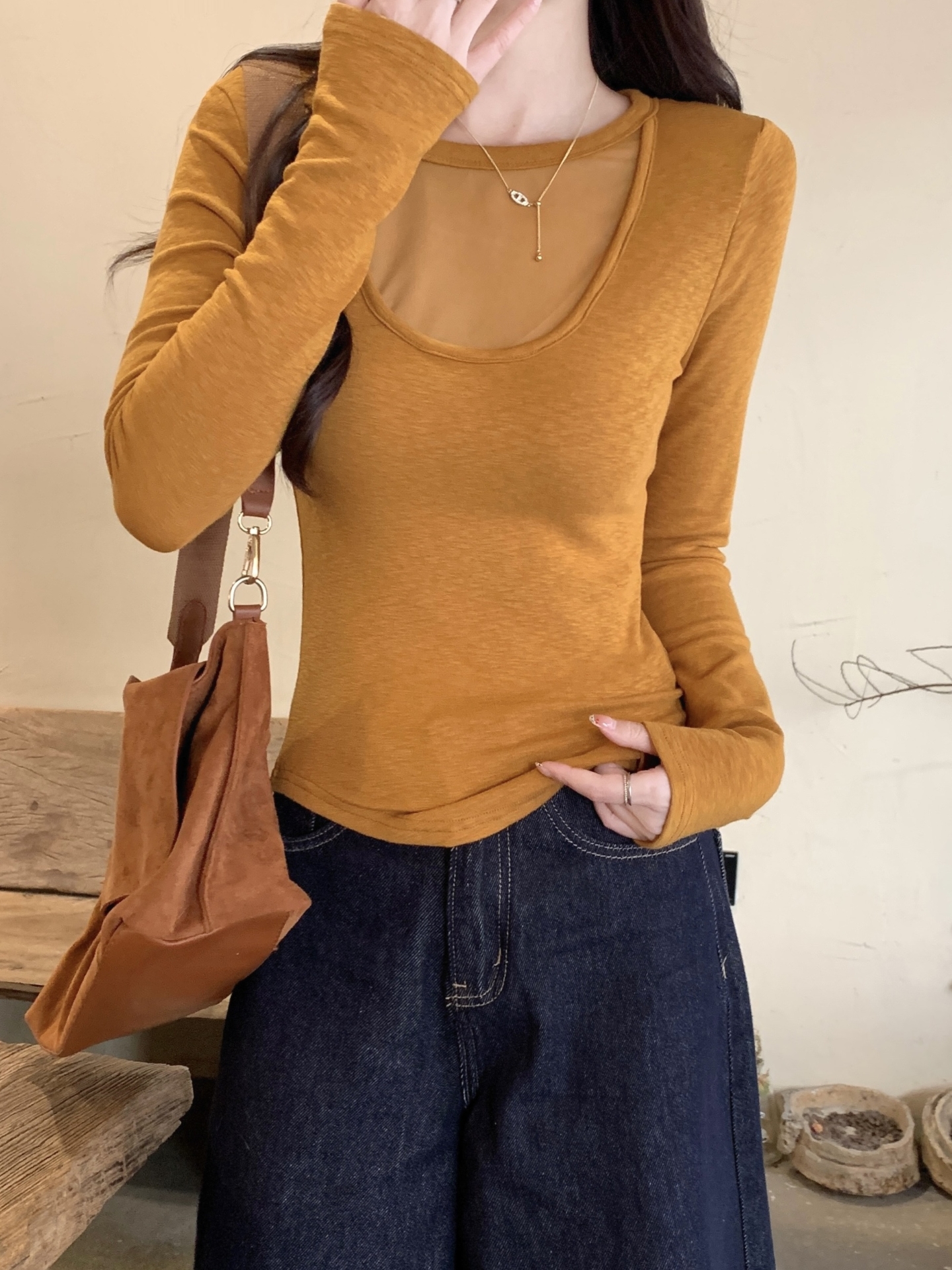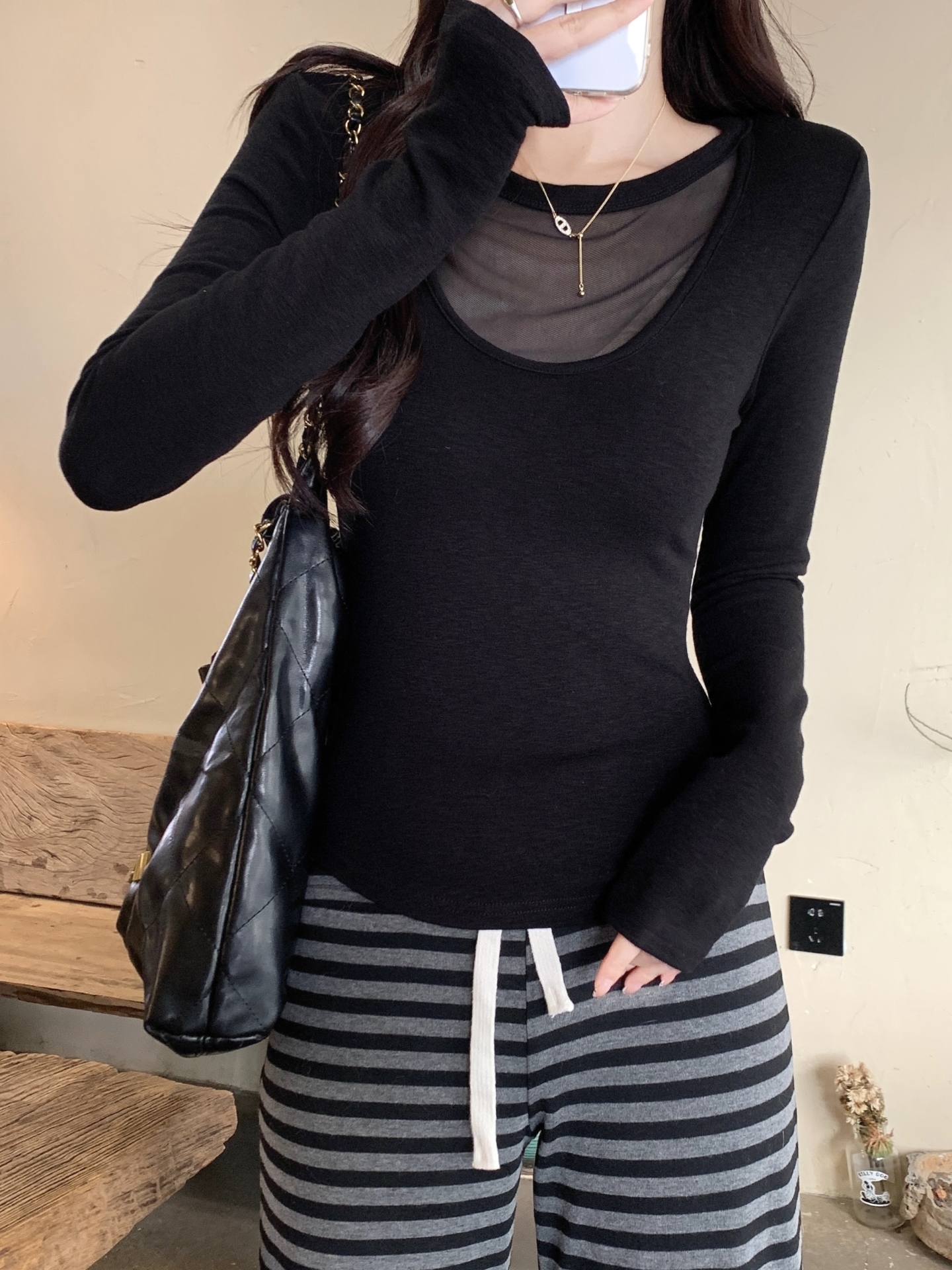 FA51854# 高级感网纱拼接U领磨毛长袖t恤女冬季新款修身短款打底衫上衣 服裝批發女裝批發服飾貨源