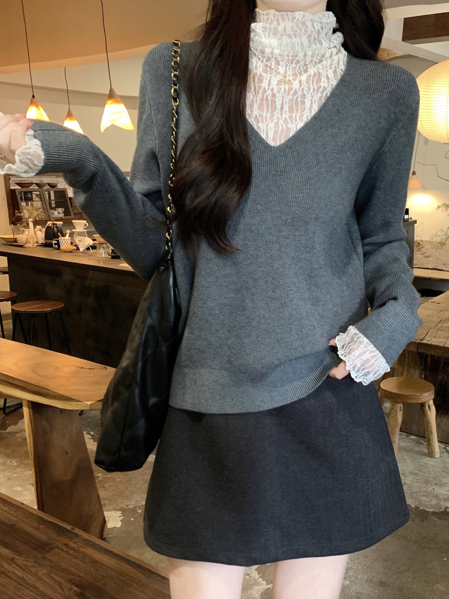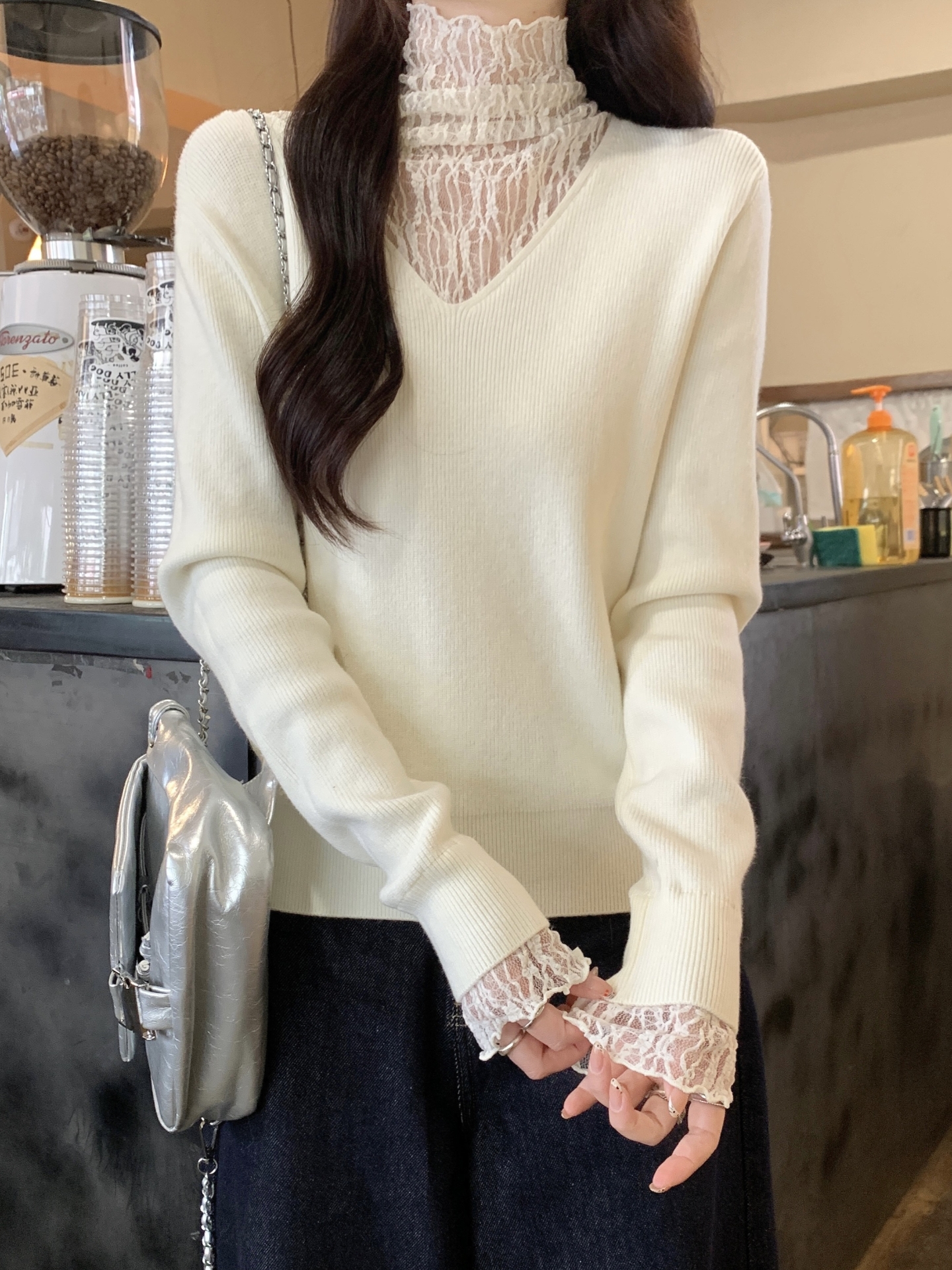 FA51861# 高级感气质蕾丝假两件长袖针织衫女冬季新款洋气时髦毛衣上衣 服裝批發女裝批發服飾貨源