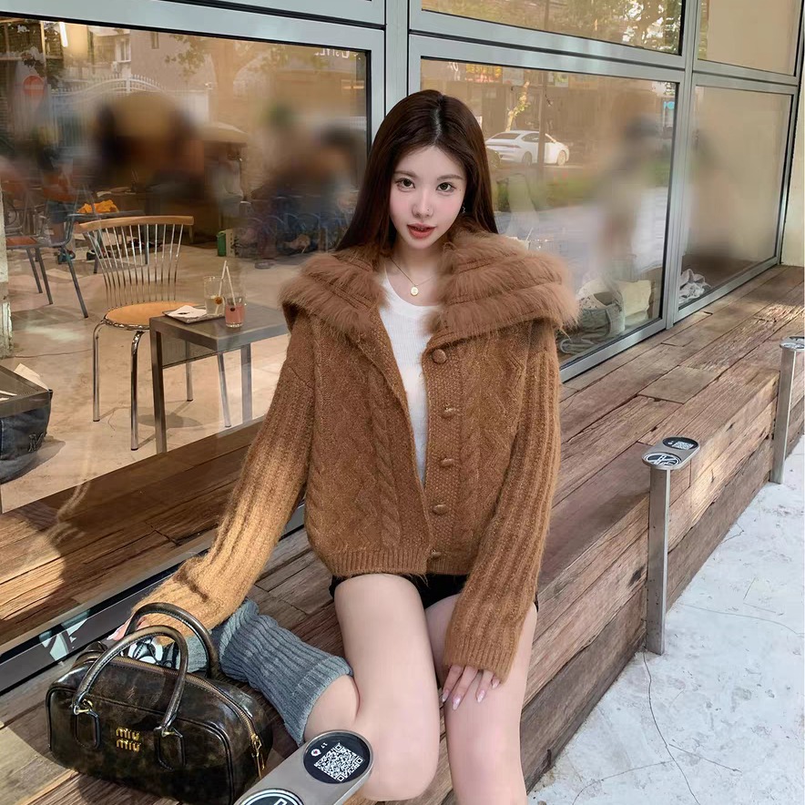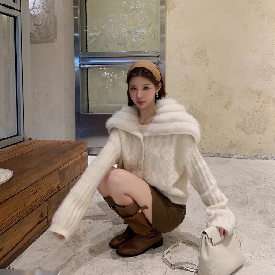 FA51875# 韩女千金羊毛狐狸毛大翻领毛衣针织衫女海军领短款外套25新 服裝批發女裝批發服飾貨源