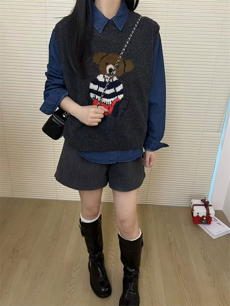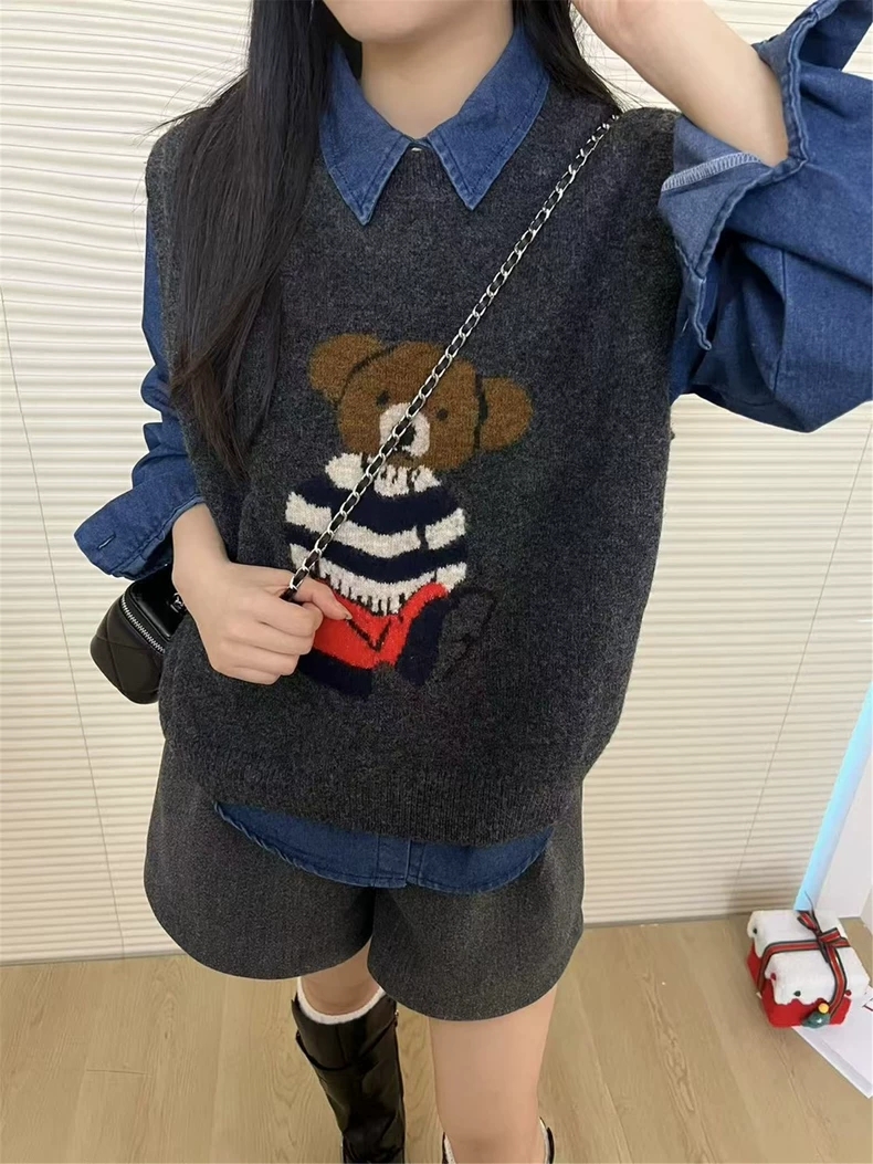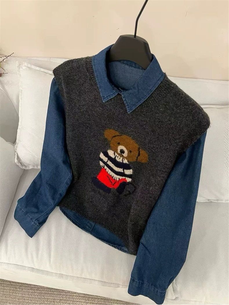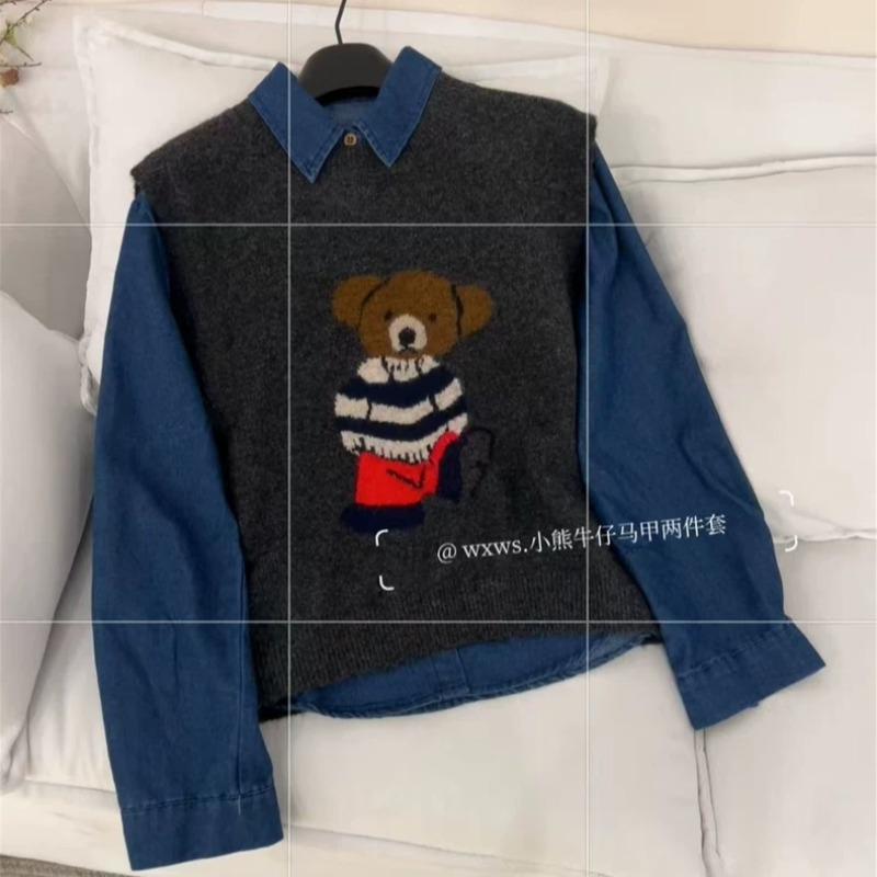 FA51879# 春装新款卡通小熊图案圆领牛仔针织马甲女宽松显瘦毛衣两件套 服裝批發女裝批發服飾貨源