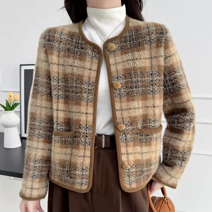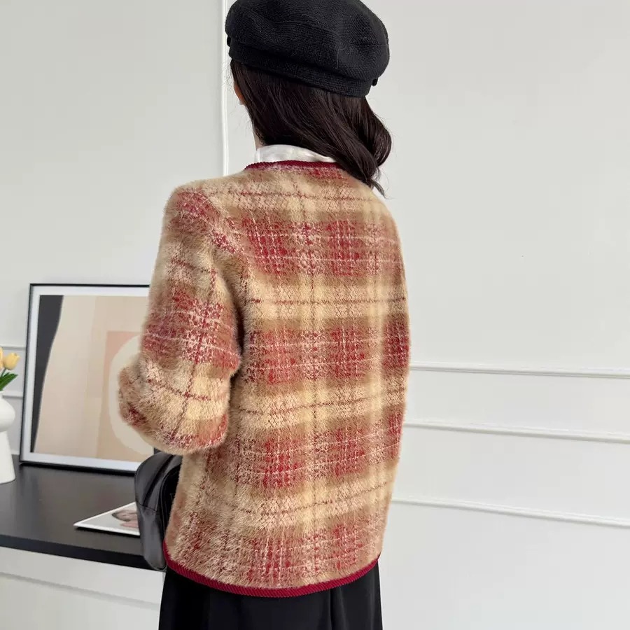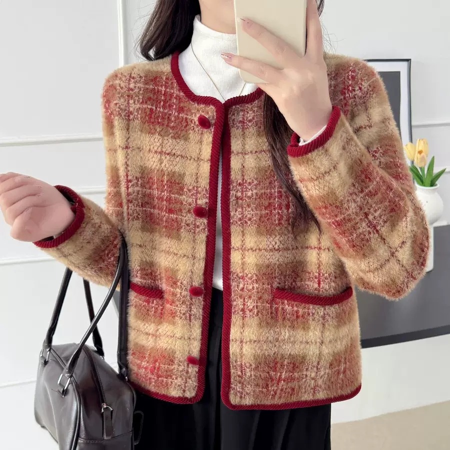 FA51899# 小香风格子短款水貂毛休闲外套女秋冬新款设计感针织开衫上衣 服裝批發女裝批發服飾貨源