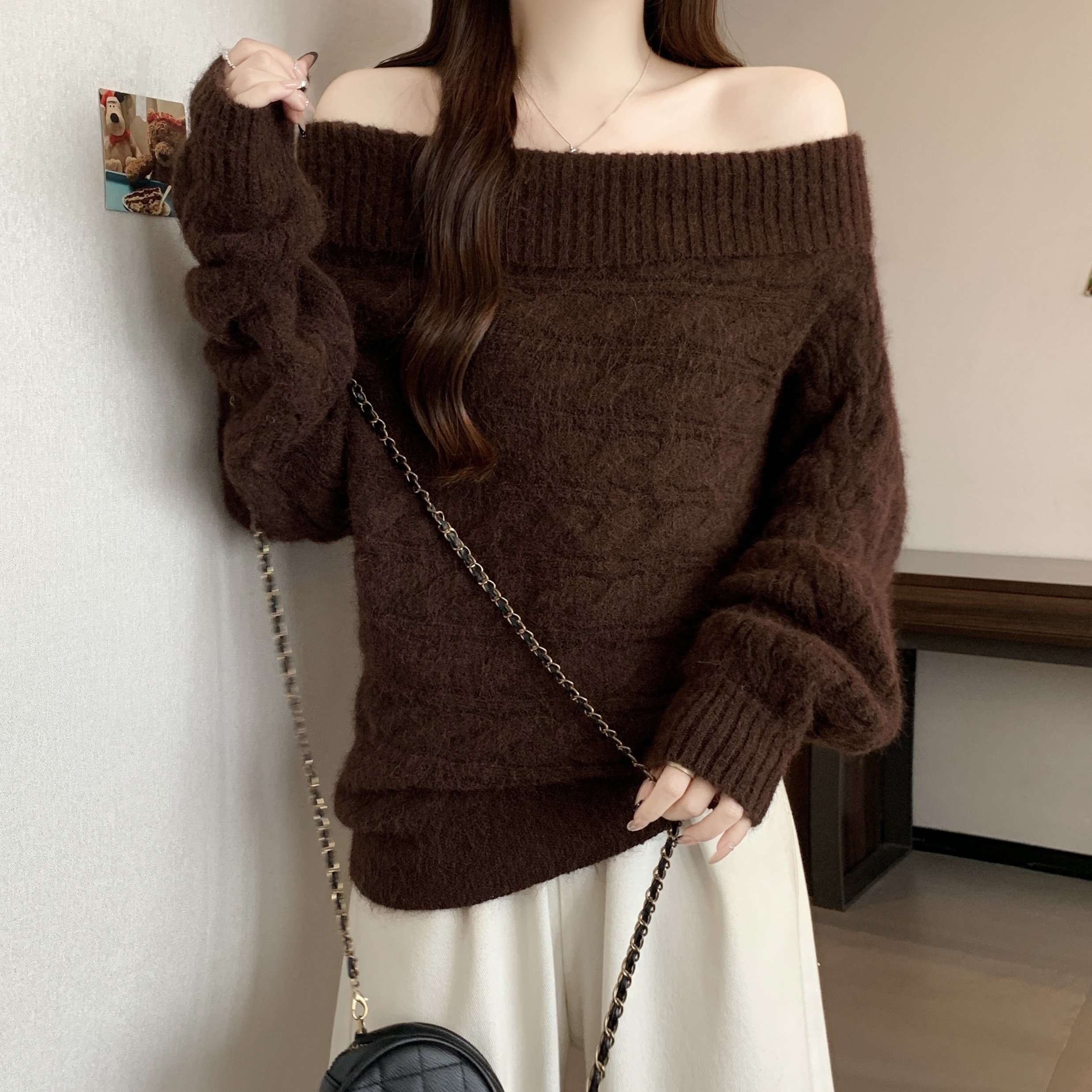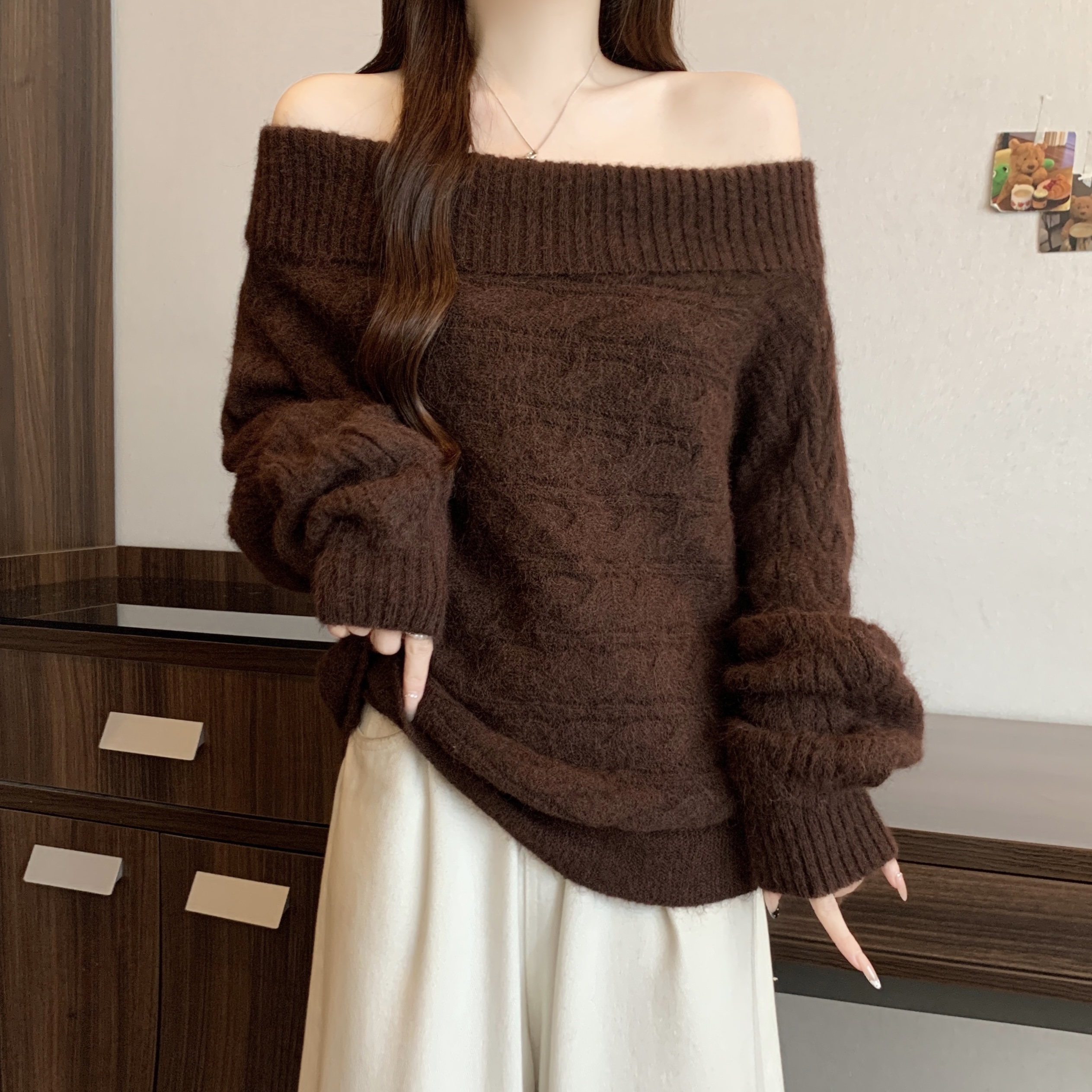 FA51911# 美拉德咖色一字肩毛衣女新款冬季大码胖mm气质独特针织衫上衣 服裝批發女裝批發服飾貨源