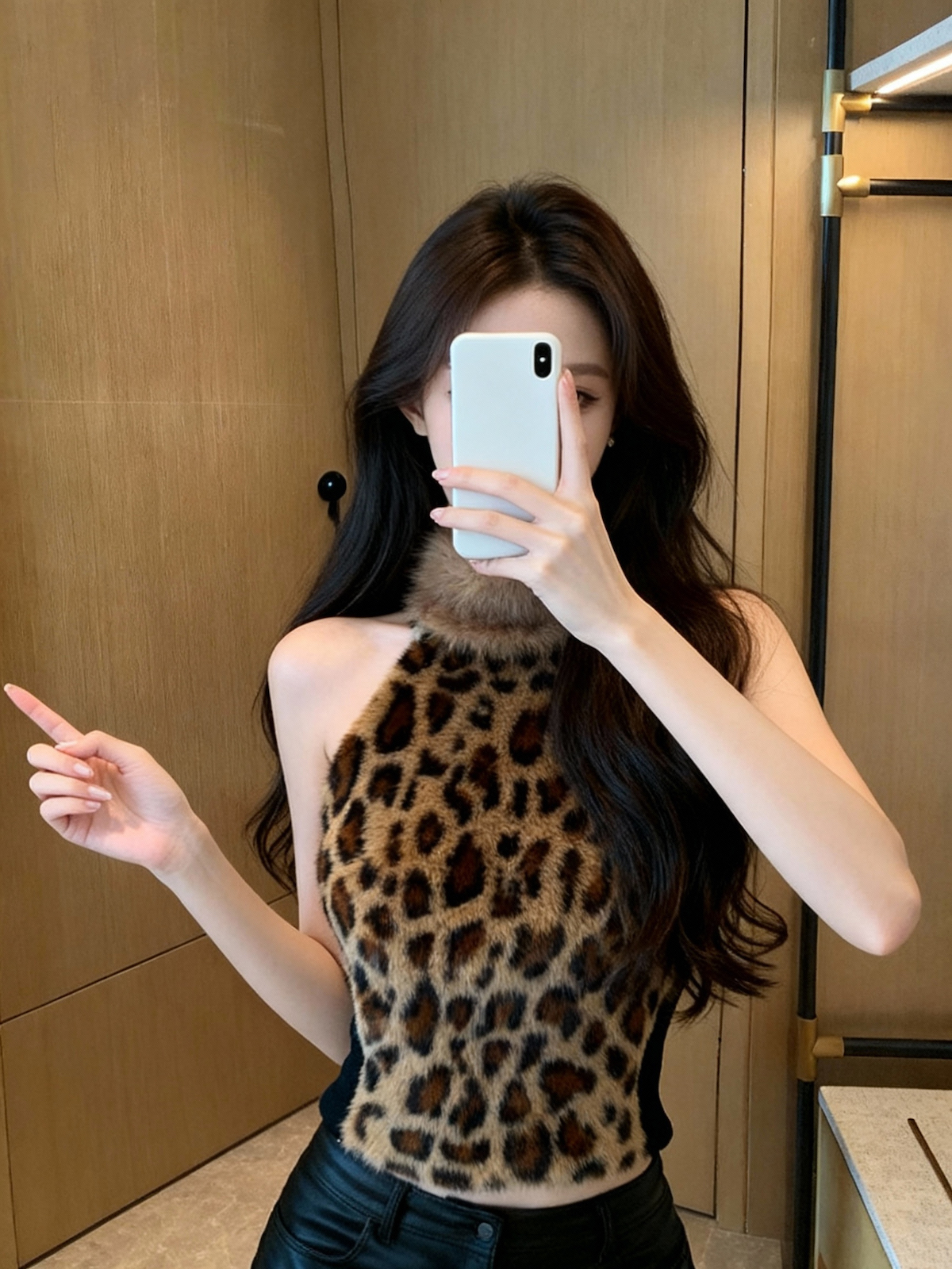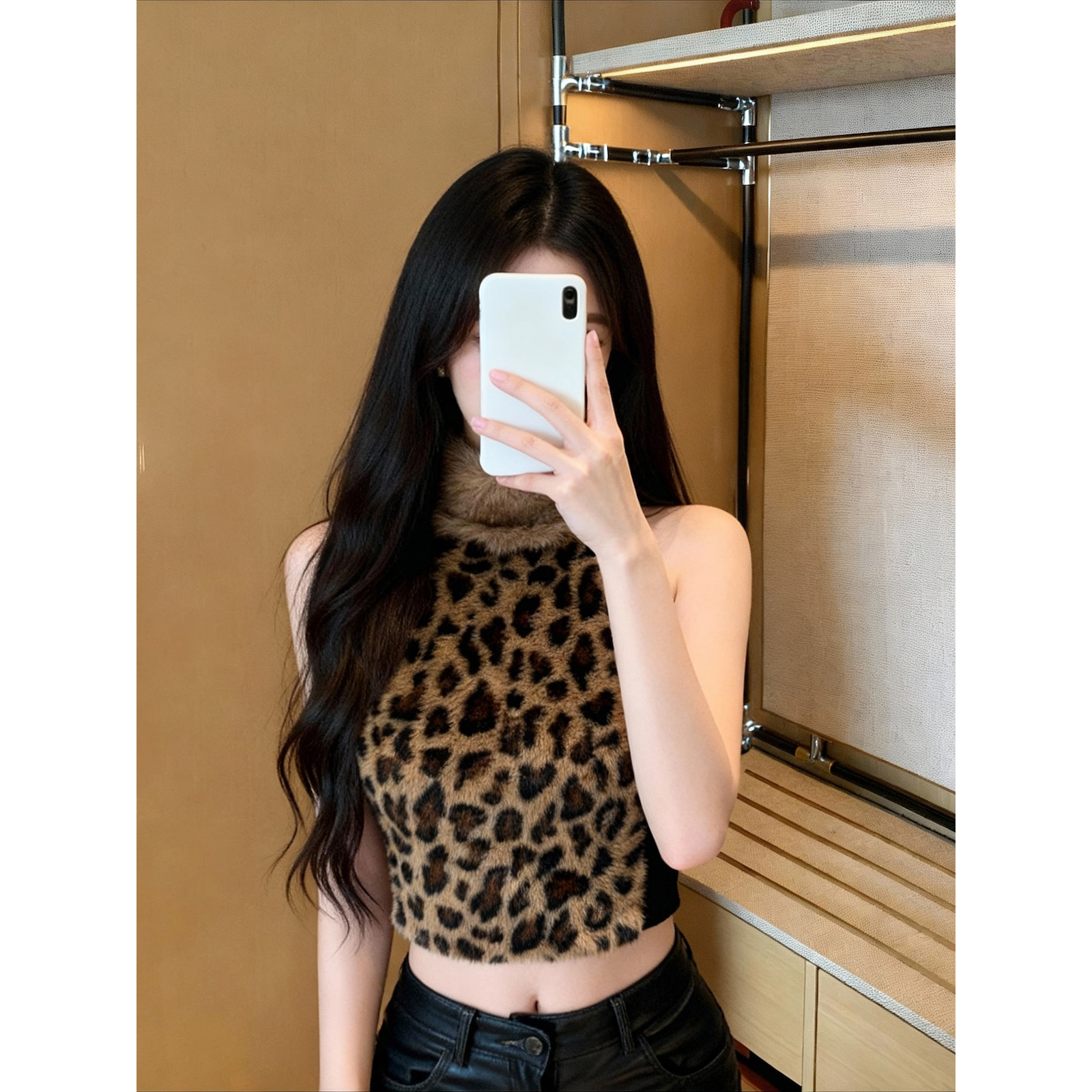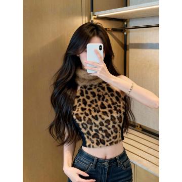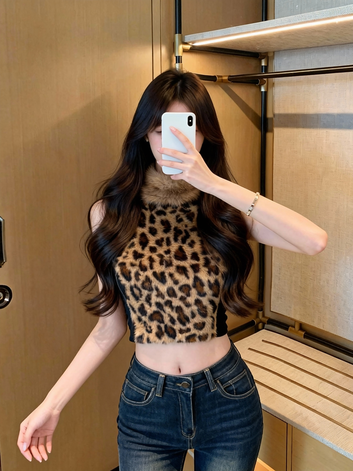 FA51924# 豹纹毛毛领t恤女秋冬美式辣妹袖套上衣半高领 服裝批發女裝批發服飾貨源
