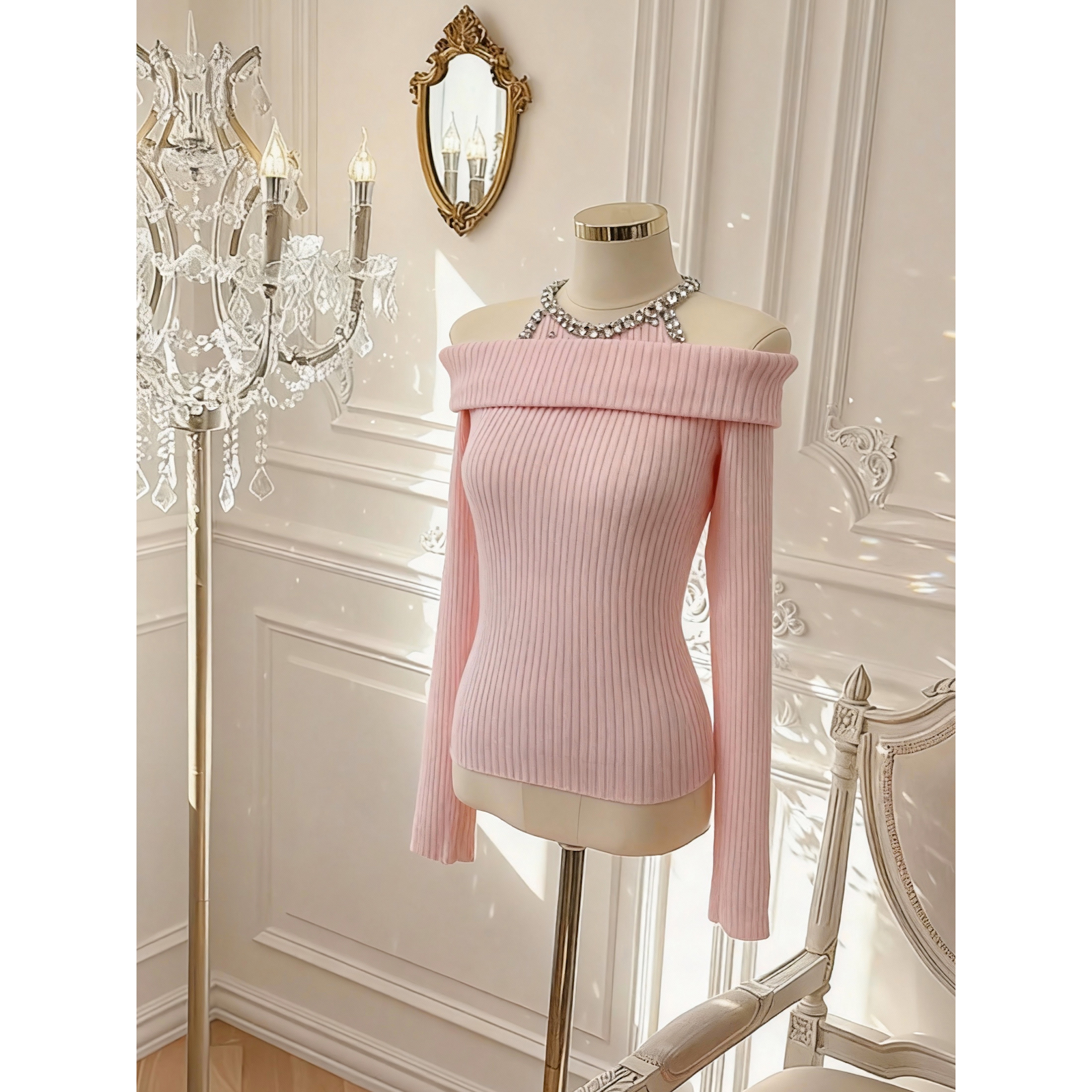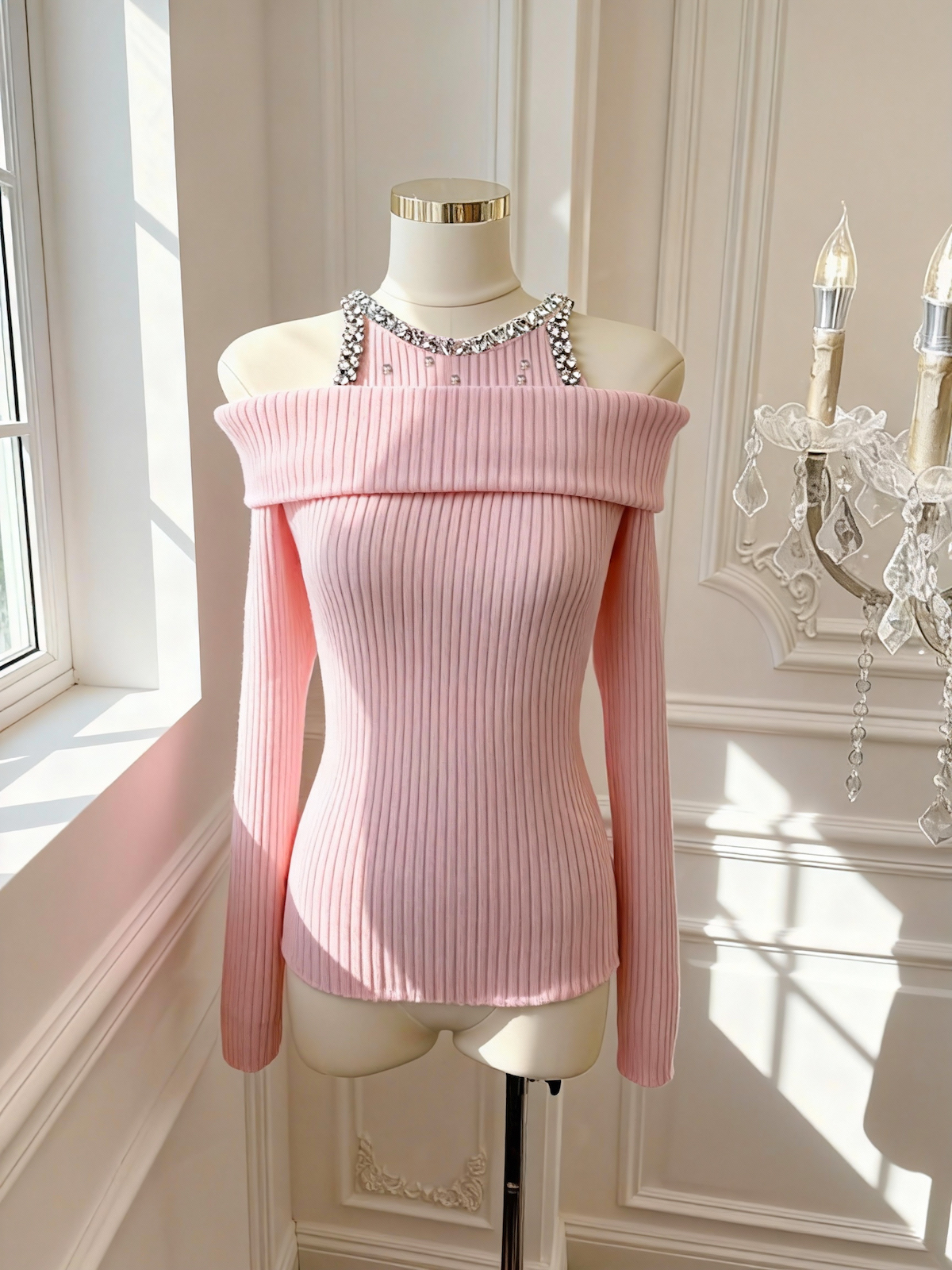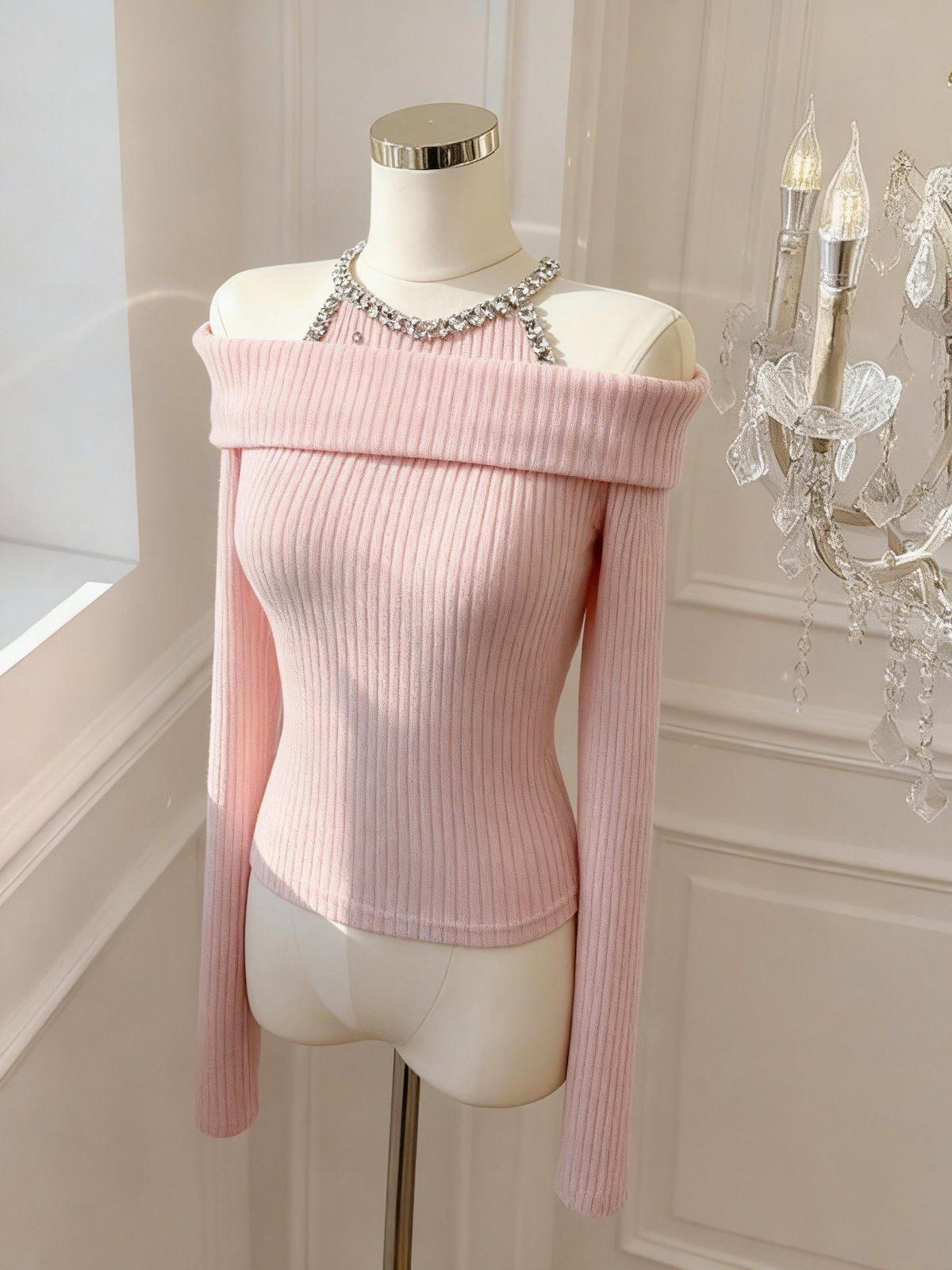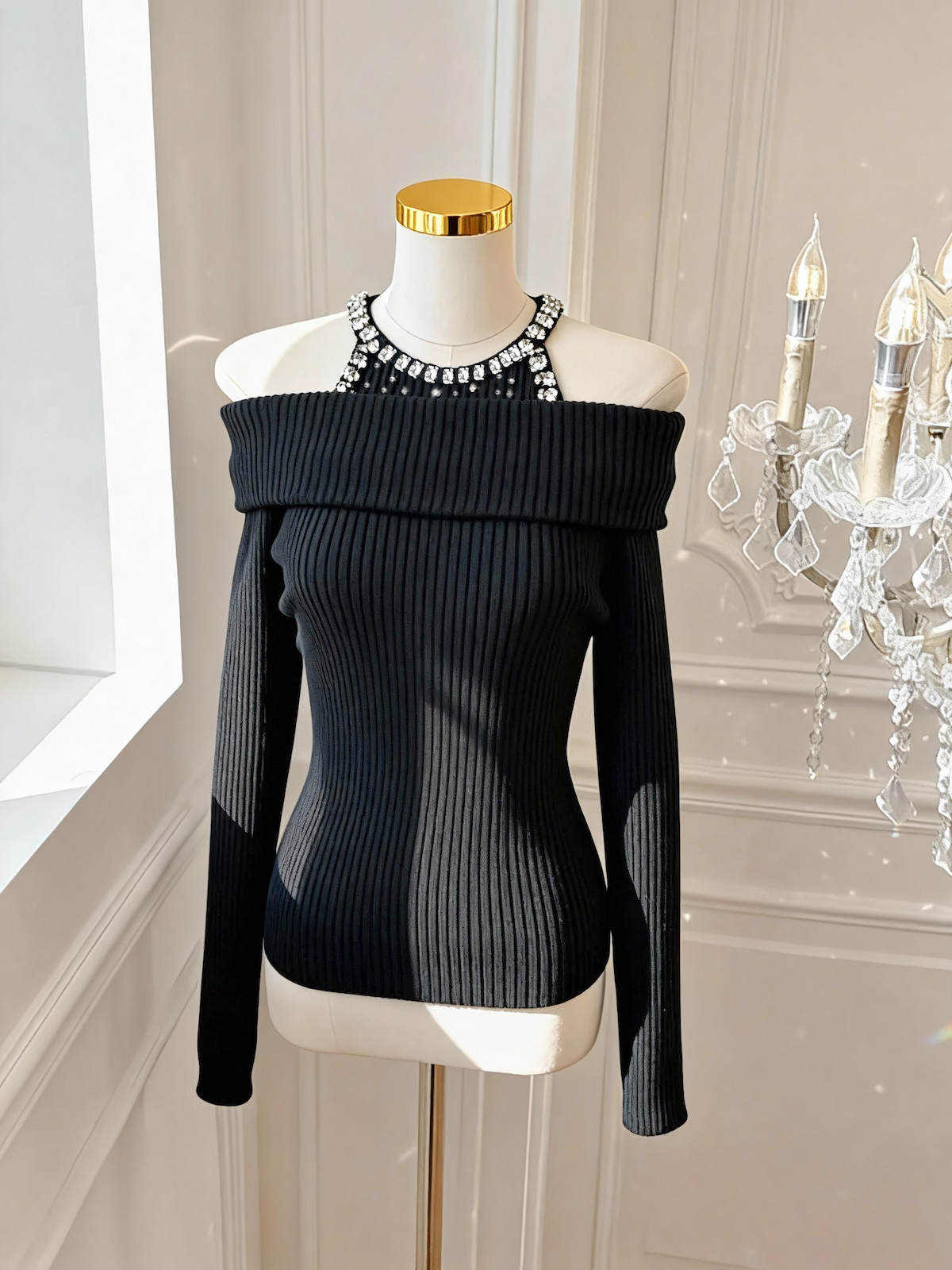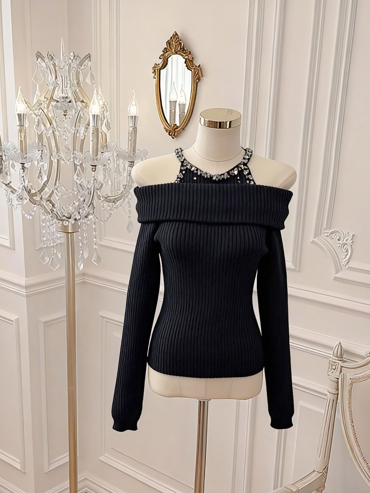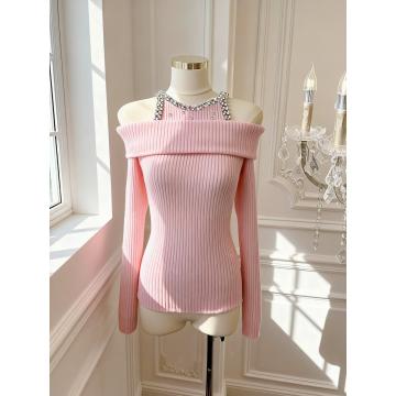 FA51934# 韩版纯欲风重工镶钻设计感修身显瘦百搭露肩针织上衣 服裝批發女裝批發服飾貨源