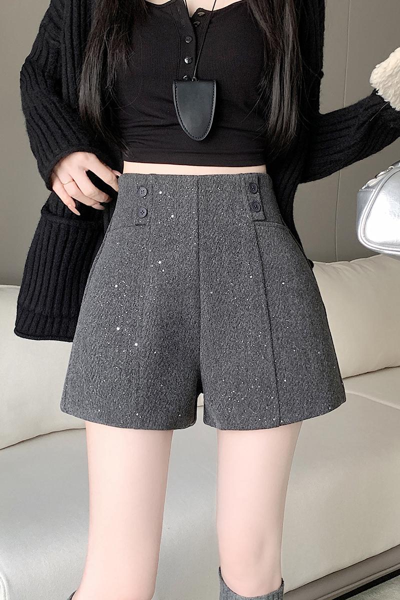 FA51936# 灰色高腰闪亮a字毛呢阔腿短裤女冬款新款休闲显瘦女士靴裤子 服裝批發女裝批發服飾貨源