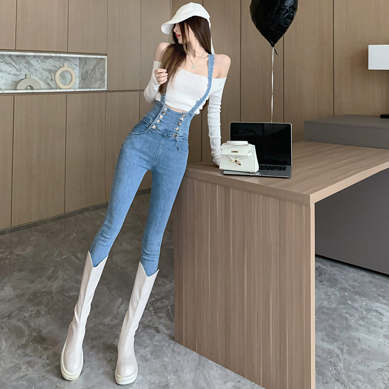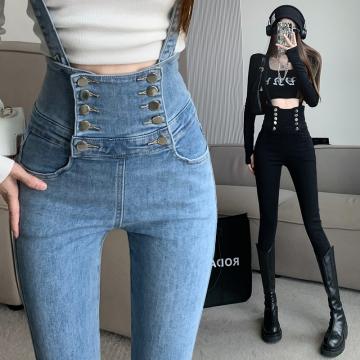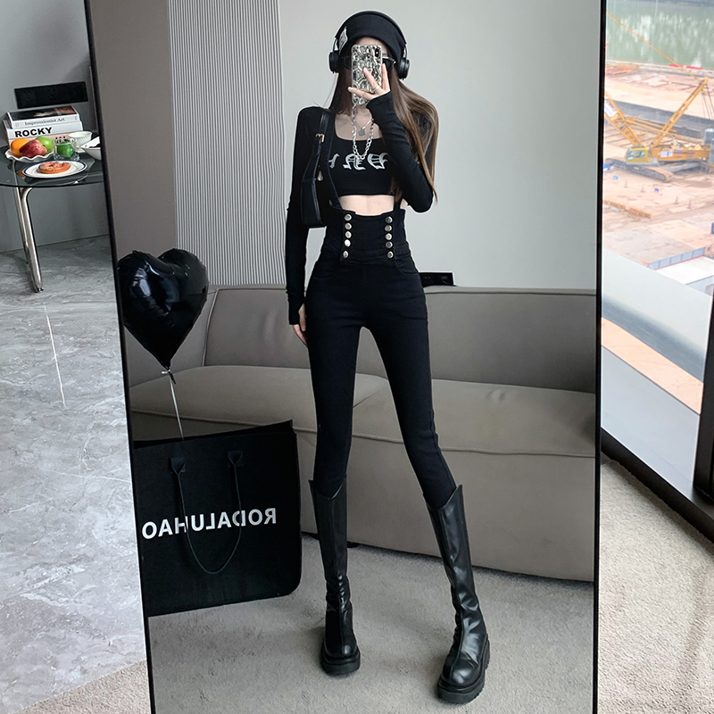 FA54542# 双排扣小脚背带牛仔裤女新款高腰时尚修身毛边铅笔裤潮 服裝批發女裝批發服飾貨源