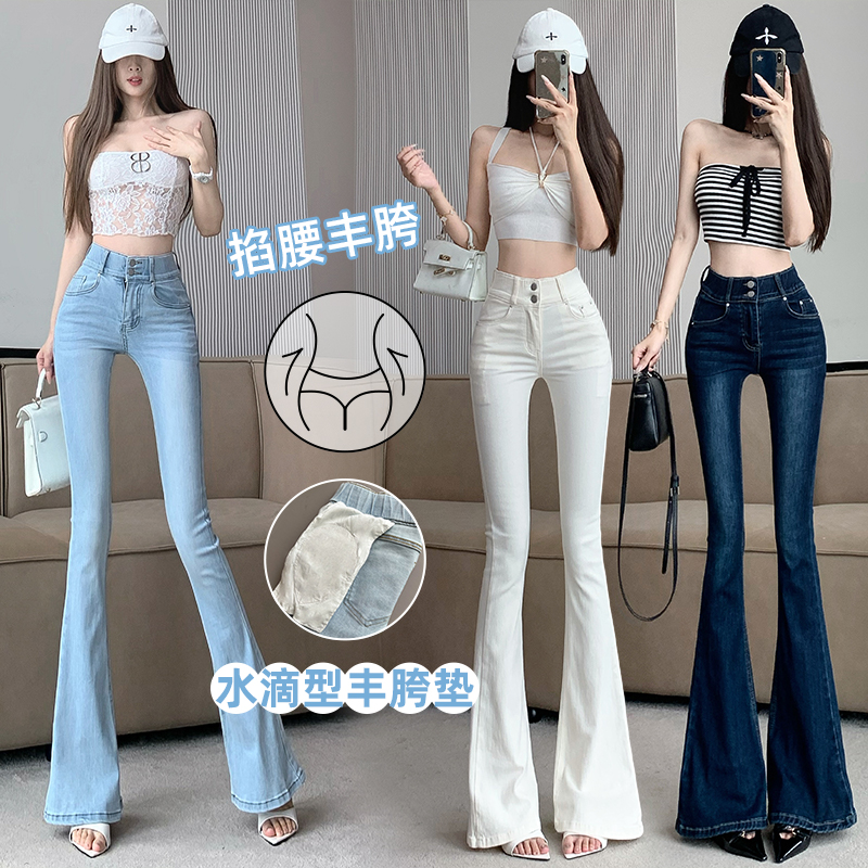 FA54543# 自带丰胯垫韩系纯欲掐腰丰胯双扣高腰弹力微喇叭裤牛仔长裤 服裝批發女裝批發服飾貨源