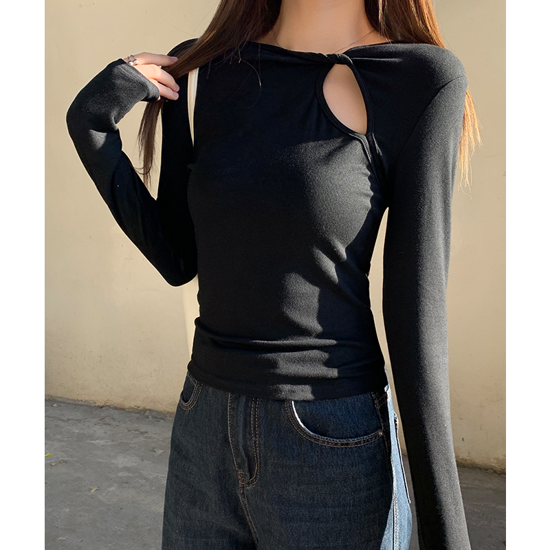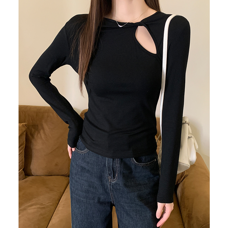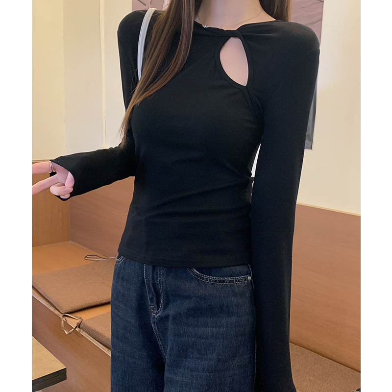 FA54890# 黑色镂空长袖t恤女秋春季设计感辣妹性感修身显瘦上衣 服裝批發女裝批發服飾貨源