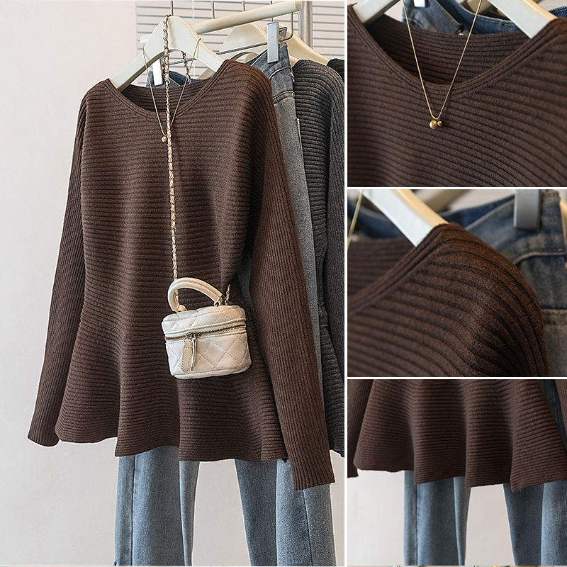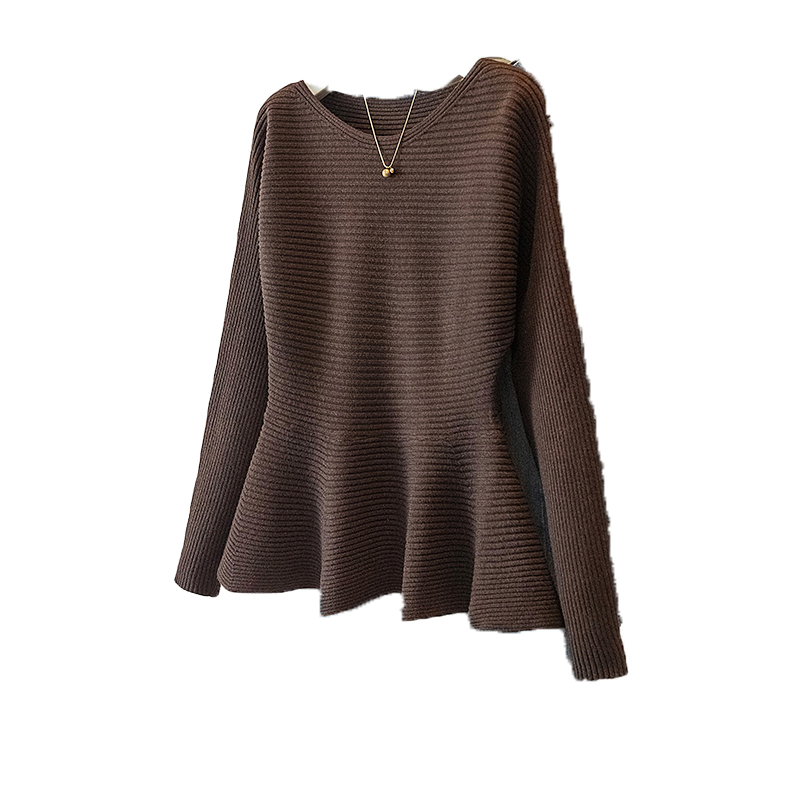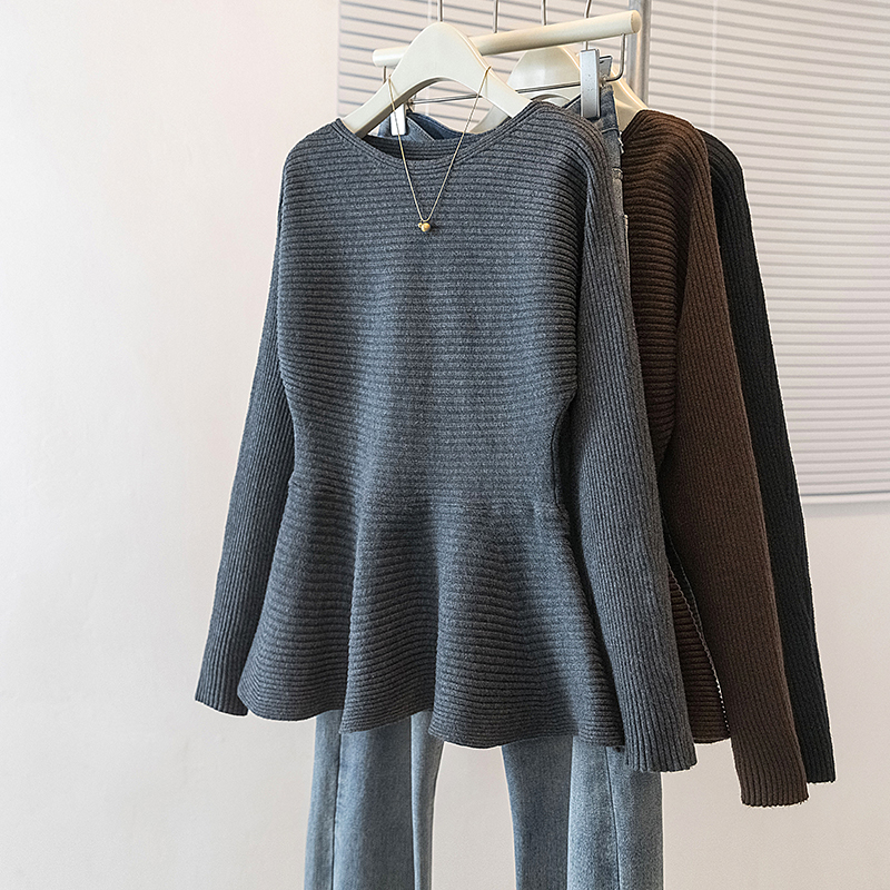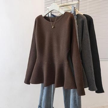 FA54905# 大码女装新款韩版休闲通勤简约圆领修身收腰荷叶边针织上衣 服裝批發女裝批發服飾貨源