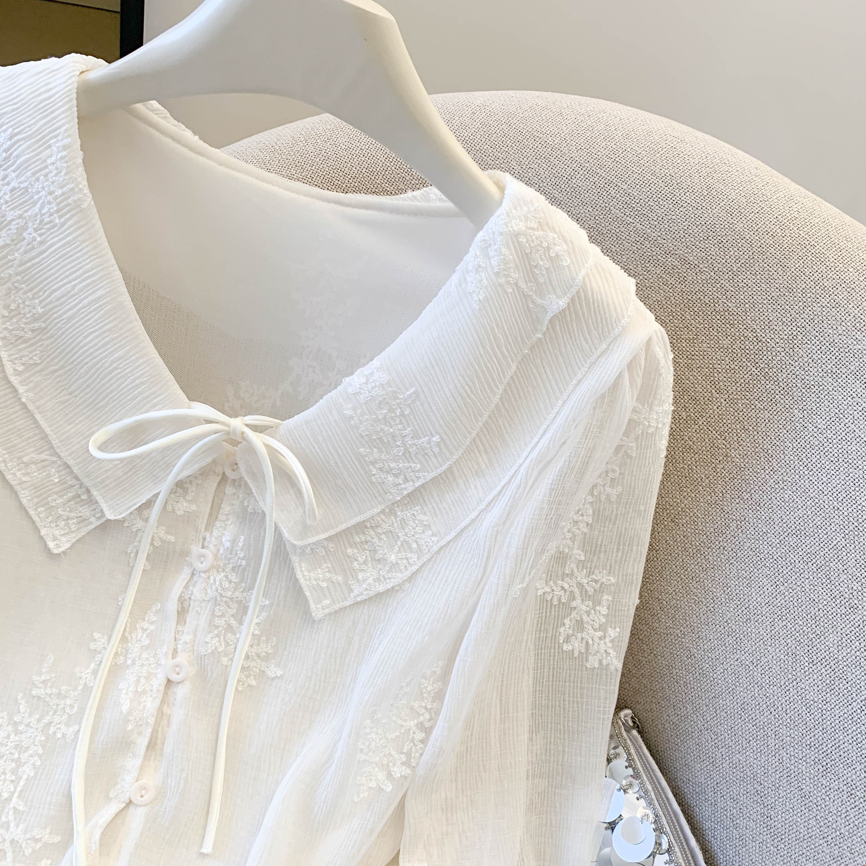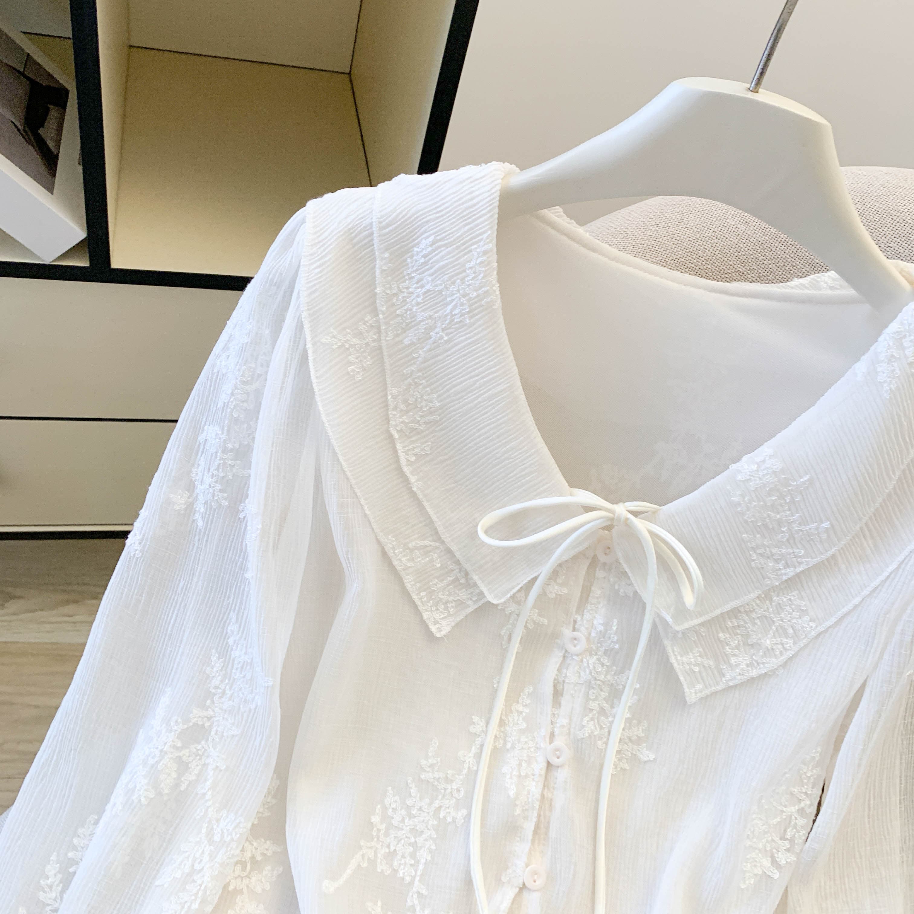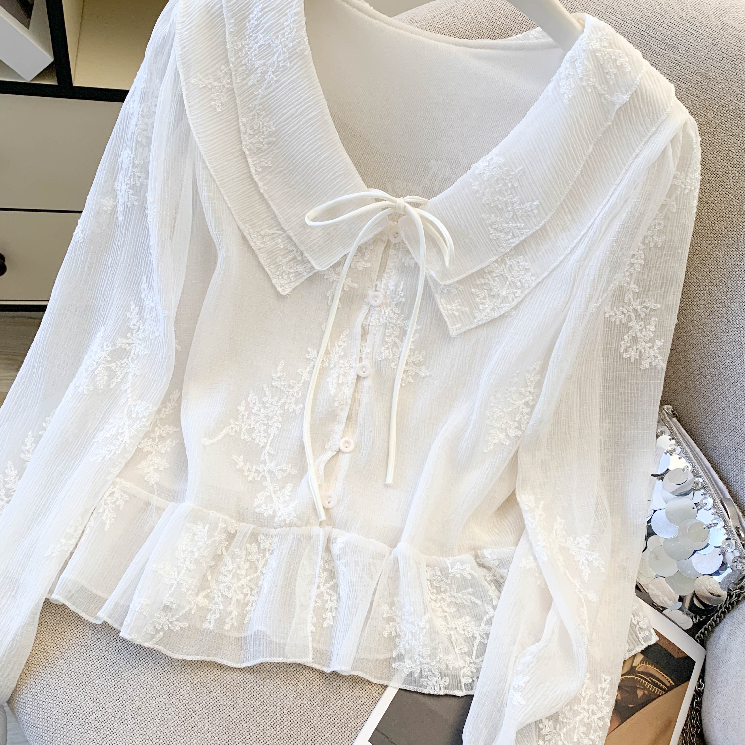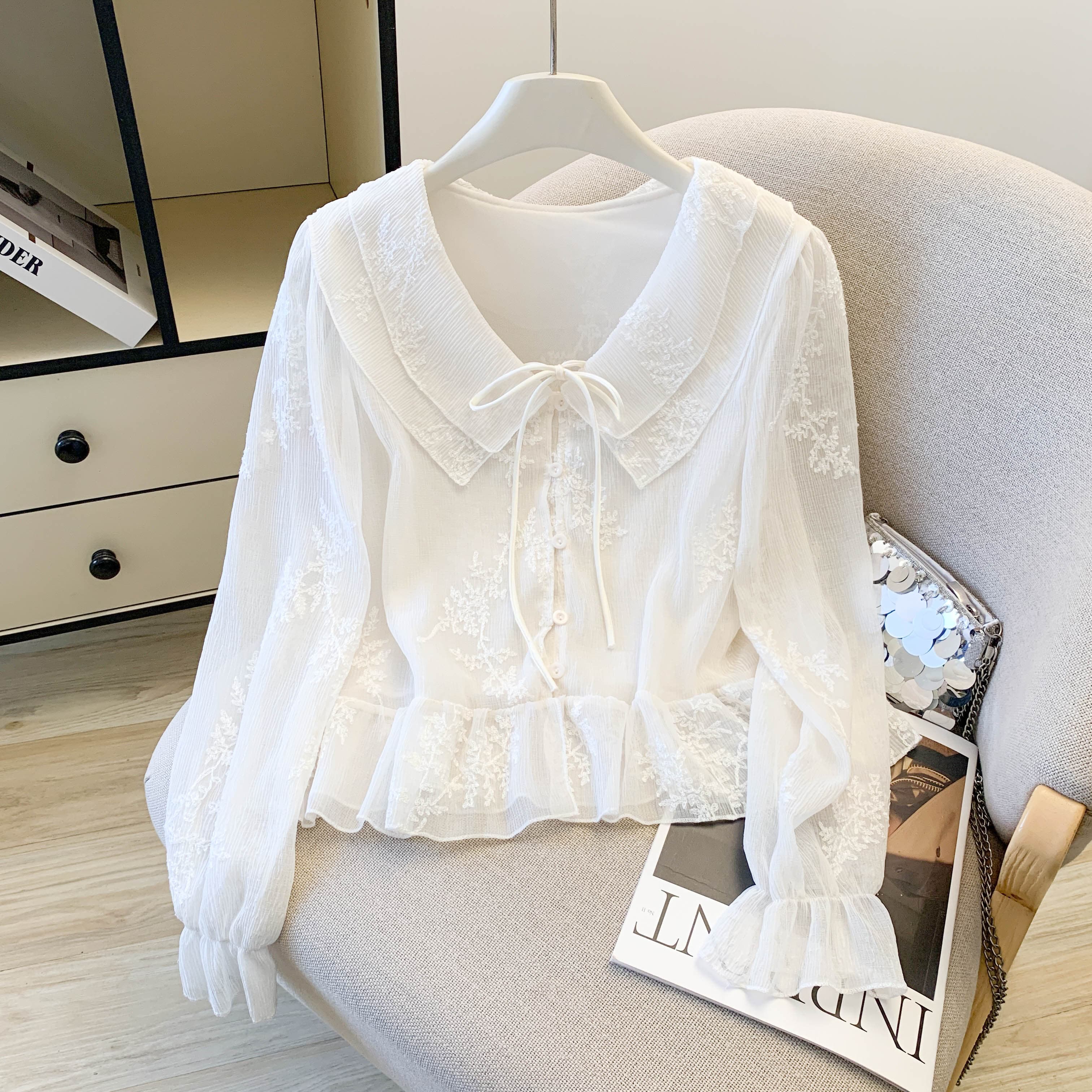 FA54923# 荷叶边V领长袖白衬衫女春季显瘦高级感法式蕾丝提花上衣 服裝批發女裝批發服飾貨源