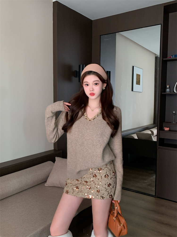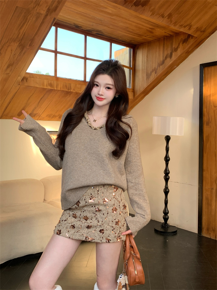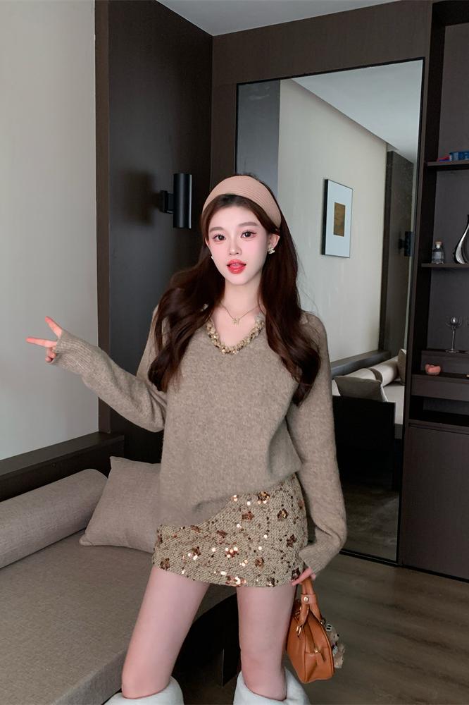 FA55216# 法式轻熟时尚套装女V领纯色简约宽松毛衣女亮片显瘦半裙两件套 服裝批發女裝批發服飾貨源