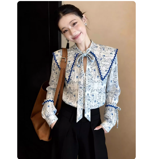 首页 > 长袖雪纺衫、衬衫、上衣 > FA55290# 韩系轻奢氛围感印花领口系带长袖女春季新款减龄超好看上衣 服裝批發女裝批發服飾貨源
