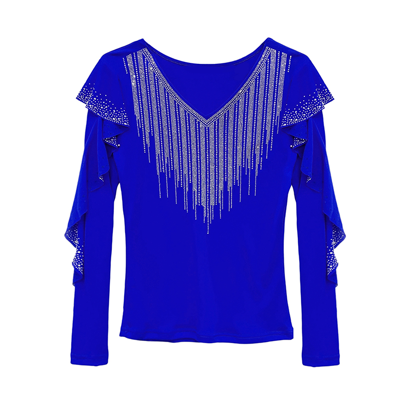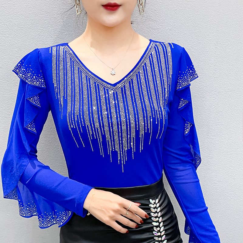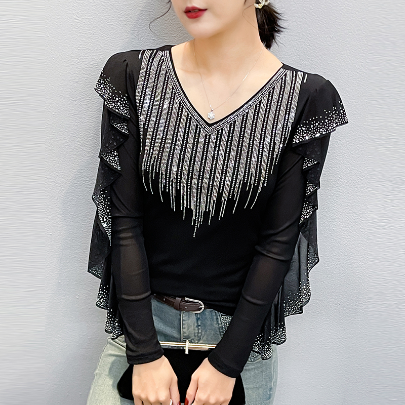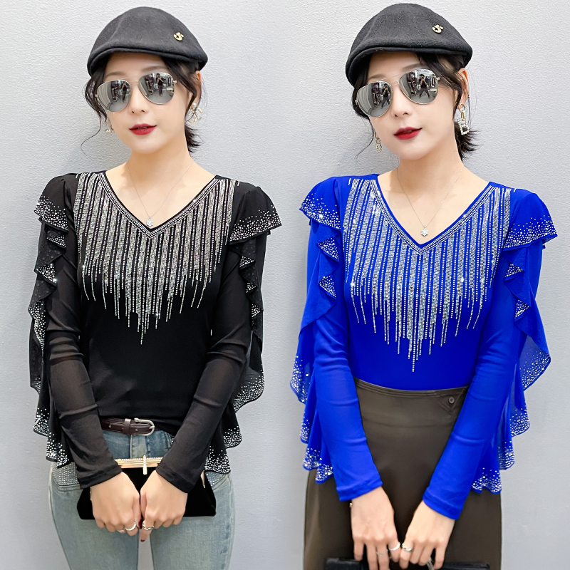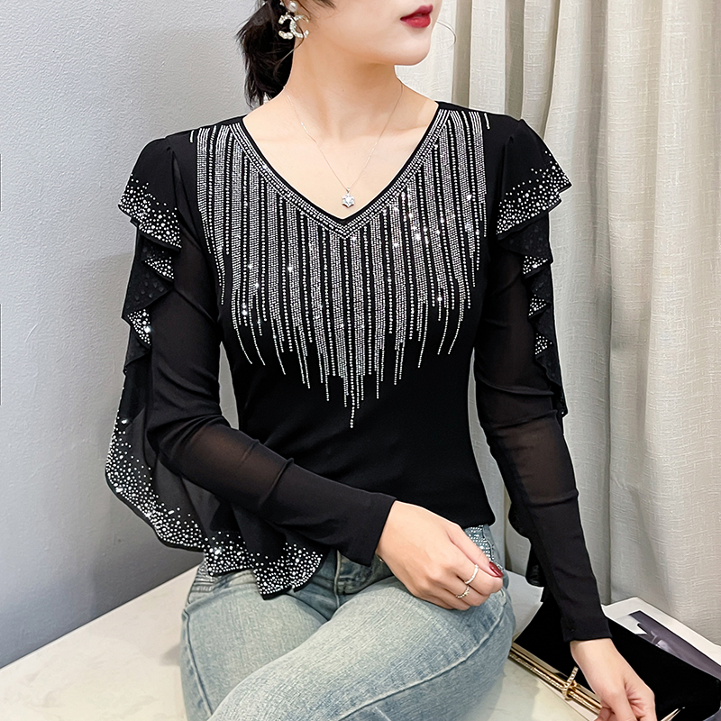FA55316# 欧洲站春上新V领花边镂空镶钻洋气修身显瘦打底衫女潮 服裝批發女裝批發服飾貨源